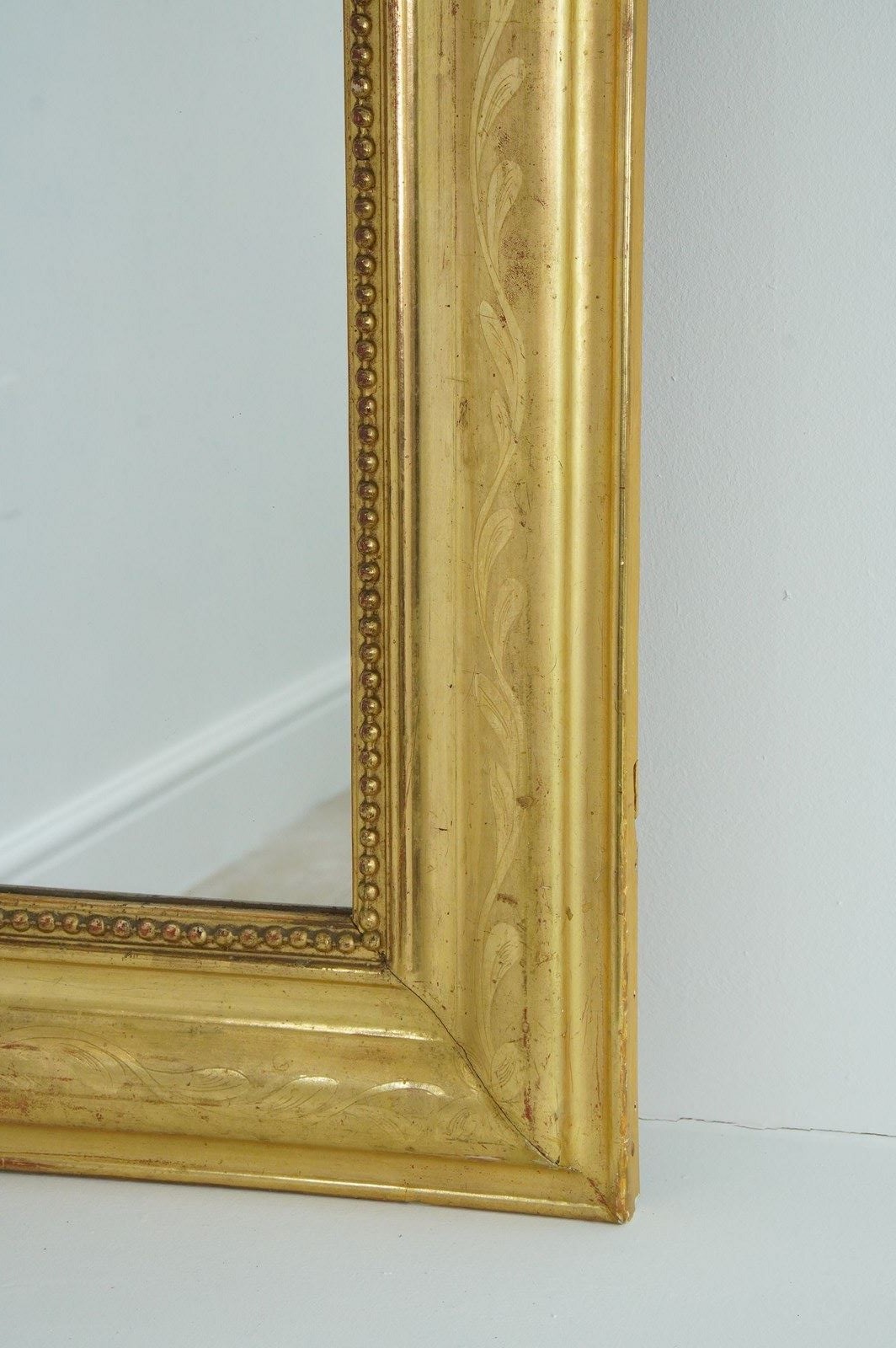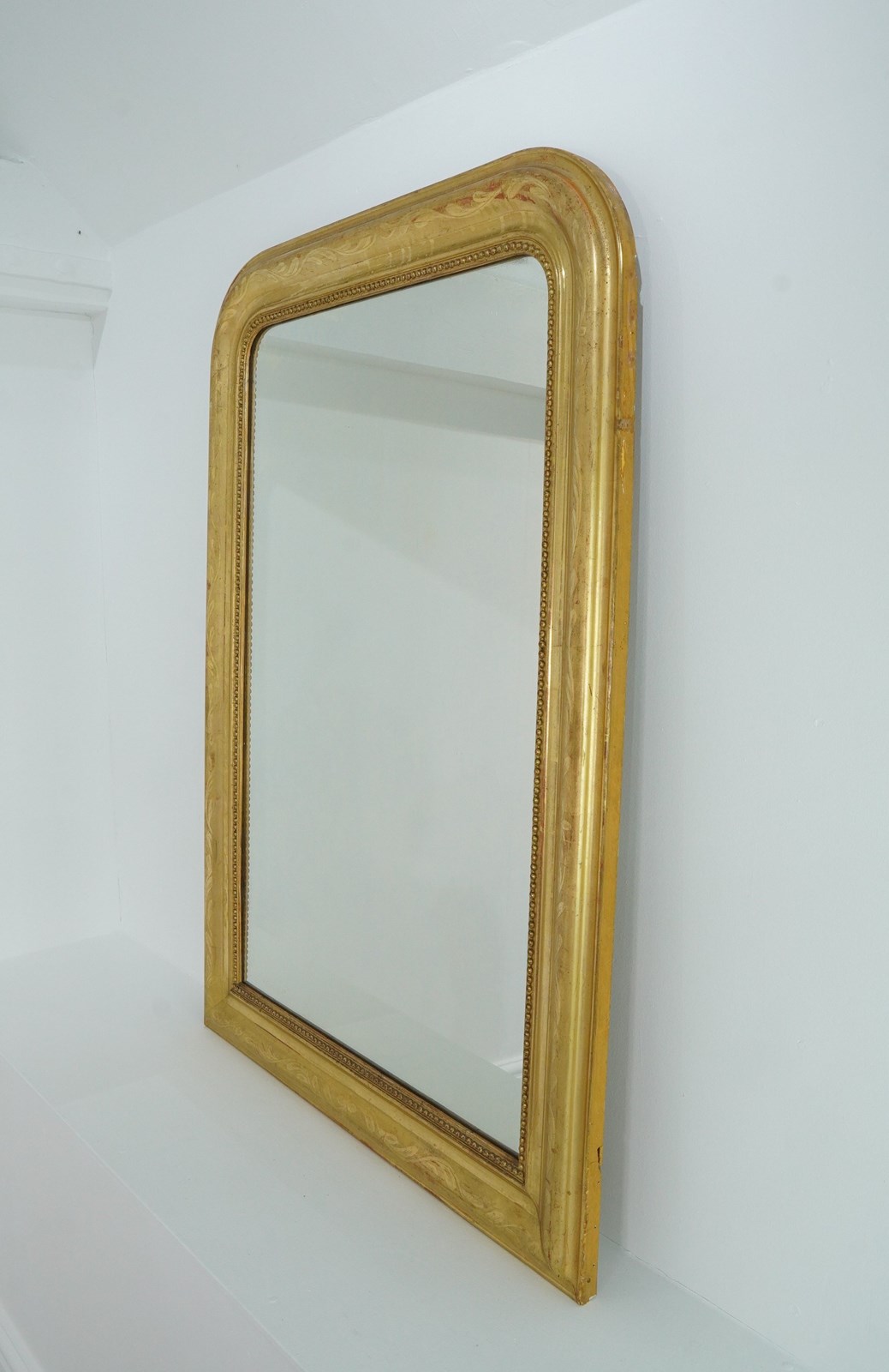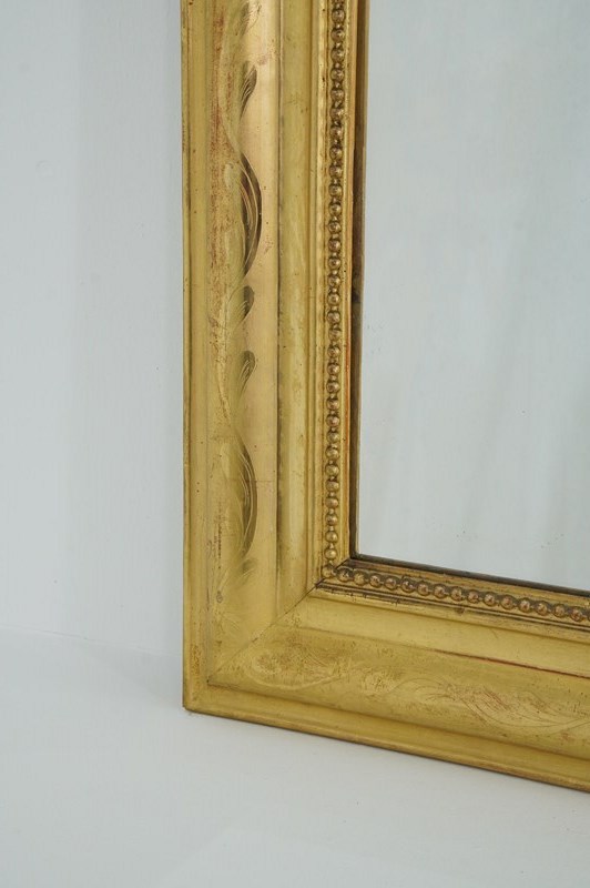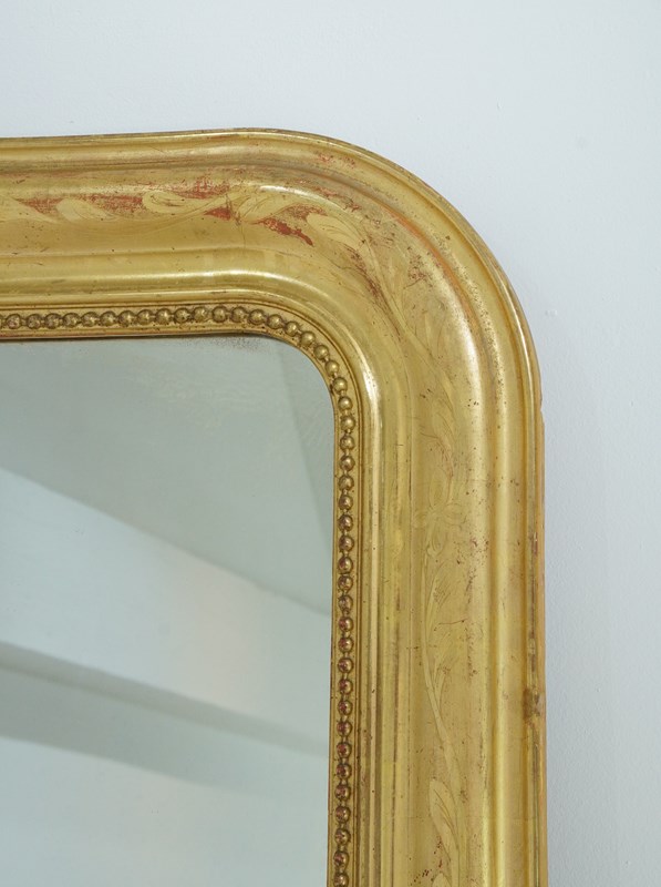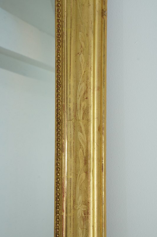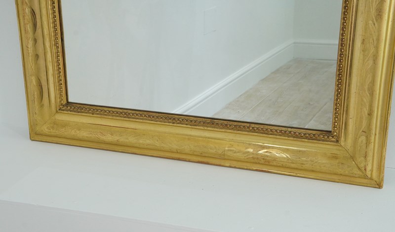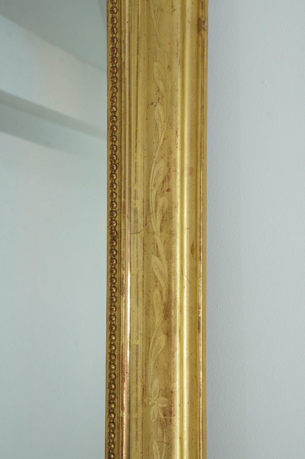 A 19th century French overmantle / wall mirror. A superb example of a mirror of this particular style. This exceptional mirror boasts the deepest original gilding with rich lustre. There is a tiny amount of wear revealing the pale bole basecoat beneath only adding to its desirable appearance. A neat design of entwining leaves etched into the surface decorate the wide mirror frame. The mirror frame holds the original glass plate which has remained in remarkable blemish free condition allowing perfect clarity. Louis Philippe overmantle /wall mirror.