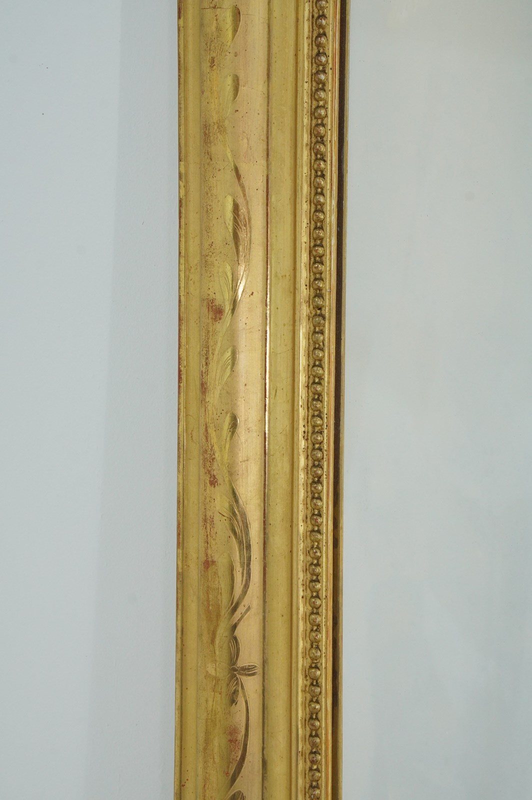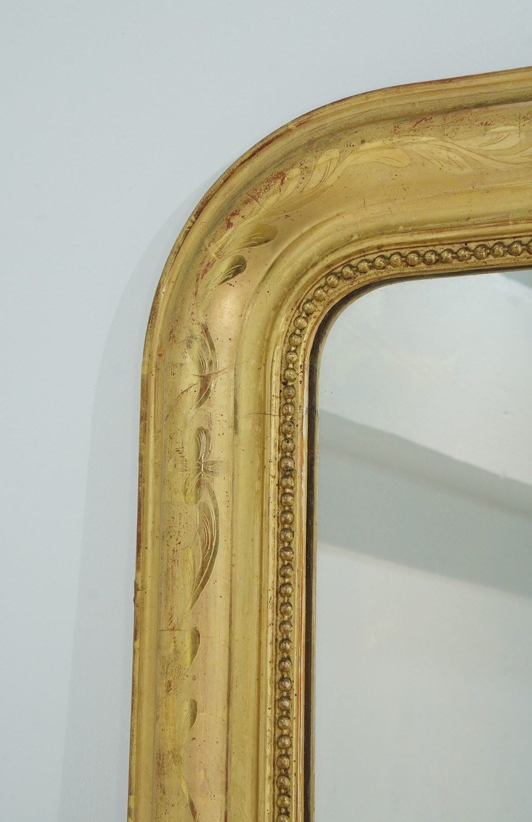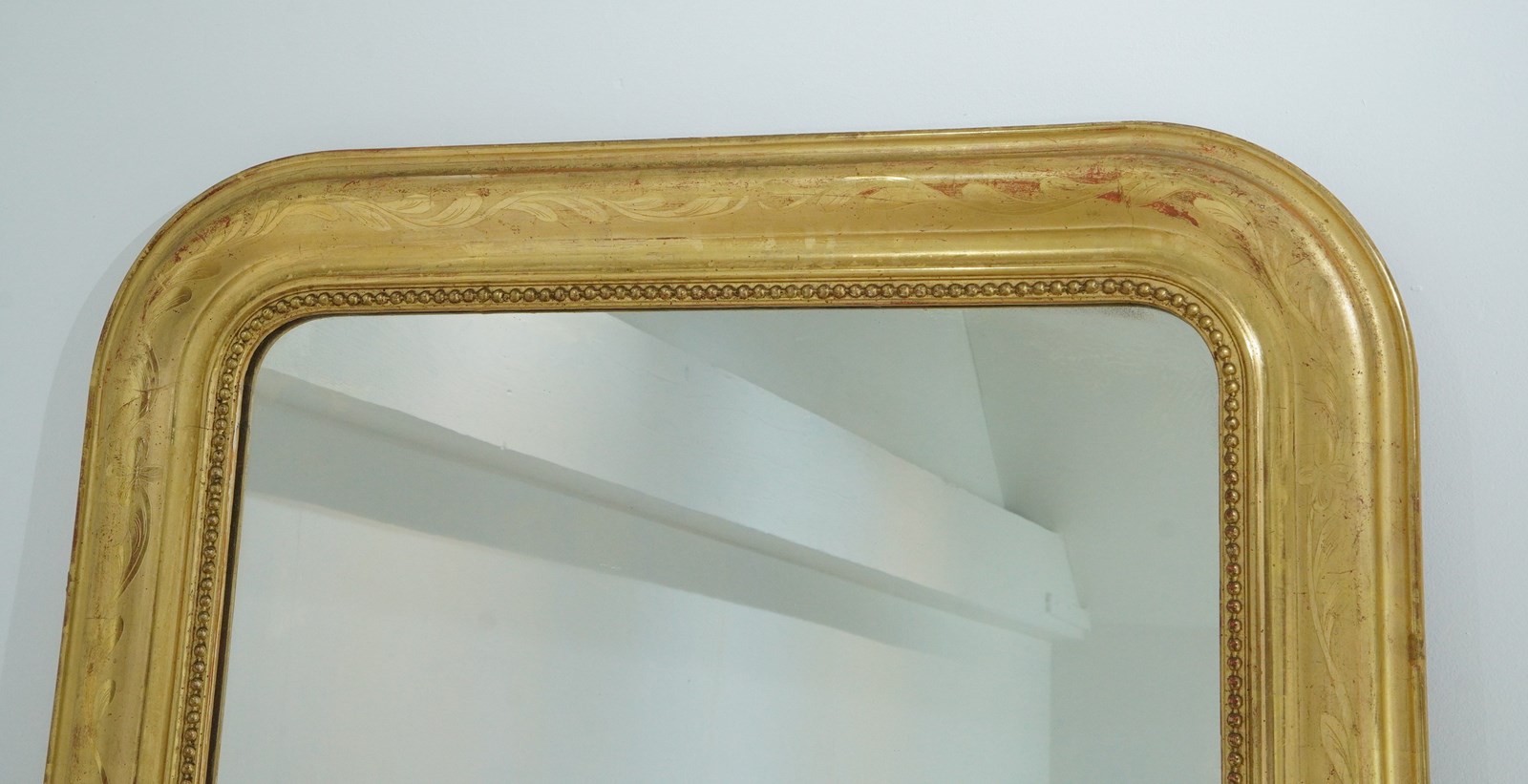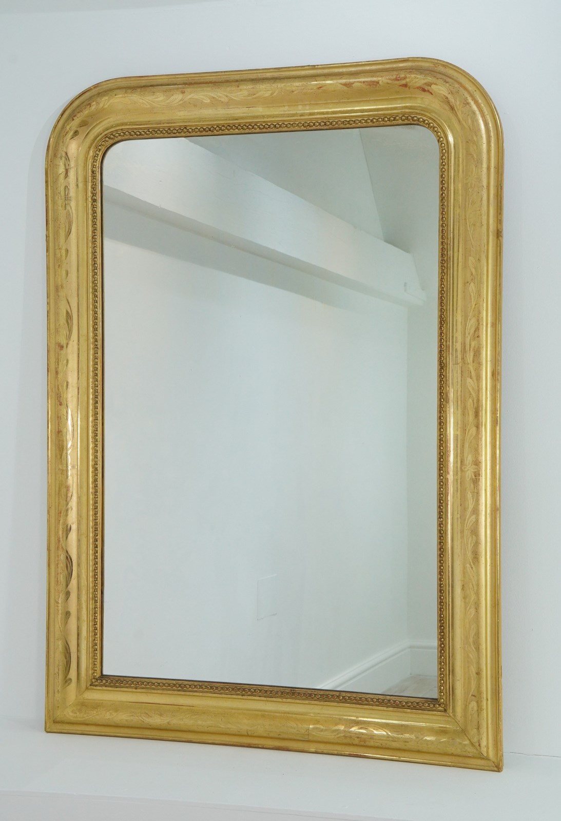 A 19th century French overmantle / wall mirror. A superb example of a mirror of this particular style. This exceptional mirror boasts the deepest original gilding with rich lustre. There is a tiny amount of wear revealing the pale bole basecoat beneath only adding to its desirable appearance. A neat design of entwining leaves etched into the surface decorate the wide mirror frame. The mirror frame holds the original glass plate which has remained in remarkable blemish free condition allowing perfect clarity. Louis Philippe overmantle /wall mirror.