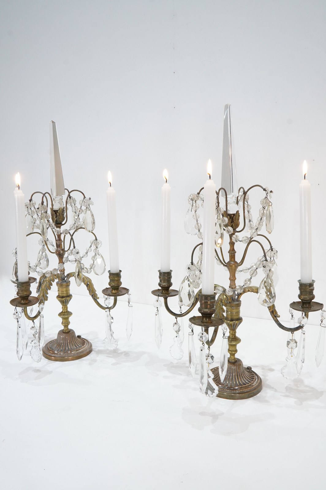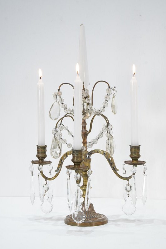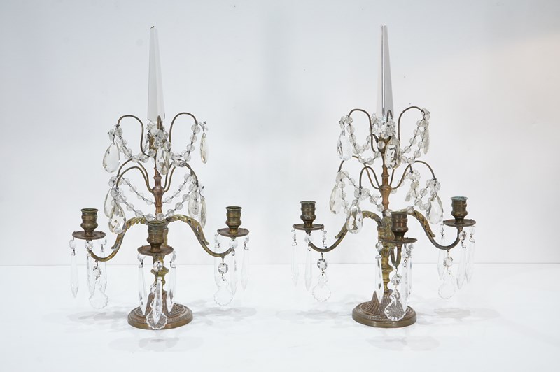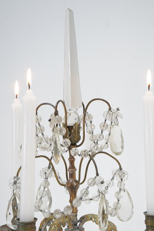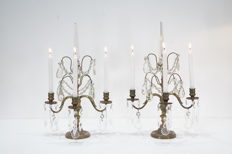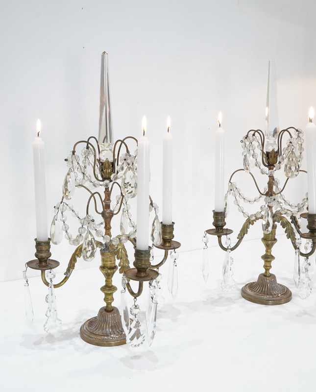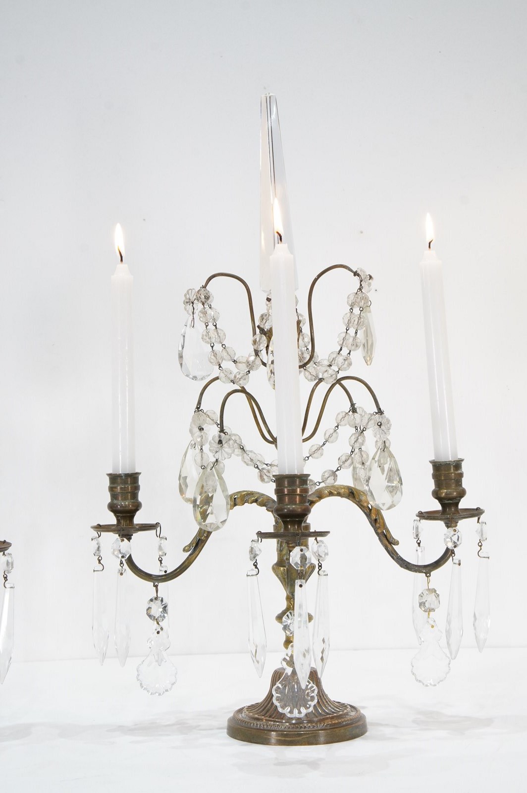A beautifully decorative pair of late 19th century three branch candle holders. Three outstretched acanthus leaf branches terminating with three deep candle holders and drip pans all below two tiers of beaded swags and faceted lozenges, each one surmounted with a large glass finial. The backs to these pretty Girandoles are designed to be flat allowing them to sit neatly on the mantle shelf or side table but would look equally stunning placed on the dining table for candlelit dining. For use with candles only.
