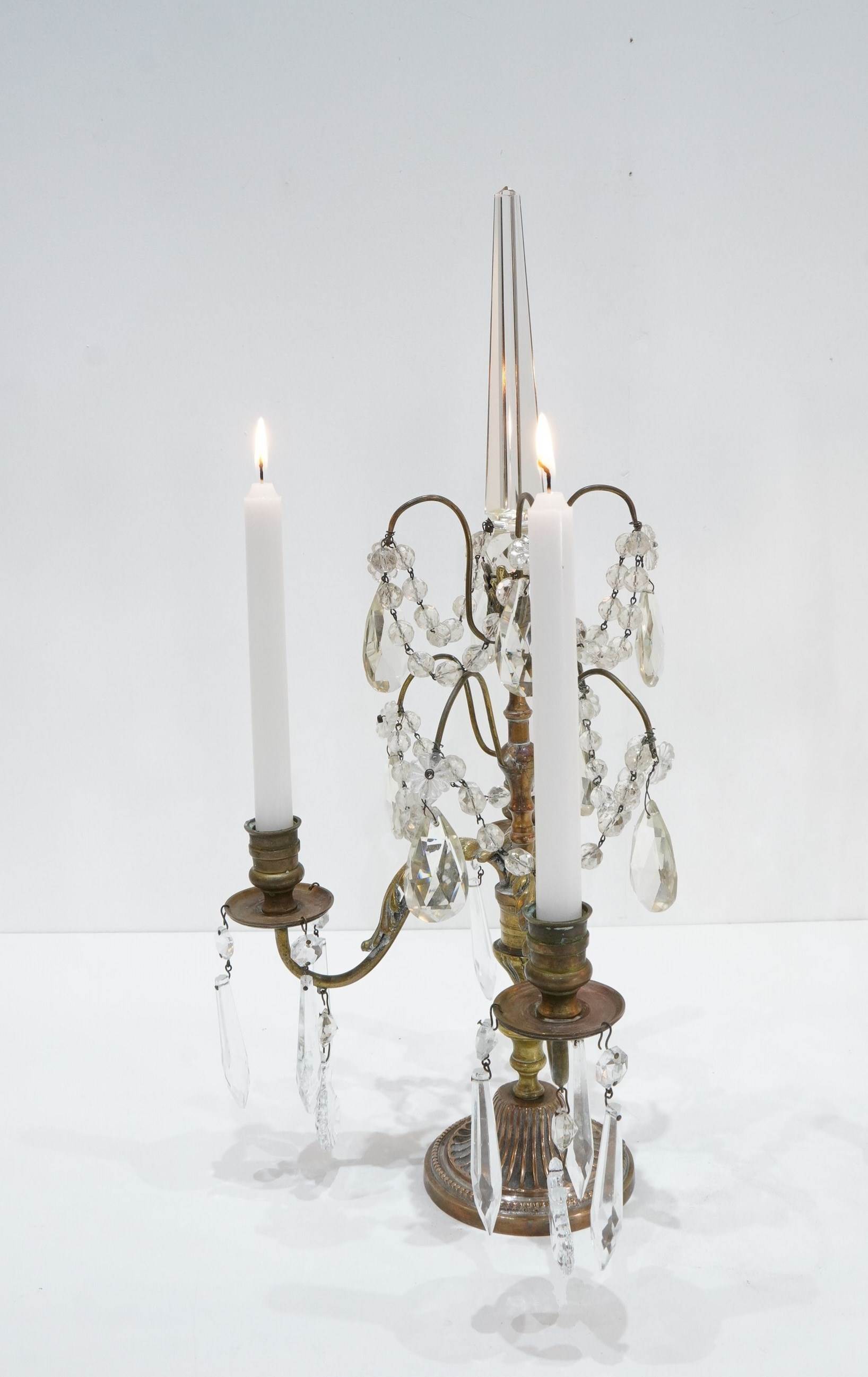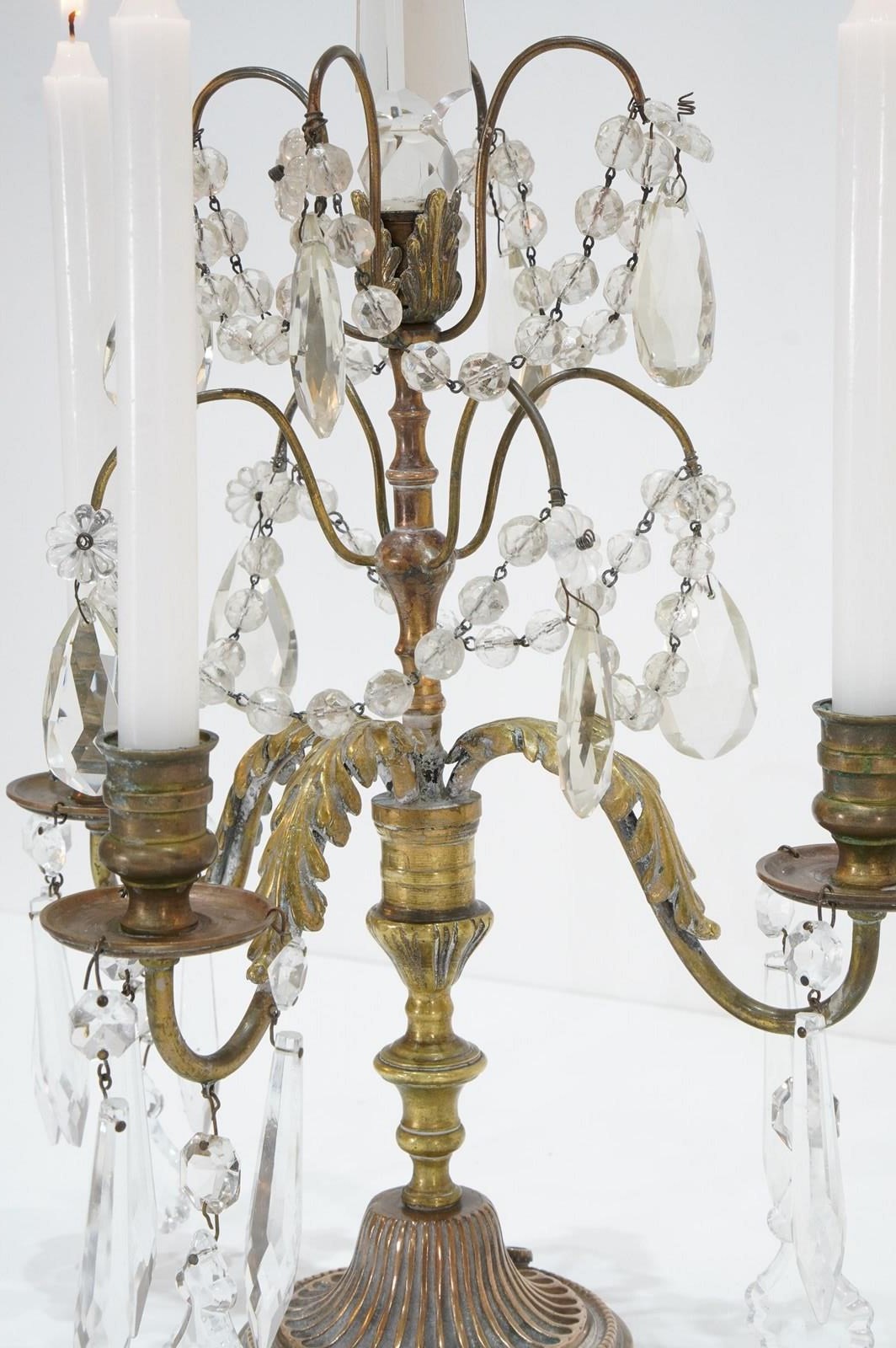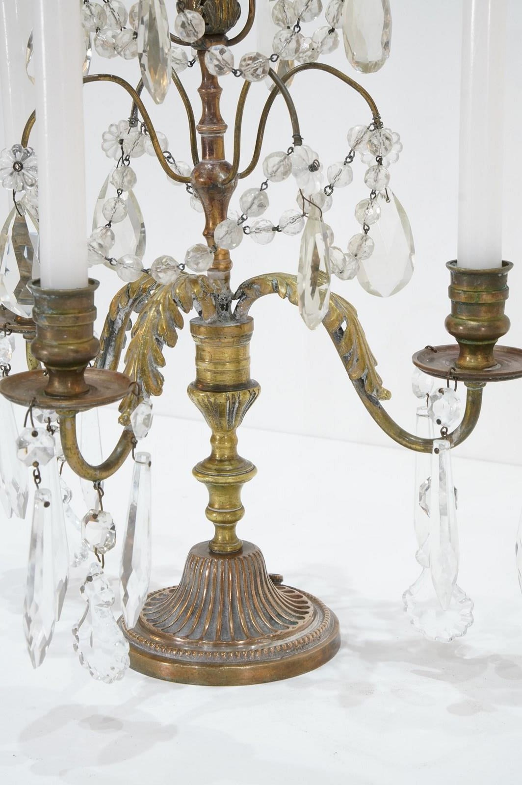 A beautifully decorative pair of late 19th century three branch candle holders. Three outstretched acanthus leaf branches terminating with three deep candle holders and drip pans all below two tiers of beaded swags and faceted lozenges, each one surmounted with a large glass finial. The backs to these pretty Girandoles are designed to be flat allowing them to sit neatly on the mantle shelf or side table but would look equally stunning placed on the dining table for candlelit dining. For use with candles only.
