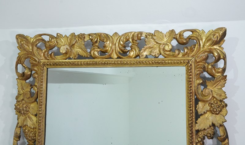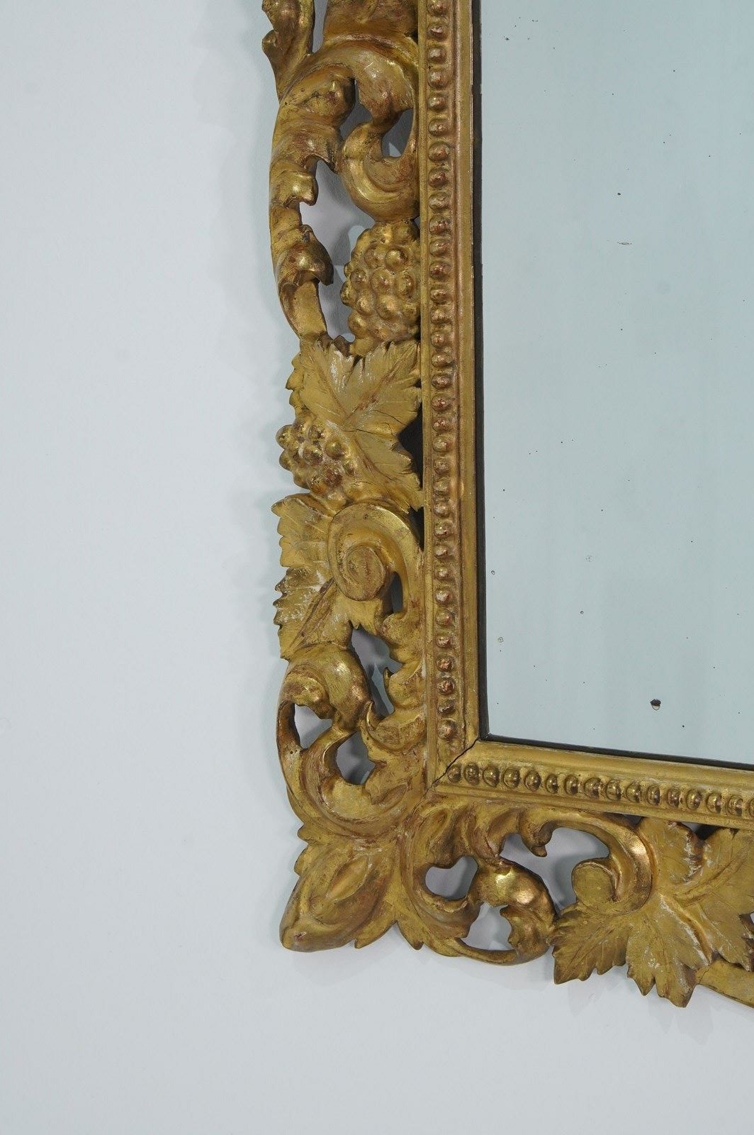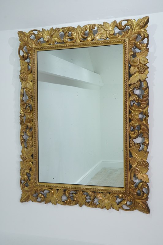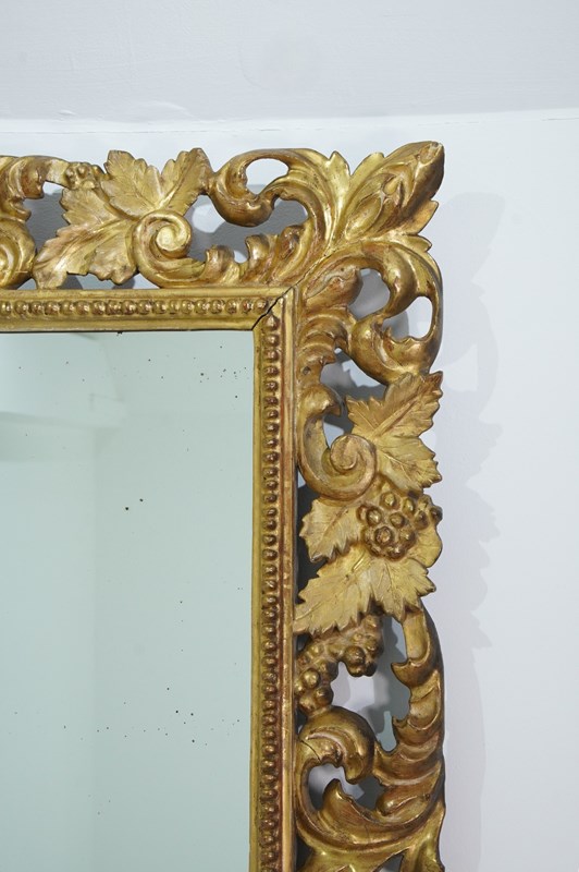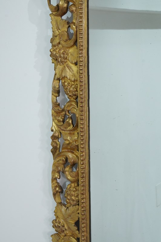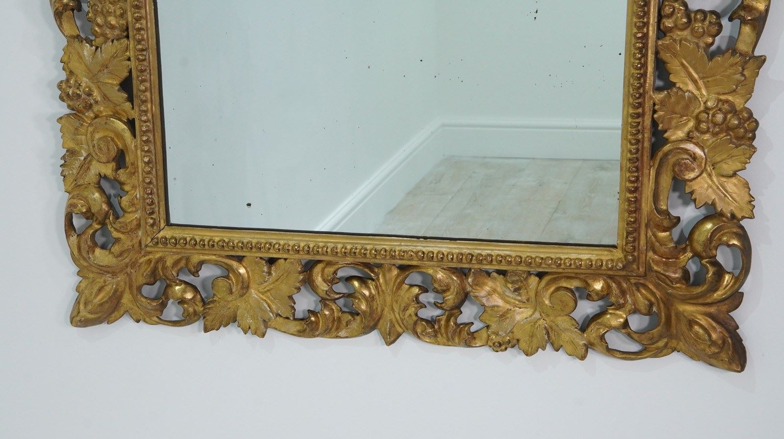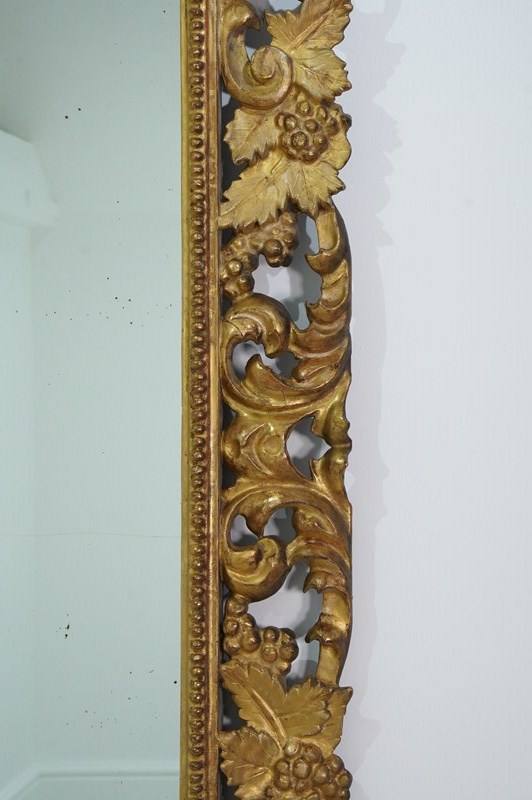 A mid 19th century carved wood wall mirror decorated with entwining vine leaves interspersed with carved wood grapes on the vine. Beautifully gilded with some historical surface wear revealing small areas of the warm reddish basecoat. Superb structure to the intricate frame with no weaknesses. The glass plate is in good original condition with only one or two minor blemishes. May be hung either landscape or portrait. Later backboard. Carved wood mirror circa 1860.