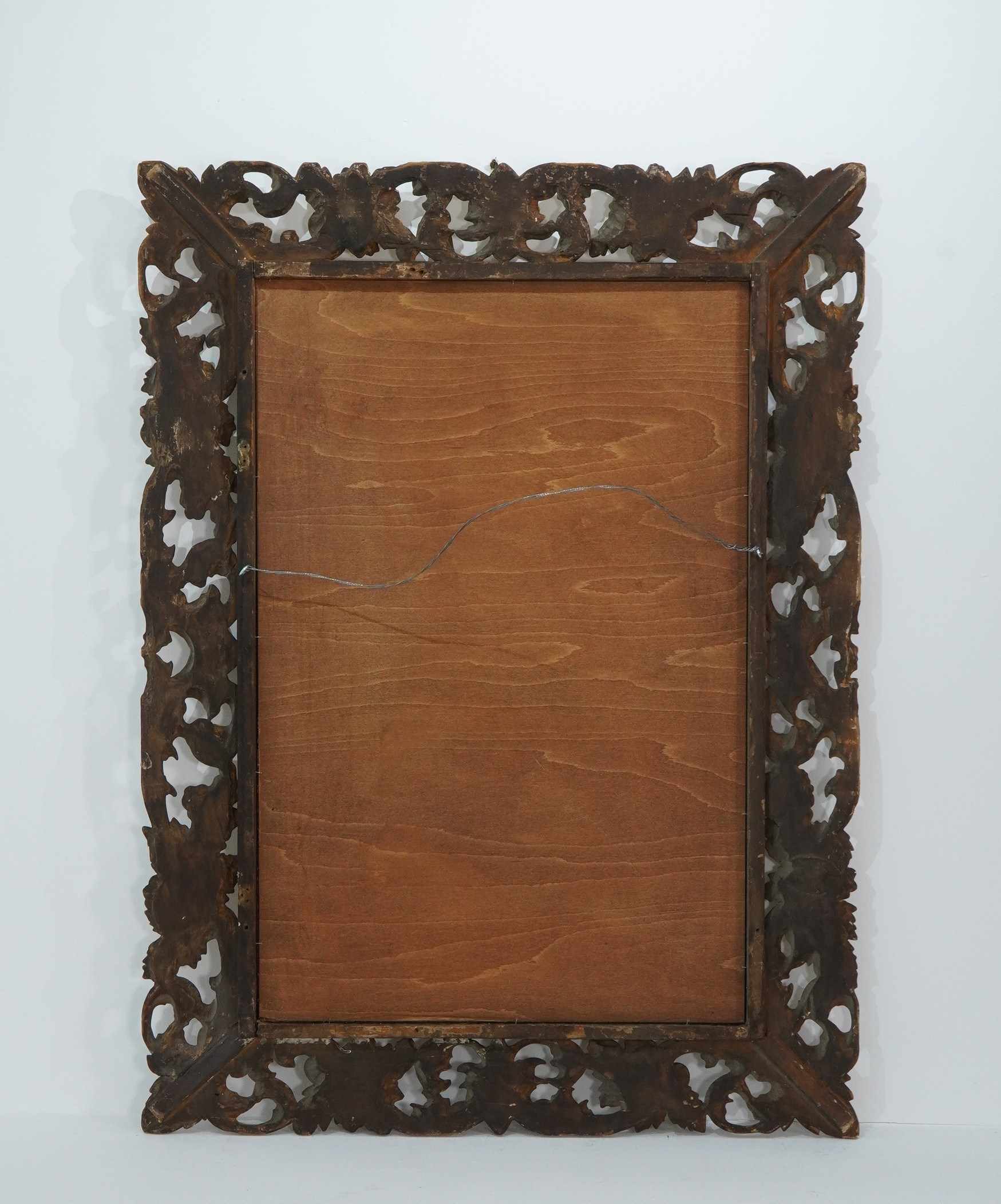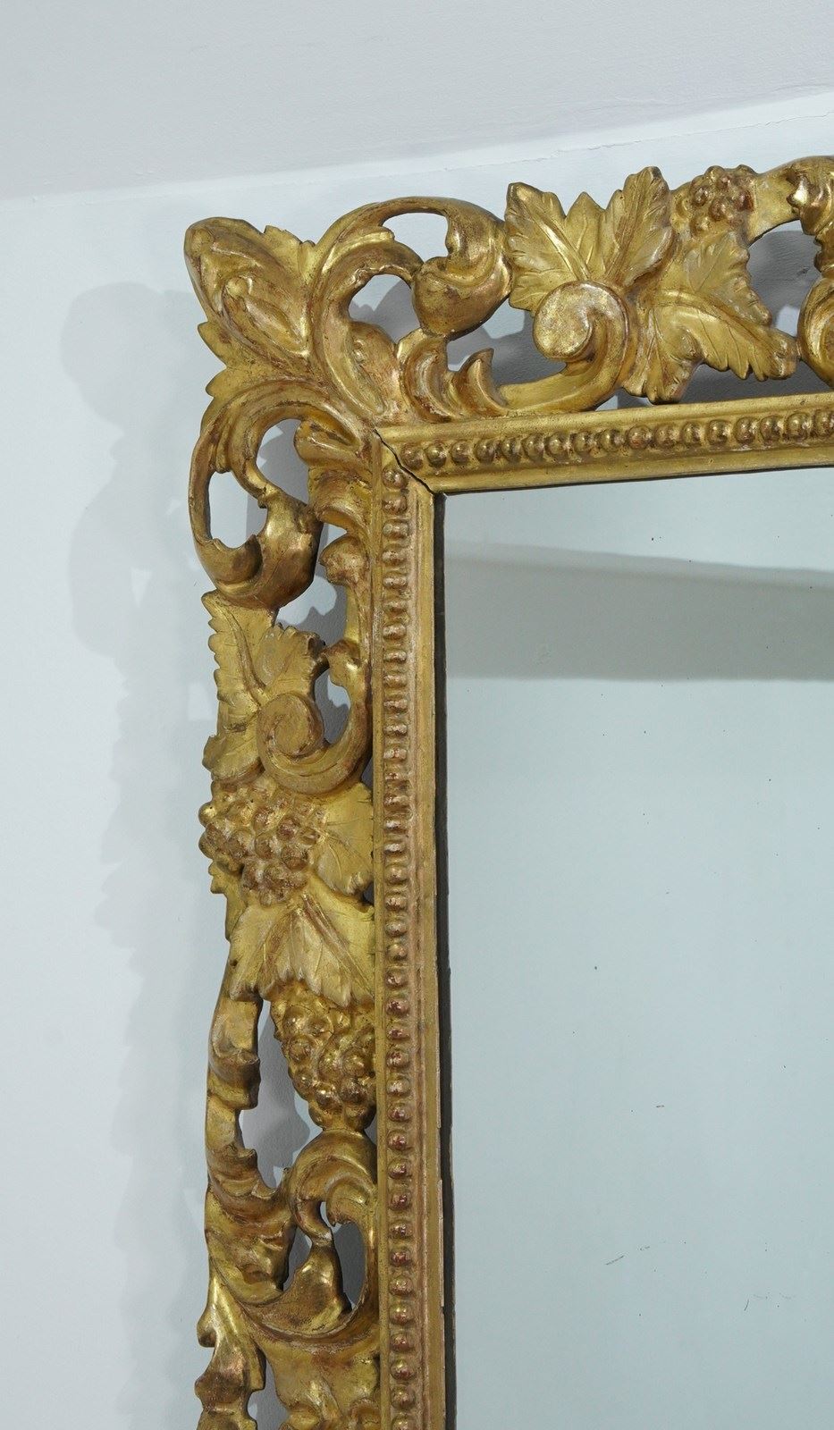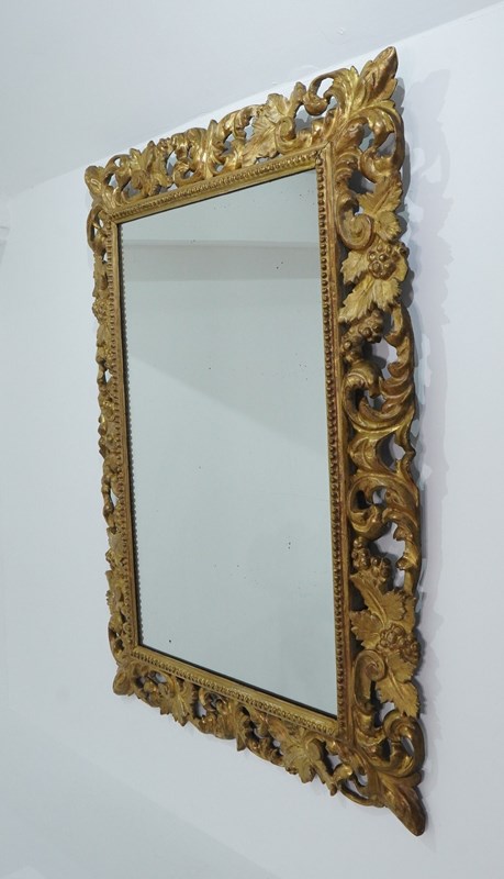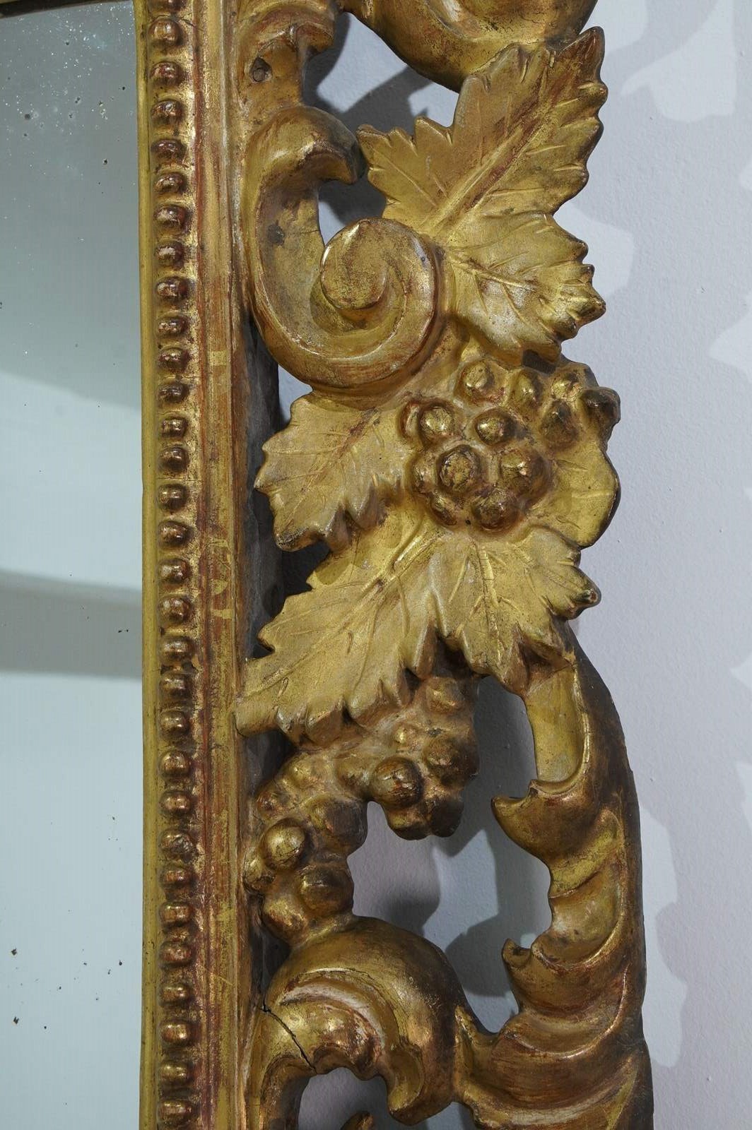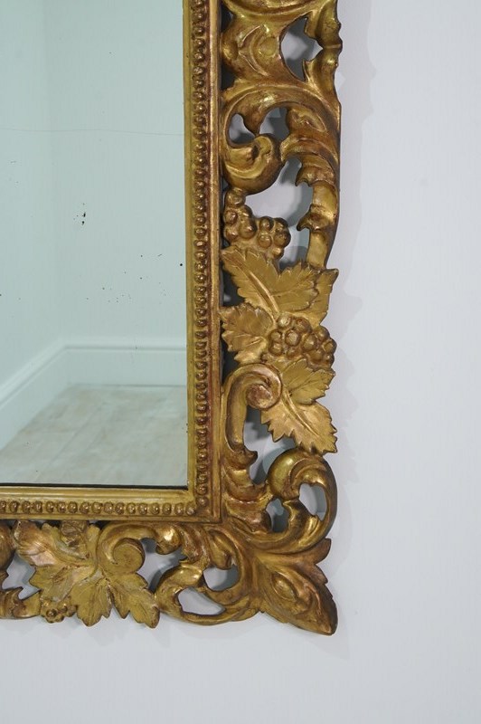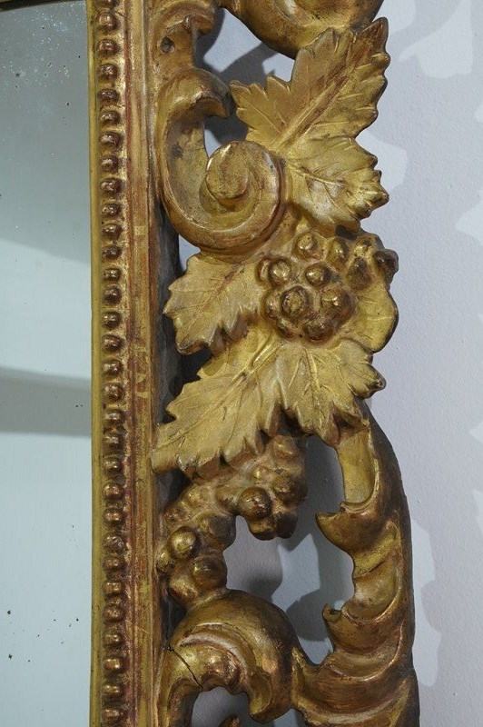 A mid 19th century carved wood wall mirror decorated with entwining vine leaves interspersed with carved wood grapes on the vine. Beautifully gilded with some historical surface wear revealing small areas of the warm reddish basecoat. Superb structure to the intricate frame with no weaknesses. The glass plate is in good original condition with only one or two minor blemishes. May be hung either landscape or portrait. Later backboard. Carved wood mirror circa 1860.