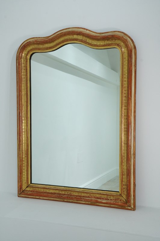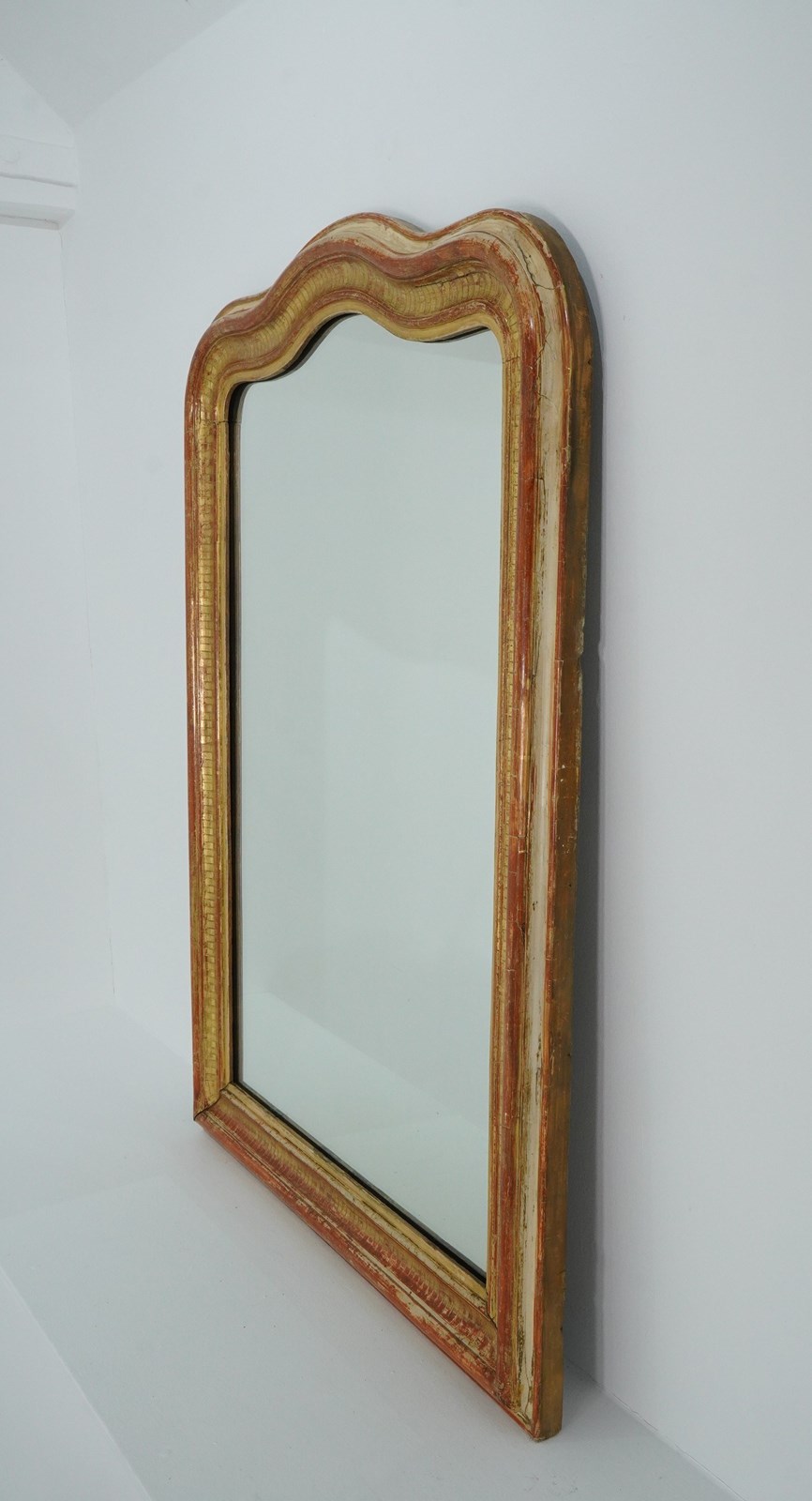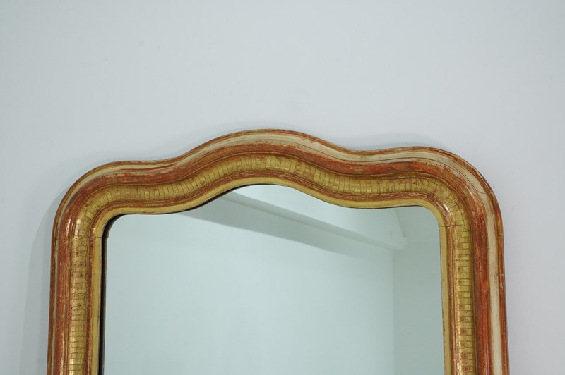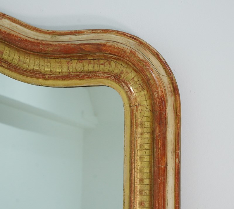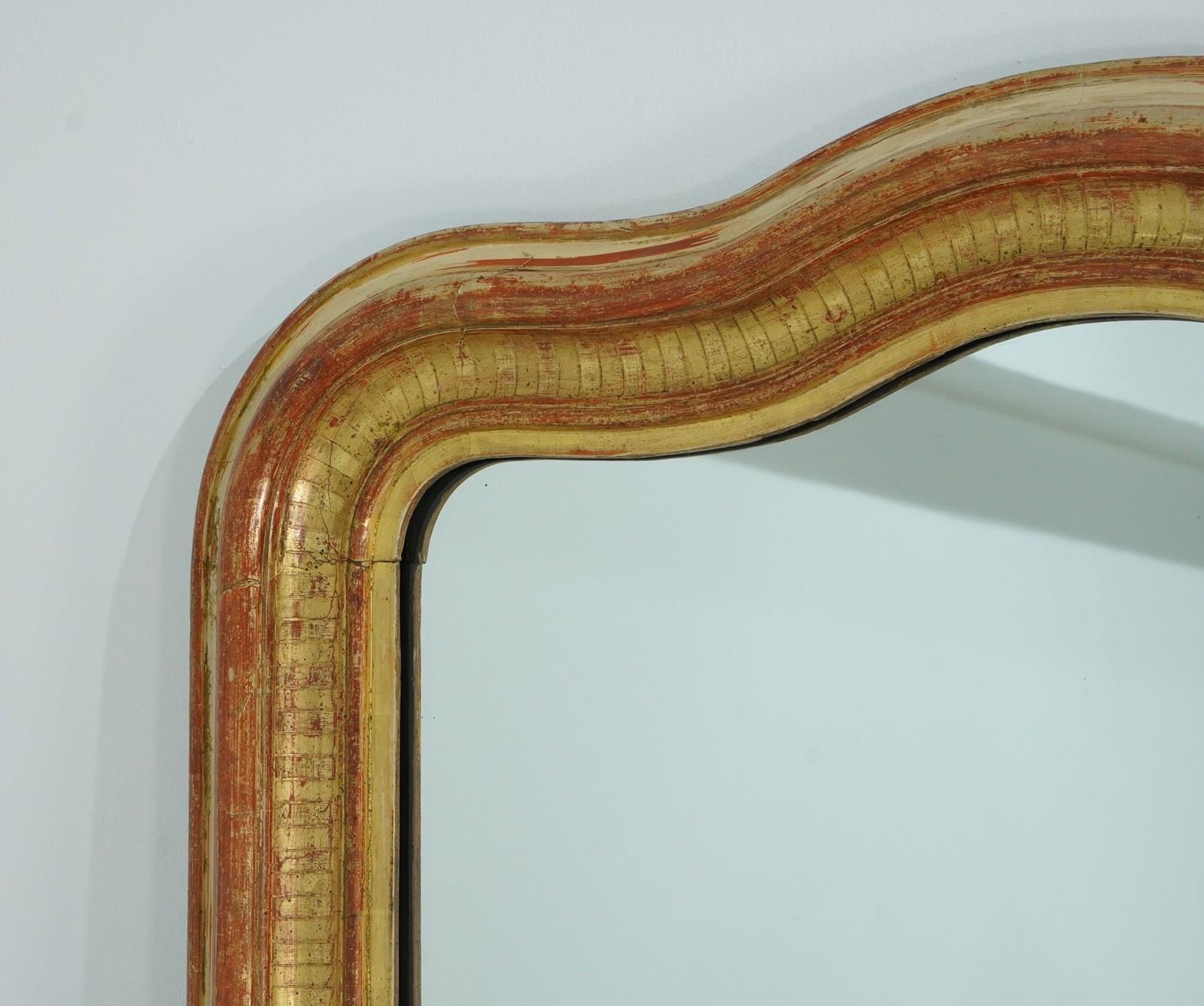An early 19th century French wall mirror. The serpentine shaped frame to this charismatic mirror would have originally been completely gilded but the gilding has rubbed and faded a little in places over the past century and more revealing an atmospheric palette of rich warm cream and terracotta. There are minor dints to frame only adding to its history and charm. The centre moulding is decorated with a wide band of gilded stripes against a terracotta background. Good original mirror plate. Original back boards.