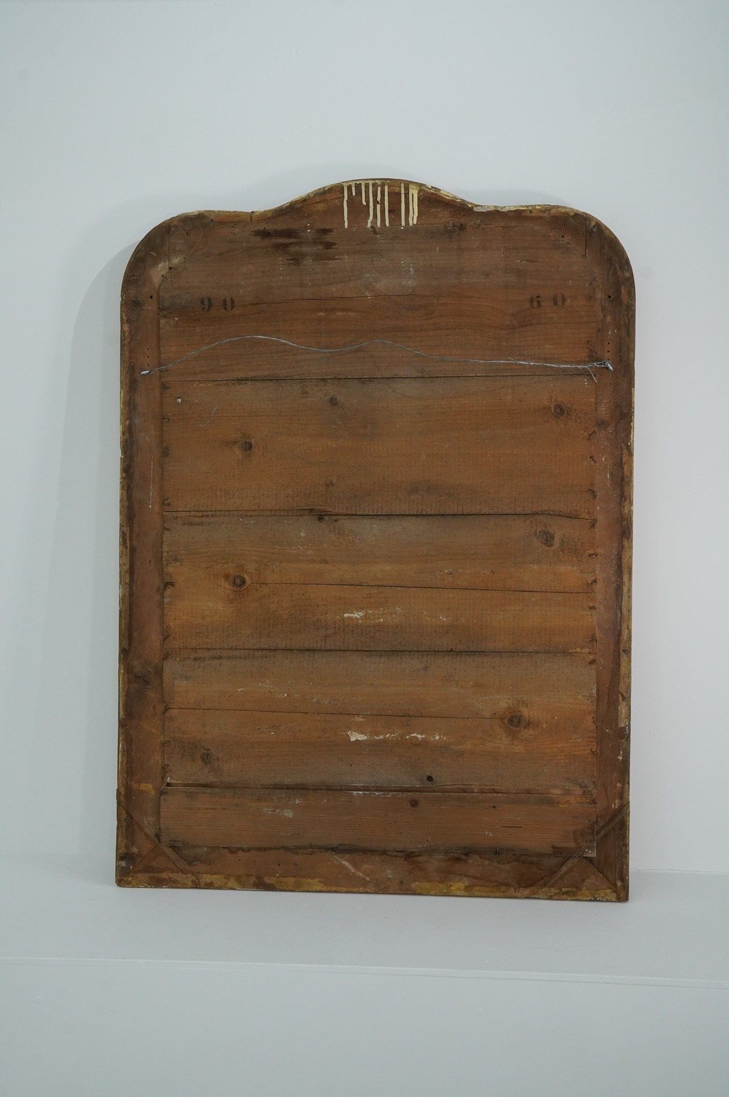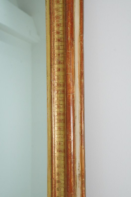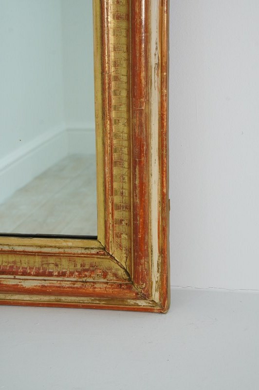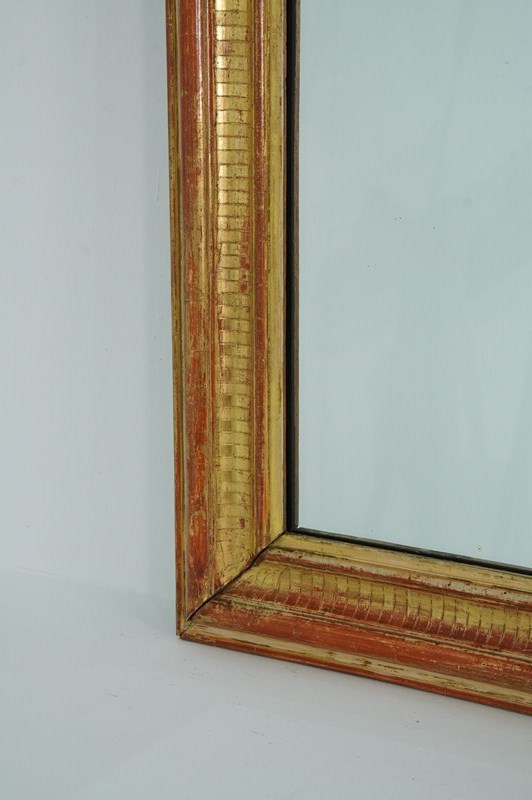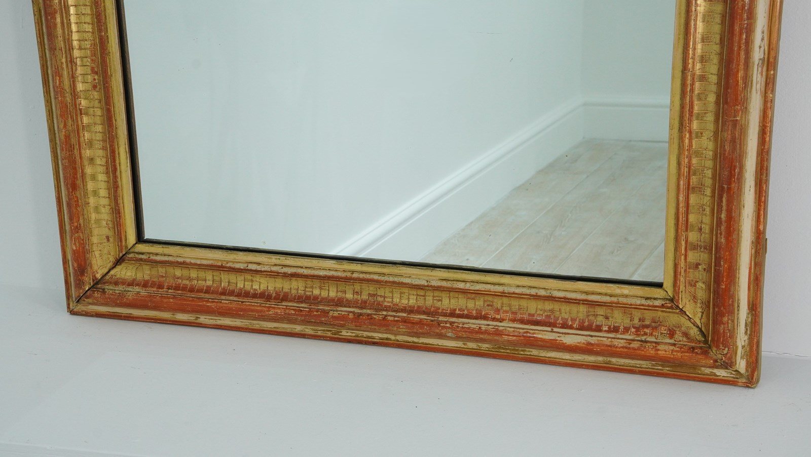 An early 19th century French wall mirror. The serpentine shaped frame to this charismatic mirror would have originally been completely gilded but the gilding has rubbed and faded a little in places over the past century and more revealing an atmospheric palette of rich warm cream and terracotta. There are minor dints to frame only adding to its history and charm. The centre moulding is decorated with a wide band of gilded stripes against a terracotta background. Good original mirror plate. Original back boards.