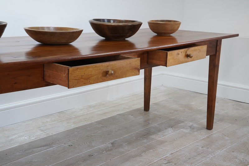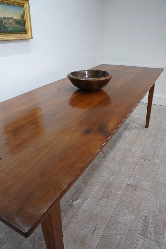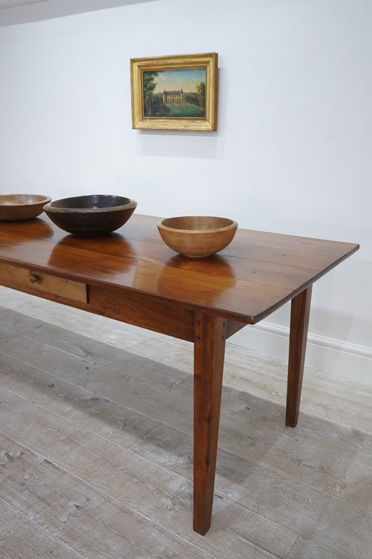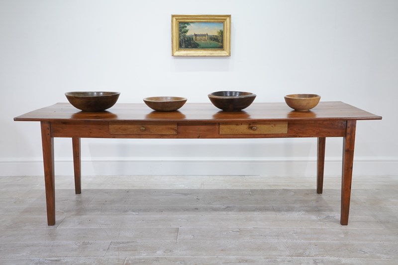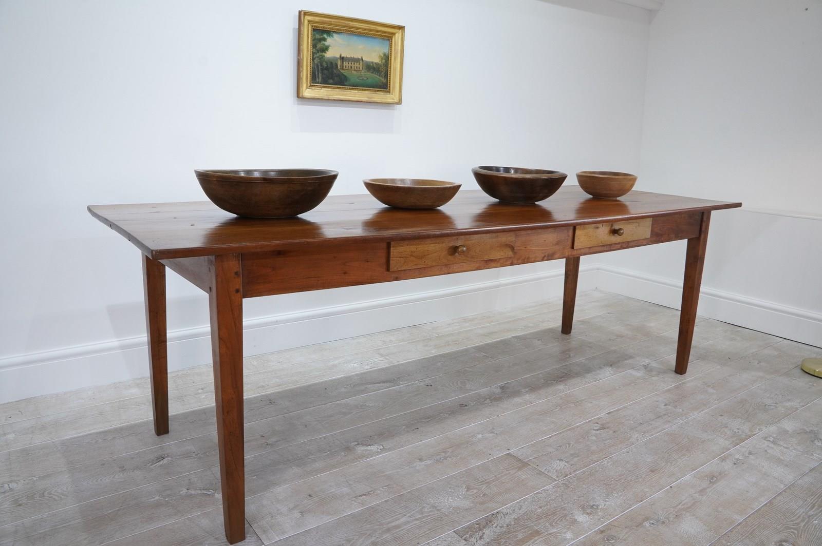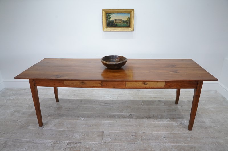 A 19th century French cherrywood dining table. The proportions to this fabulous table are such that it will comfortably seat 10/12 people. The long solid cherrywood top consists of four beautiful seasoned timbers which have developed the most gorgeous colour and rich patina over the past century and more. There are two useful drawers set within the apron below. The table is structurally sound and sturdy standing on four square tapering cherrywood legs. Cleaned and polished ready for placing in the home. French fruitwood dining table circa 1870.