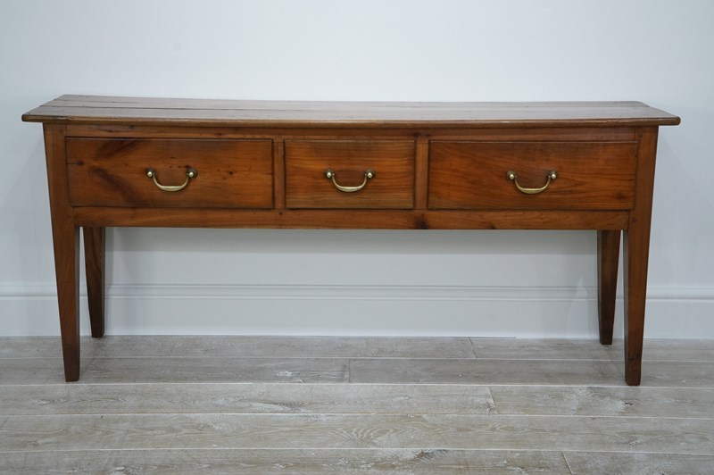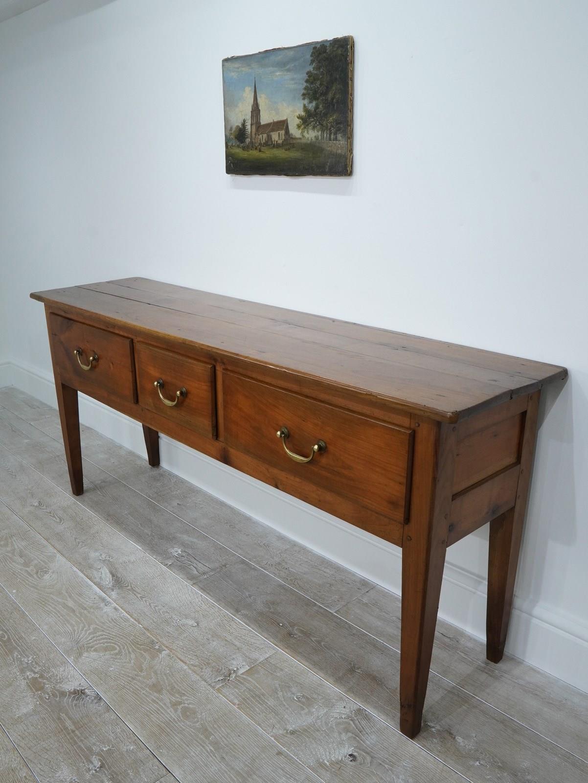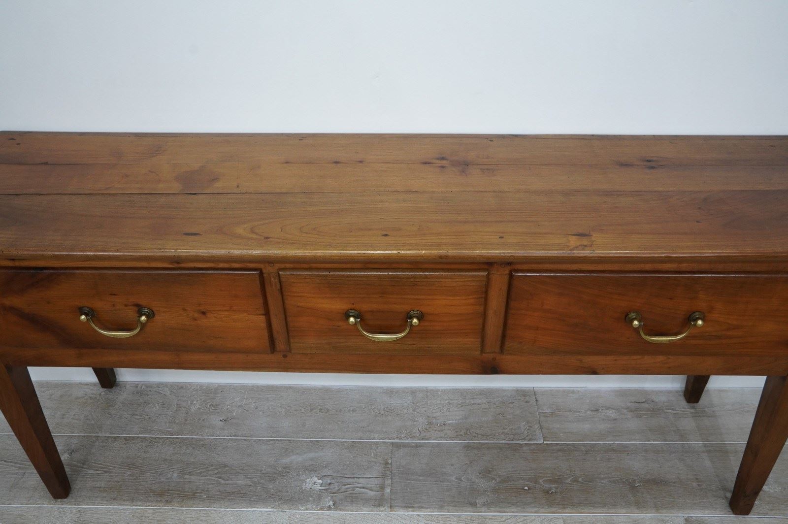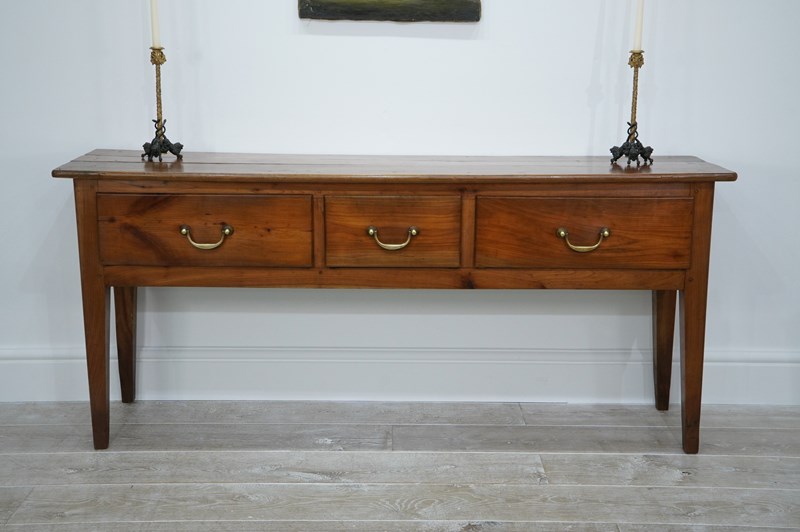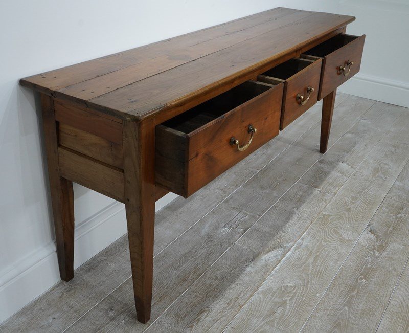Another fabulous French fruitwood server. Originally slightly deeper in scale now reduced a little in depth making it easier to accommodate within the home. The simple lines to this handsome piece make it perfectly suitable to blend with the period or contemporary style. The three deep drawers still boast their original heavy quality drop handles. The solid cherrywood timbers to the server top have slightly rounded corners and have seasoned to the most beautiful golden colour over the past century gathering a richly polished surface along the way. Standing on four solid cherrywood square tapering legs.