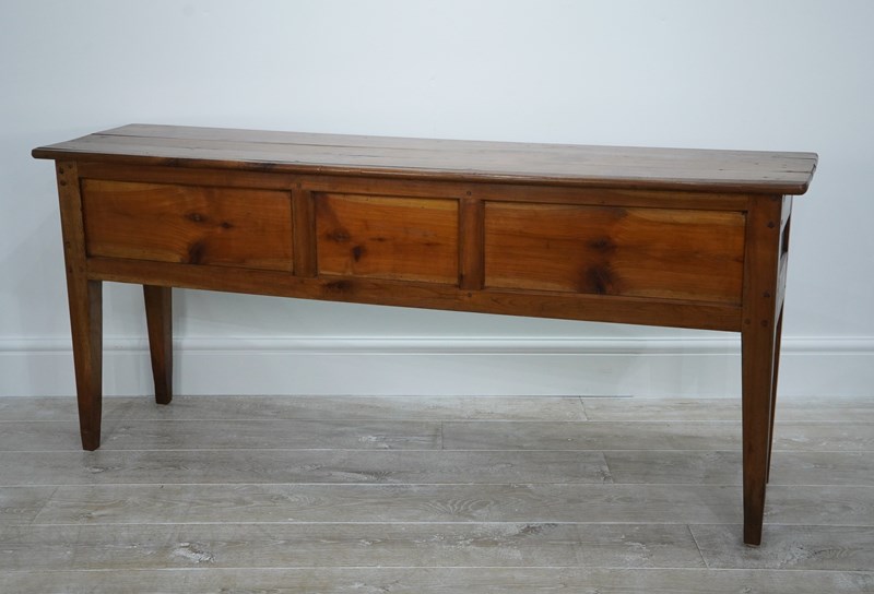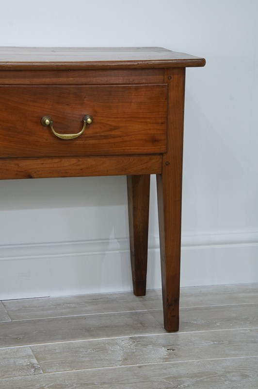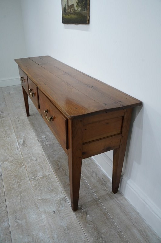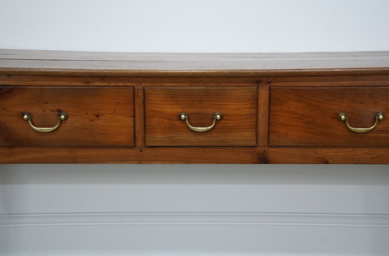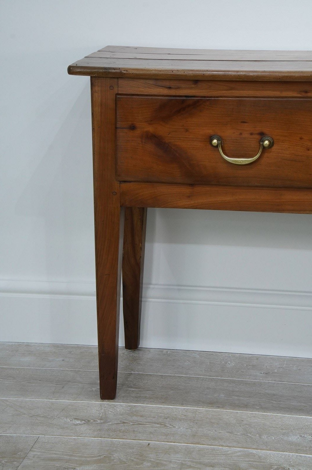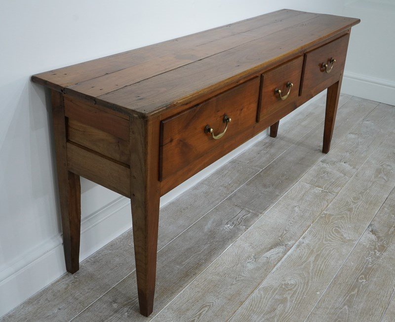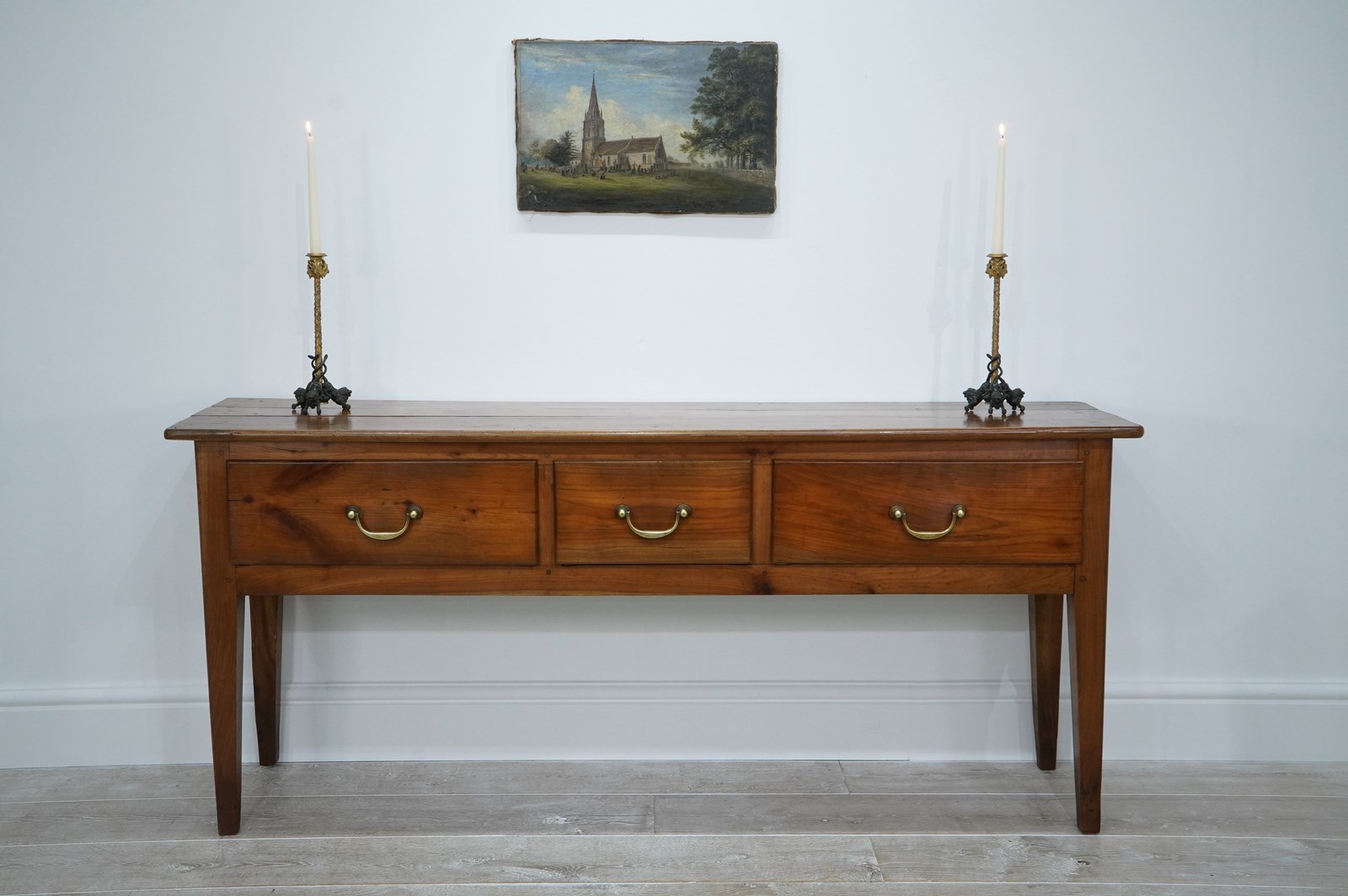 Another fabulous French fruitwood server. Originally slightly deeper in scale now reduced a little in depth making it easier to accommodate within the home. The simple lines to this handsome piece make it perfectly suitable to blend with the period or contemporary style. The three deep drawers still boast their original heavy quality drop handles. The solid cherrywood timbers to the server top have slightly rounded corners and have seasoned to the most beautiful golden colour over the past century gathering a richly polished surface along the way. Standing on four solid cherrywood square tapering legs.