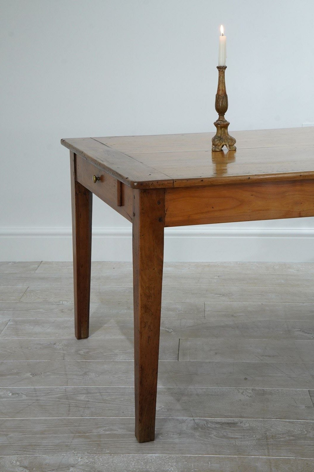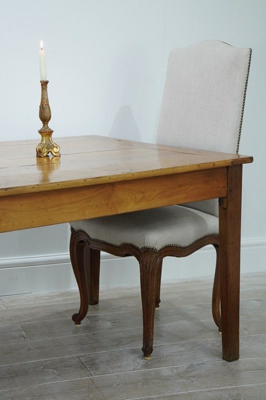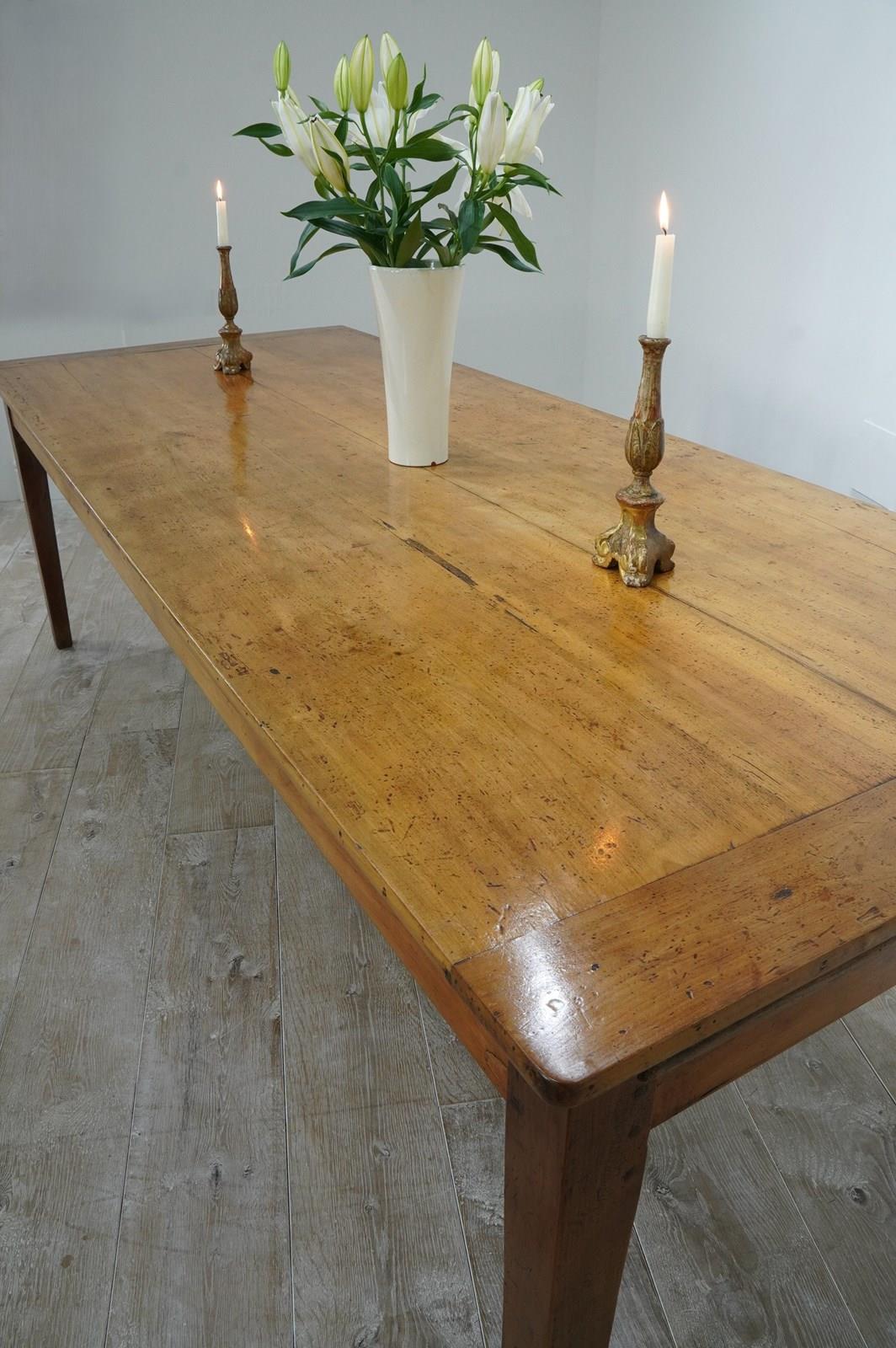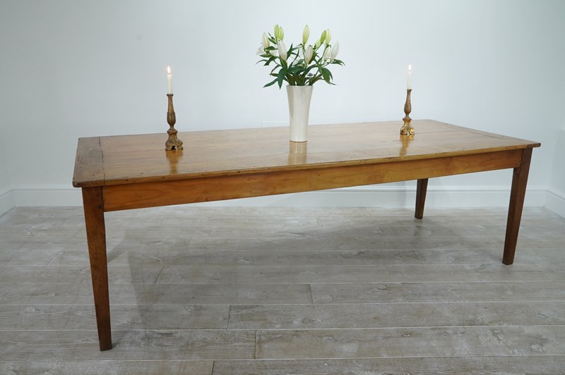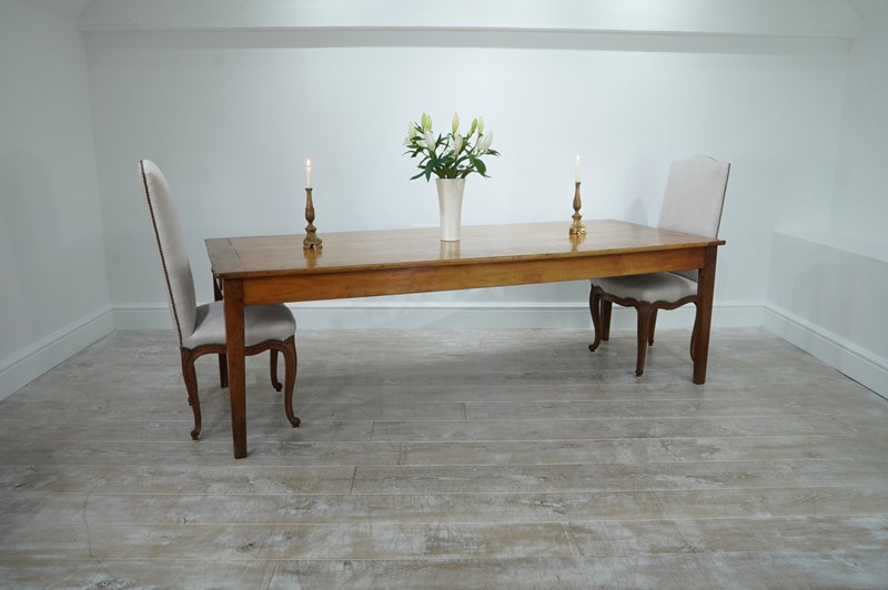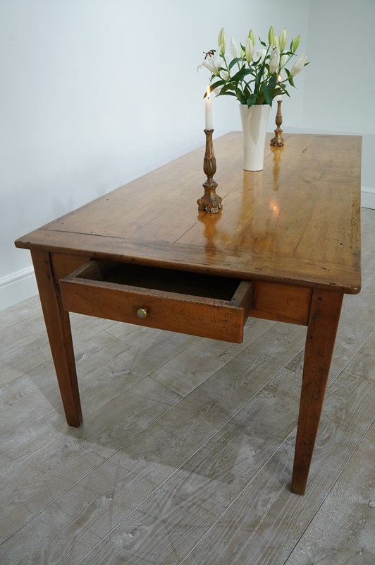 A larger scale French fruitwood dining table traditionally assembled in the mid 19th century. The wide top to this magnificent table consists of five tightly closed cherrywood timbers with no gaps ensuring a perfectly stable flat surface. A wide single drawer is housed within the apron below to one end with the bonus of a useful bread slide extension to the other. The table stands upon four slightly tapering cherrywood legs displaying the perfect unaltered height. Gorgeous colour with a richly patinated surface. French farmhouse dining table circa 1850.