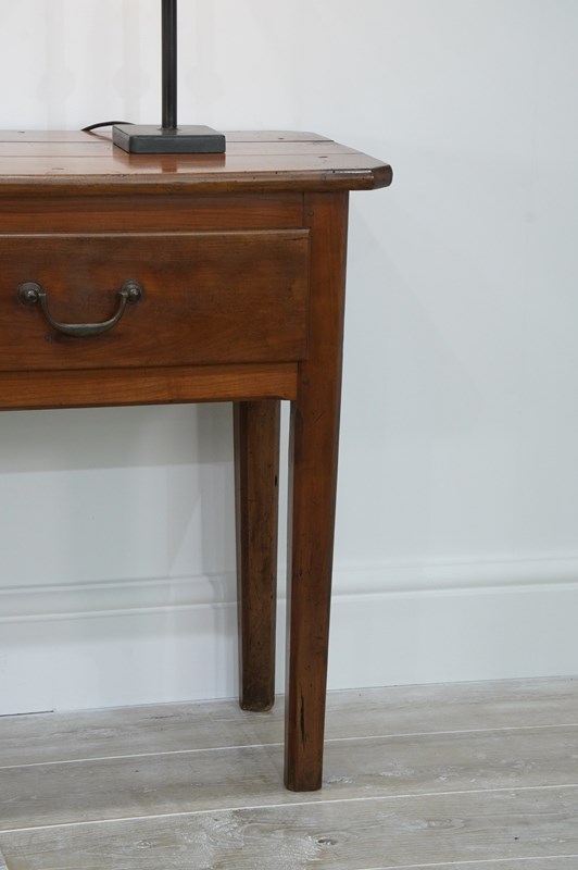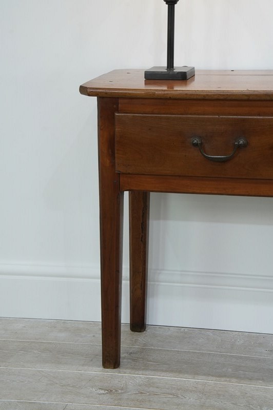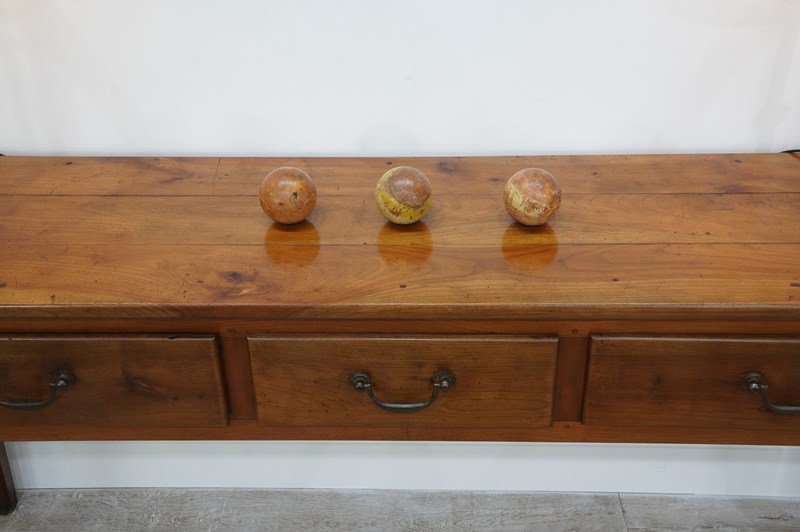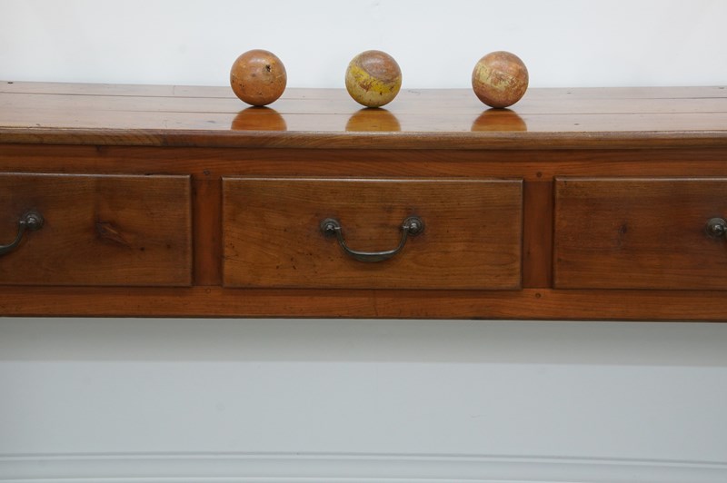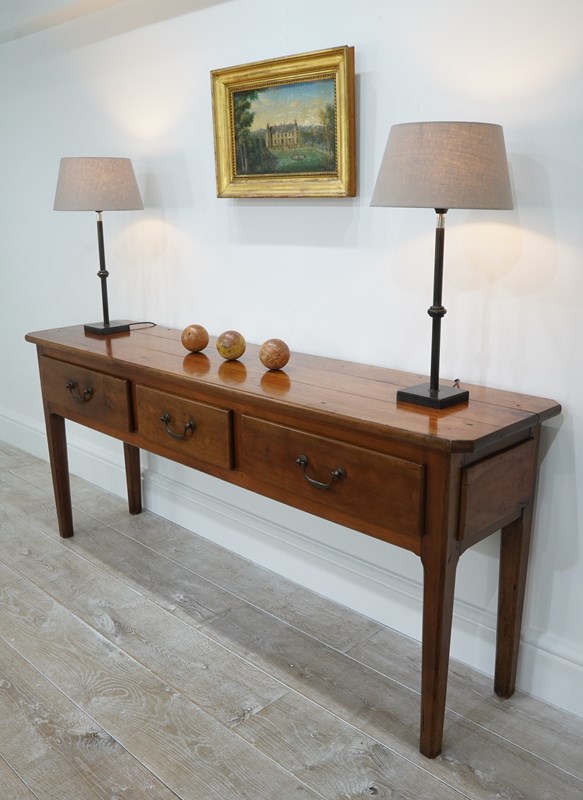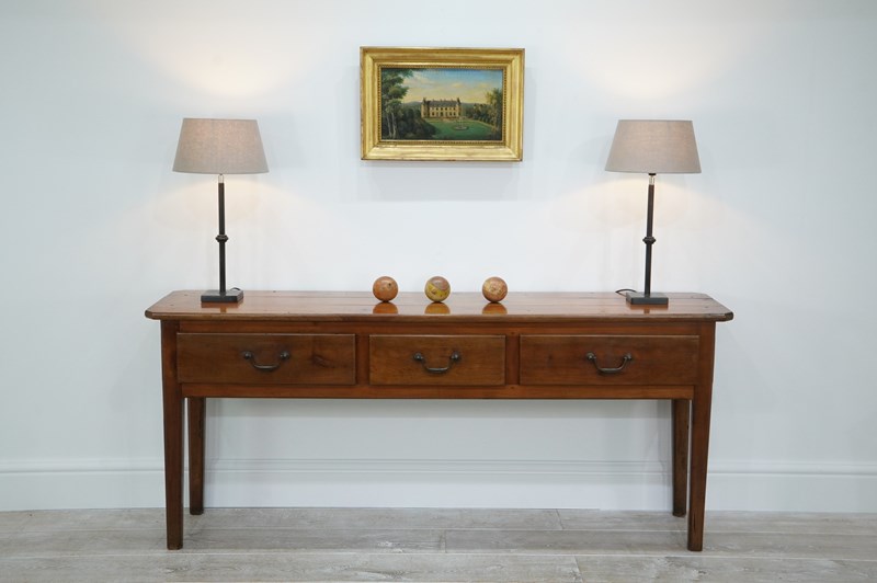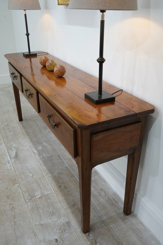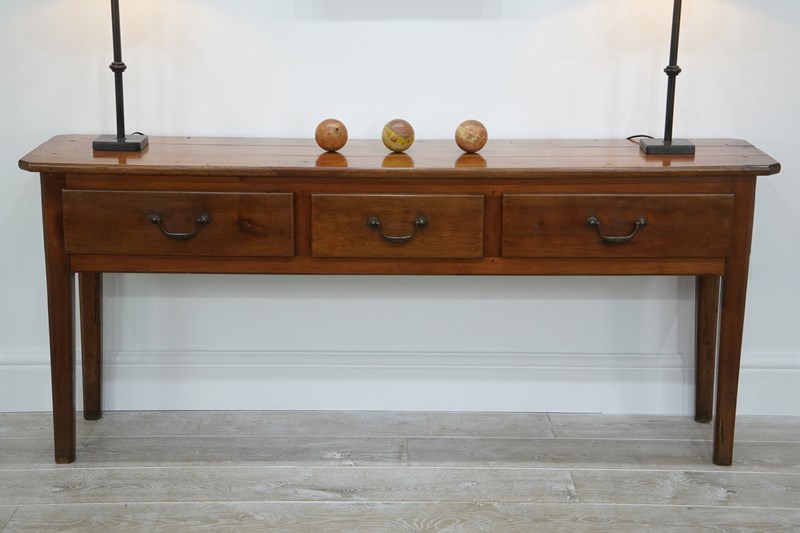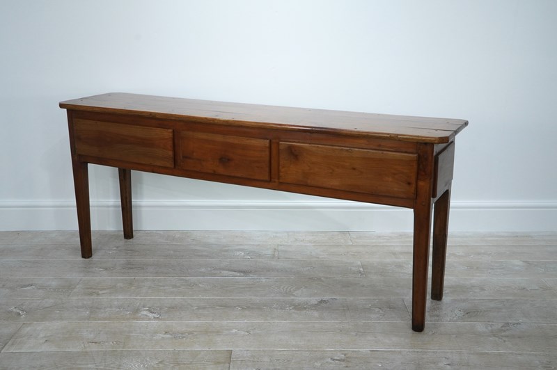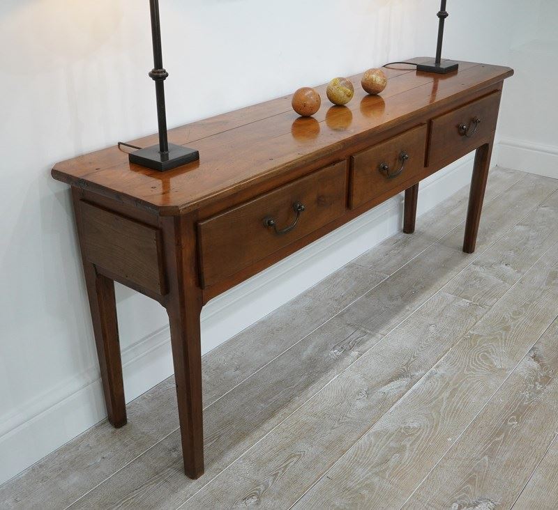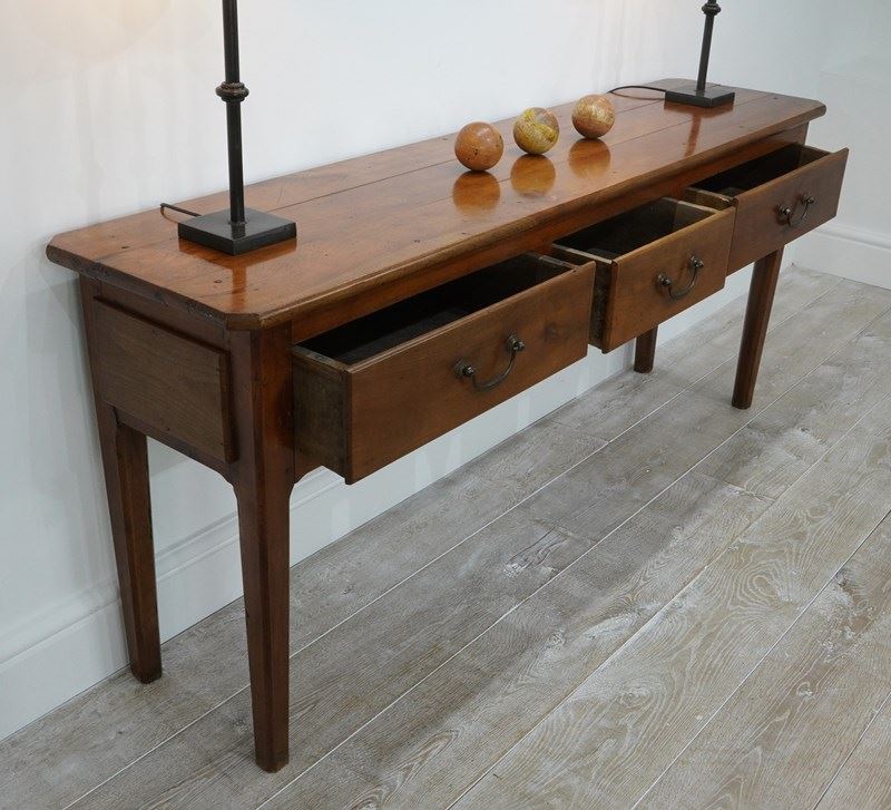 Although this 19th century server started life a little deeper in scale it still boasts all the charm and character of its former appearance. By reducing the depth slightly it becomes more practical to place within the home. Three deep drawers span the front, each drawer still with its original drop handle. The back has three raised panels to represent three dummy drawers so it may be placed as a centre piece / room divider if need be and so admired from both sides. The top has a series of three thick dense solid cherrywood timbers with chamfered corners standing on four chamfered solid cherrywood legs.