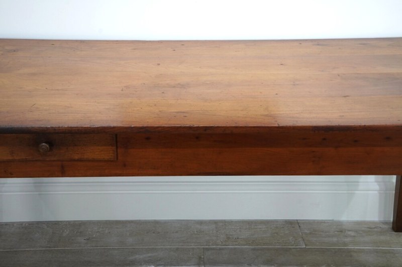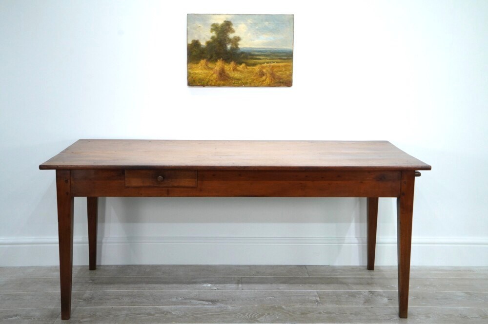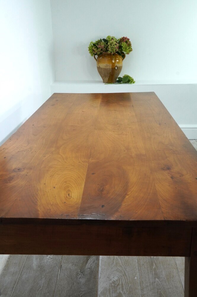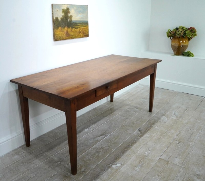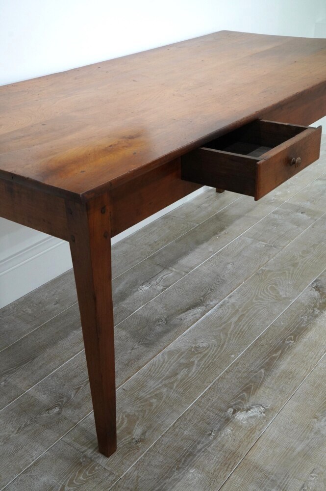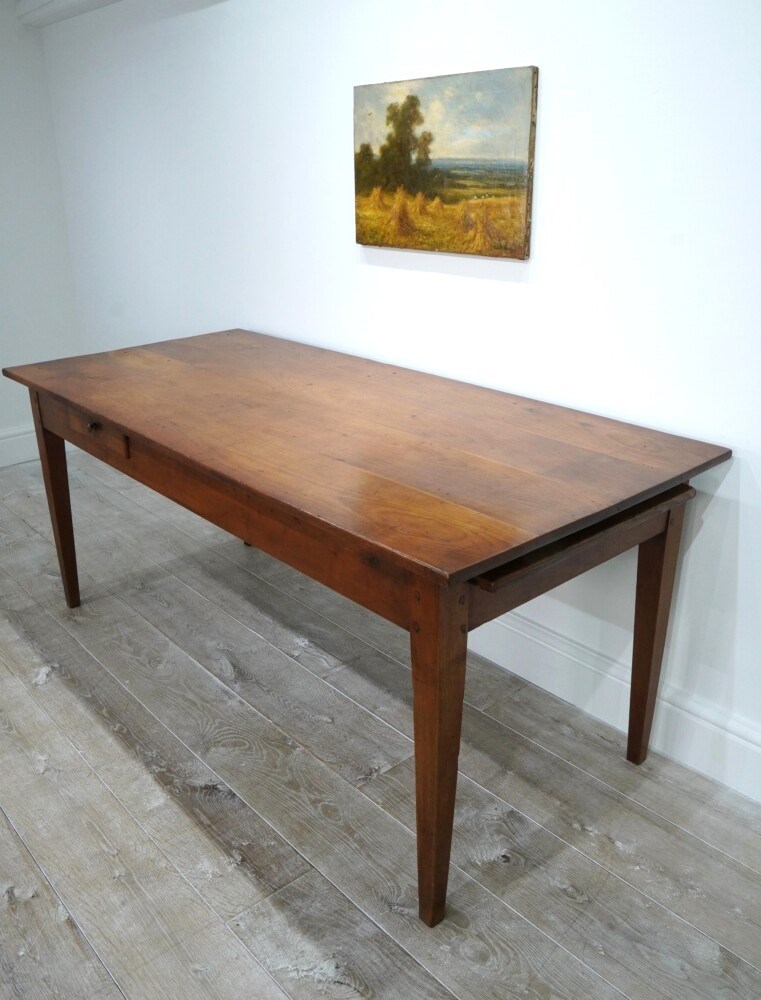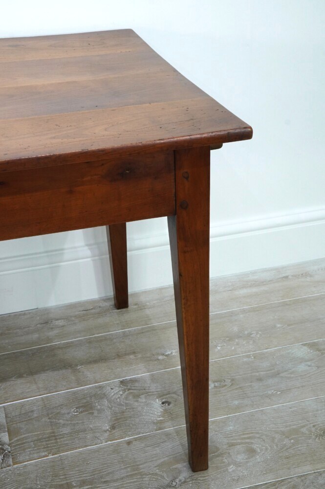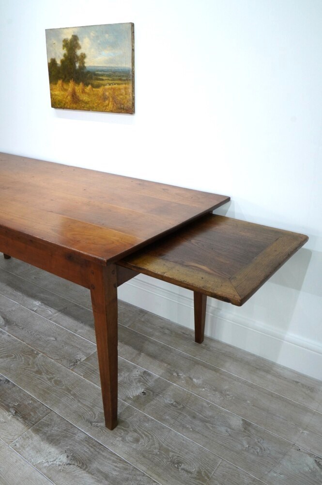 A 19th century French cherrywood dining table standing on four square tapering legs. The top to this super table consists of four wide cherrywood timbers which have been closed tightly together to ensure no irritating gaps ensuring a neat flat surface. The solid cherrywood legs are slightly tapering giving the table a light elegant appearance. A small cutlery drawer is housed within one side with a useful pull out bread slide extension to one end. French cherrywood dining table circa 1860. knee height 24 inches, extension leaf gives an extra 60 cm.