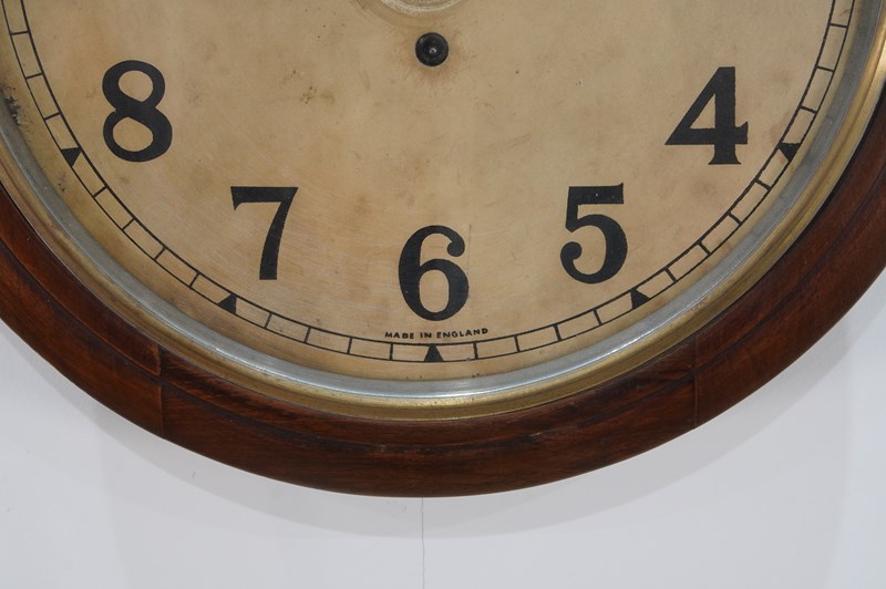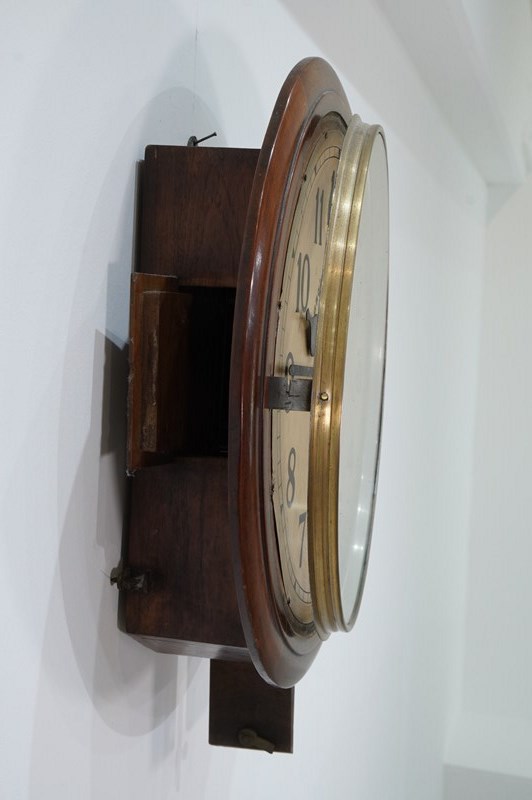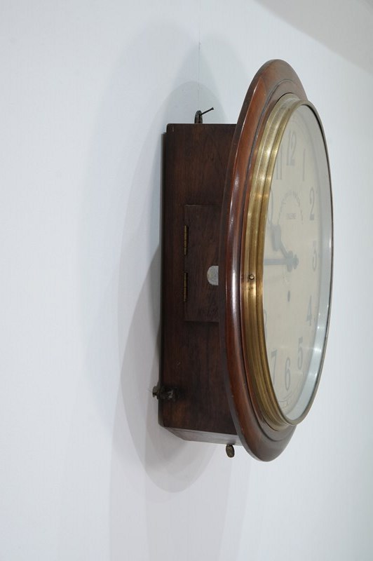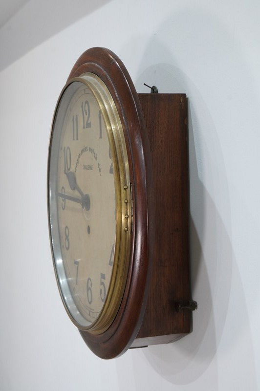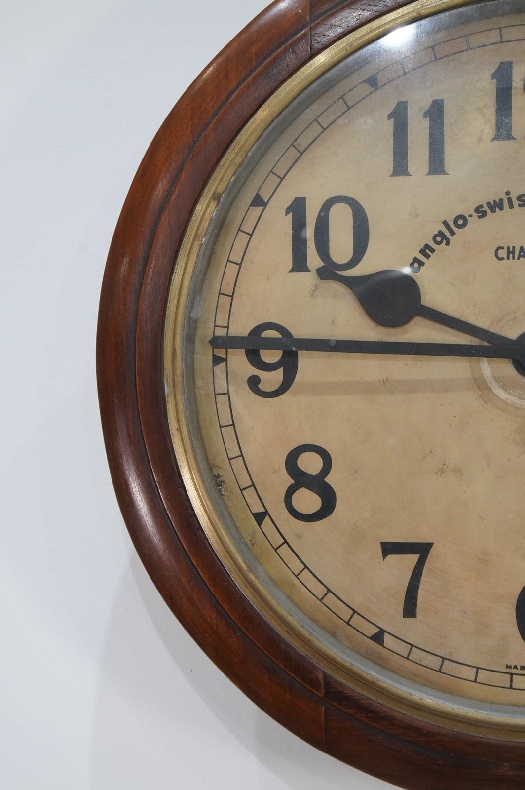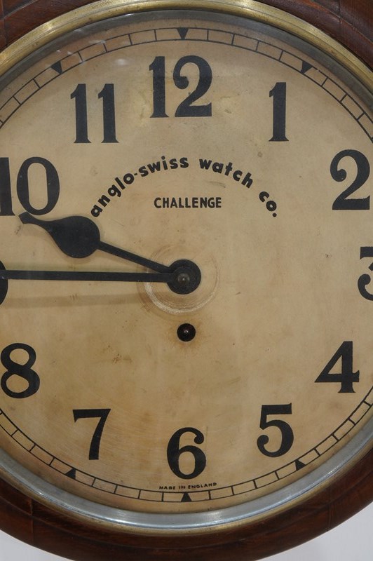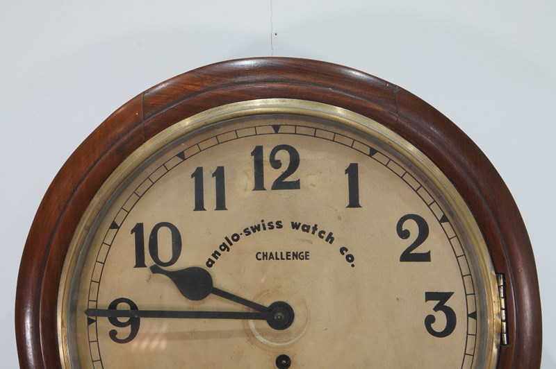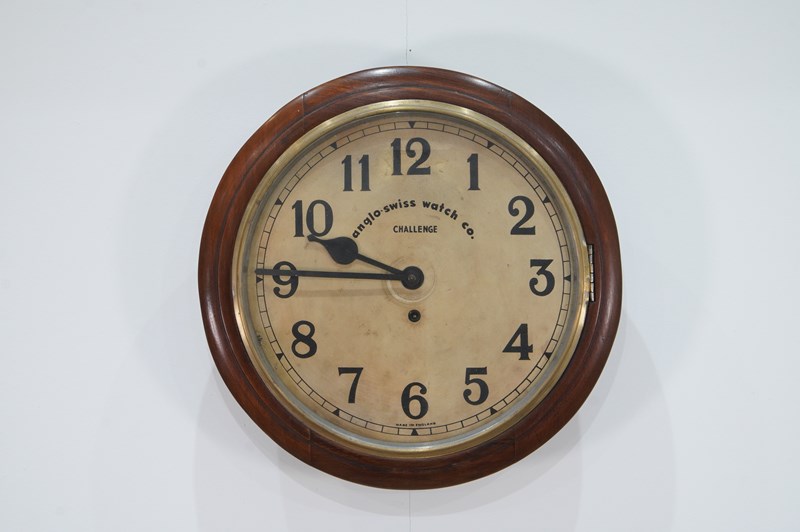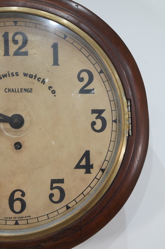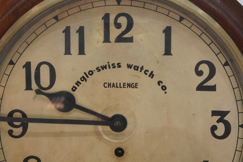 An antique 15 inch Anglo Swiss challenge wall clock. This decorative wall clock is presented in superb working order complete with winding key. These iconic clocks were originally designed to be used as municipal / school or station clocks but these days can sit comfortably within the home and blend perfectly with contemporary modern day living. Housed within the polished mahogany case is an English Smiths timepiece mechanism. The dial shows black painted numerals and the maker’s name upon the original tin clock face behind the glass lens. The internal pendulum ticks to perfection with accurate timekeeping and can be accessed from the pendulum door beneath with a side inspection door together with levelling lugs and pins to the back of the clock. Anglo Swiss challenge wall clock. Circa 1930.