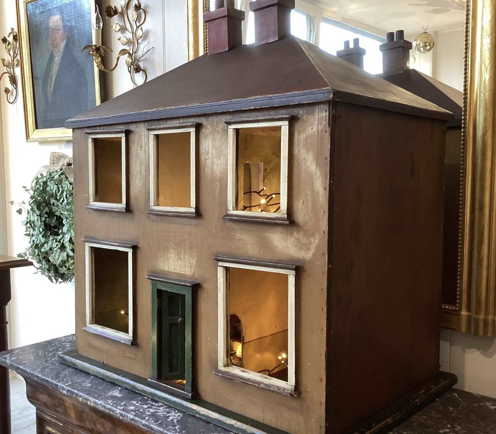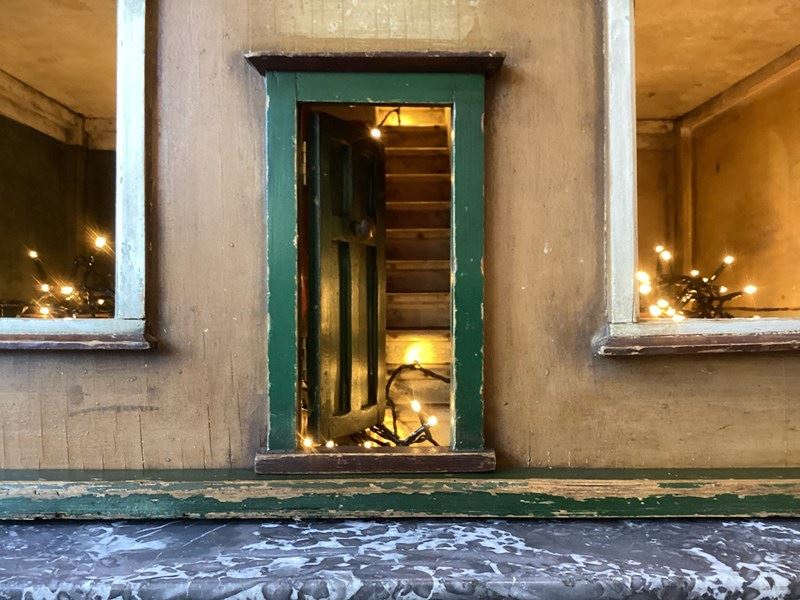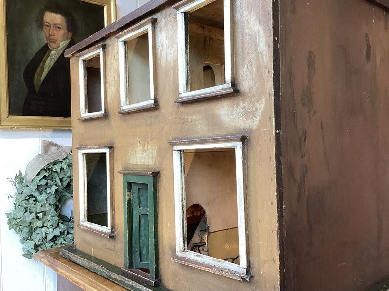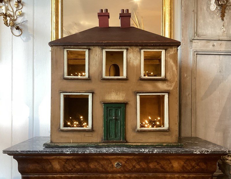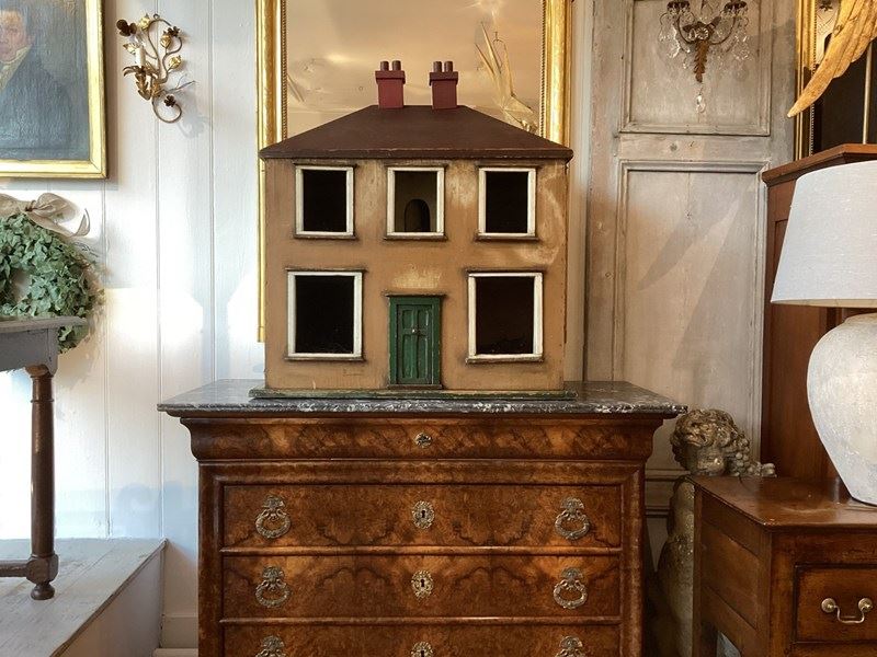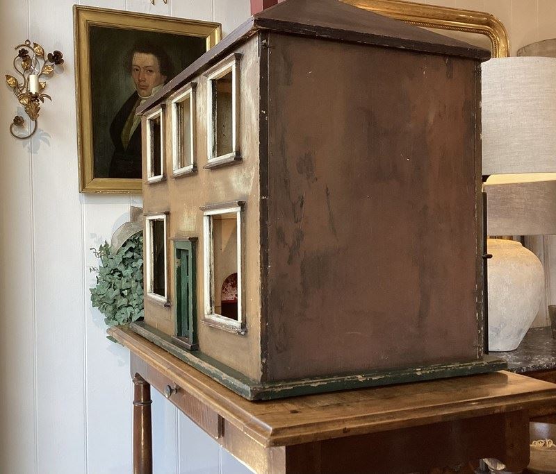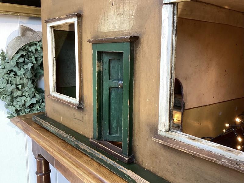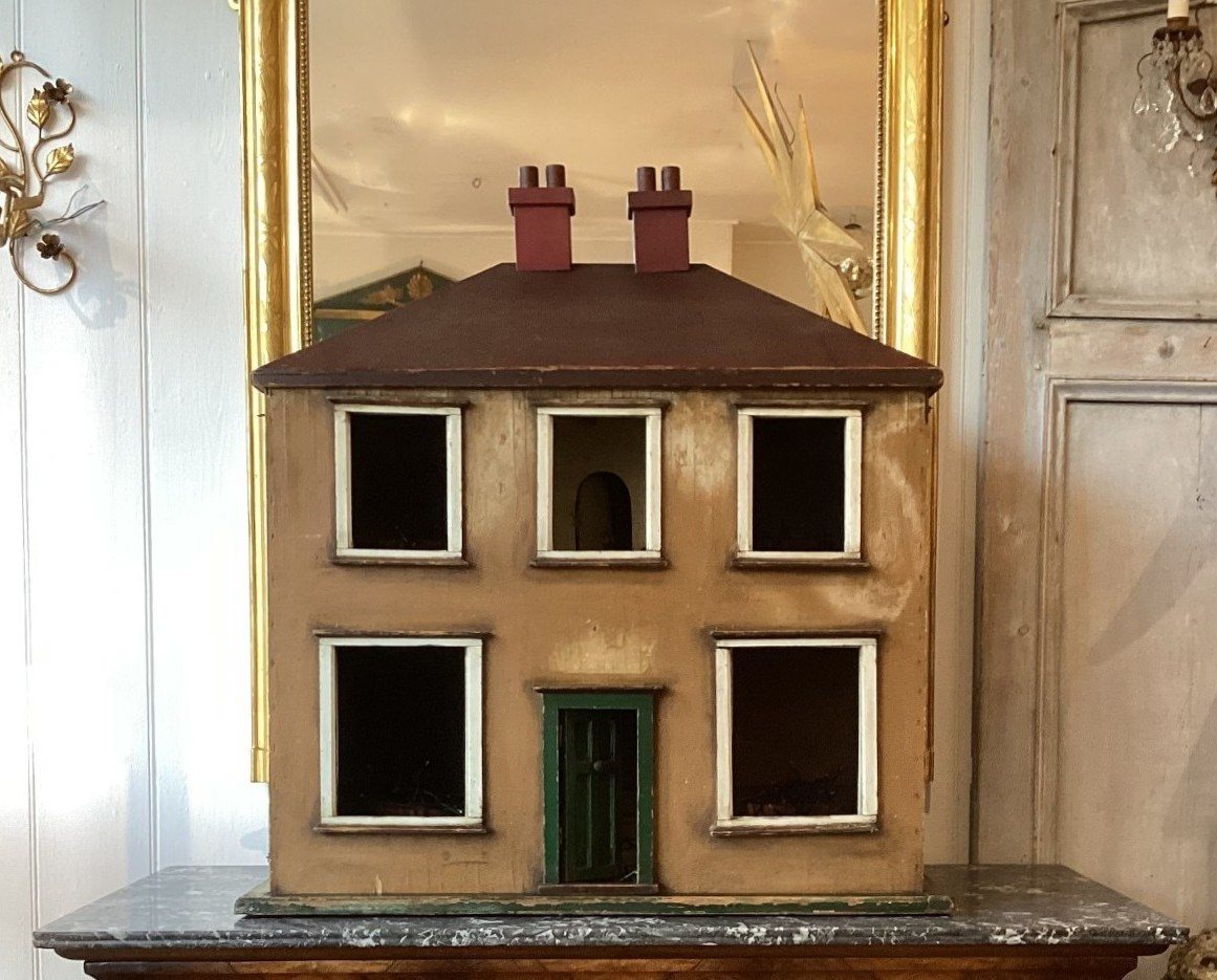 The most charming old wooden dolls house in original paint. Probably made circa 1920 this sweet little house boasts all the features of an earlier Georgian country house. Behind the symmetrical windows are four large rooms and a landing all decorated in original soft Georgian colours. The green front door conceals a tall wooden staircase. The roof is painted terracotta with a double chimney stack. The house stands proudly upon a green base to replicate the land. Removable roof and front panel for access. English dolls house circa 1920.