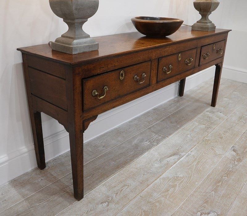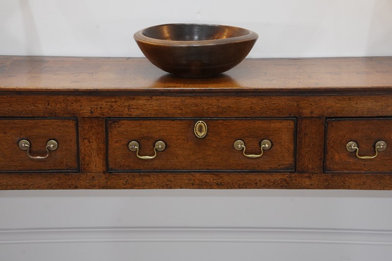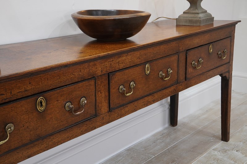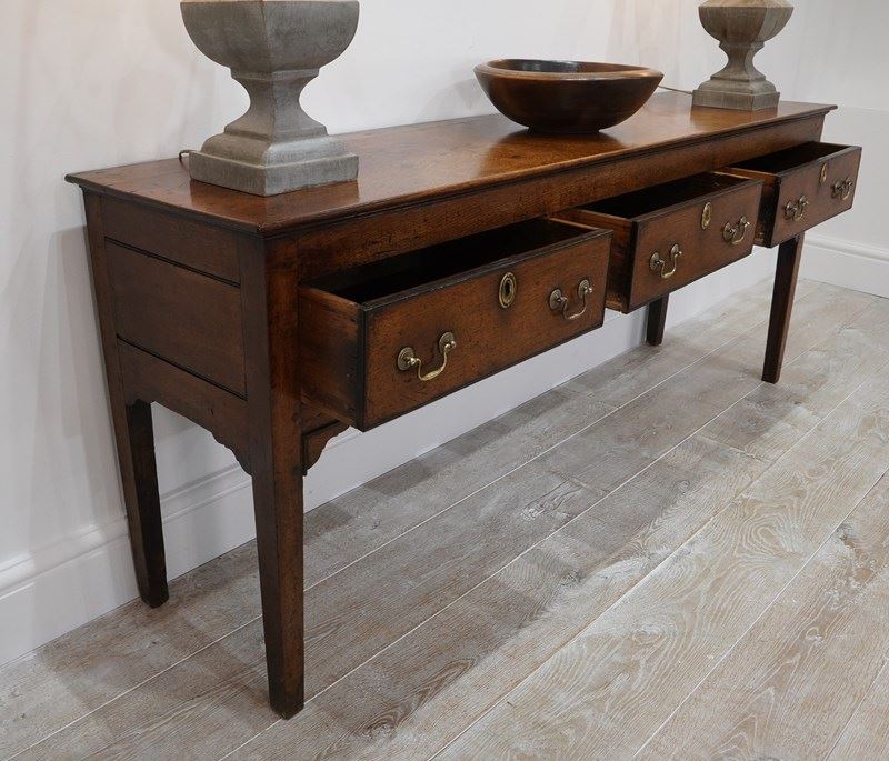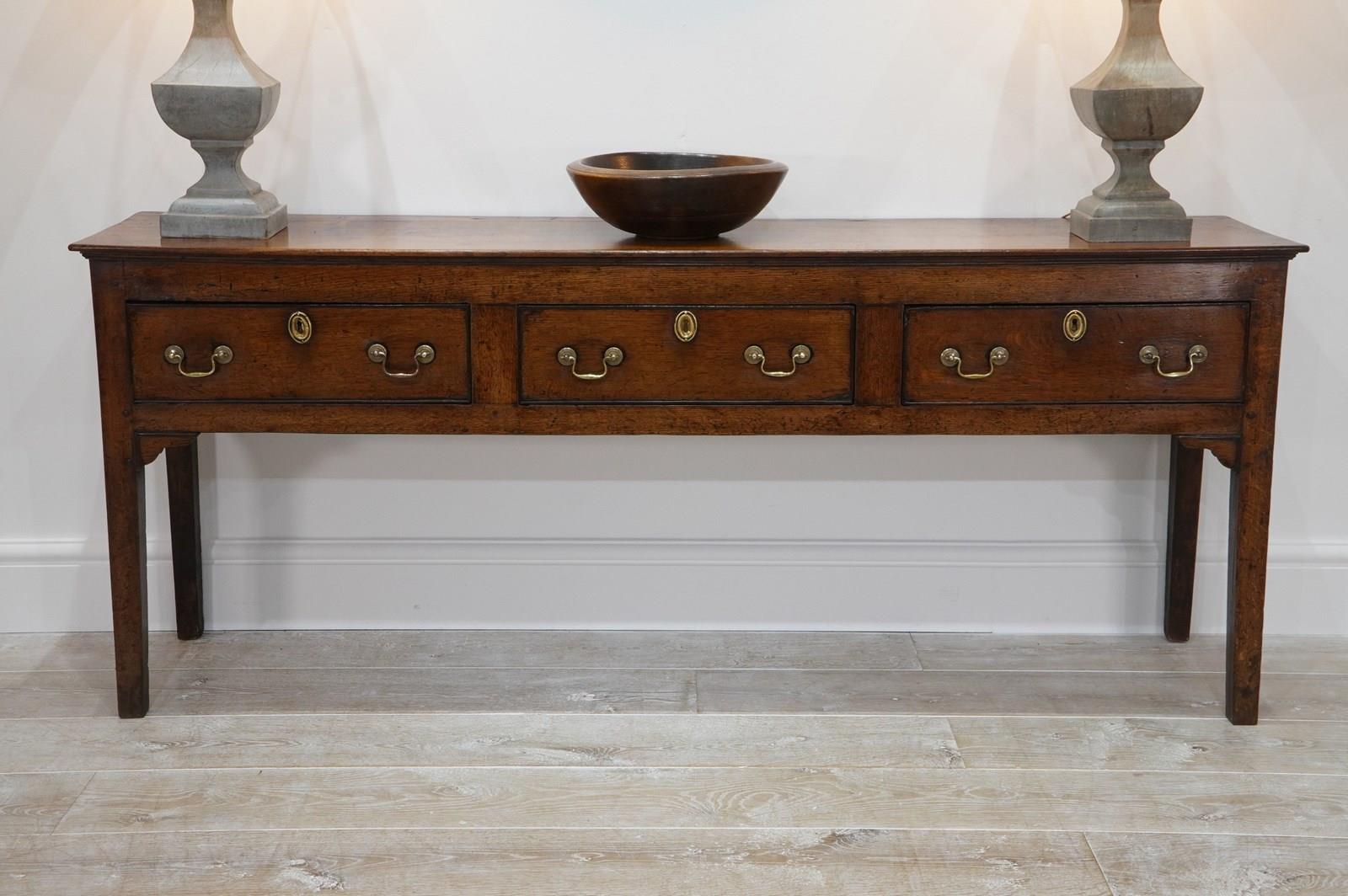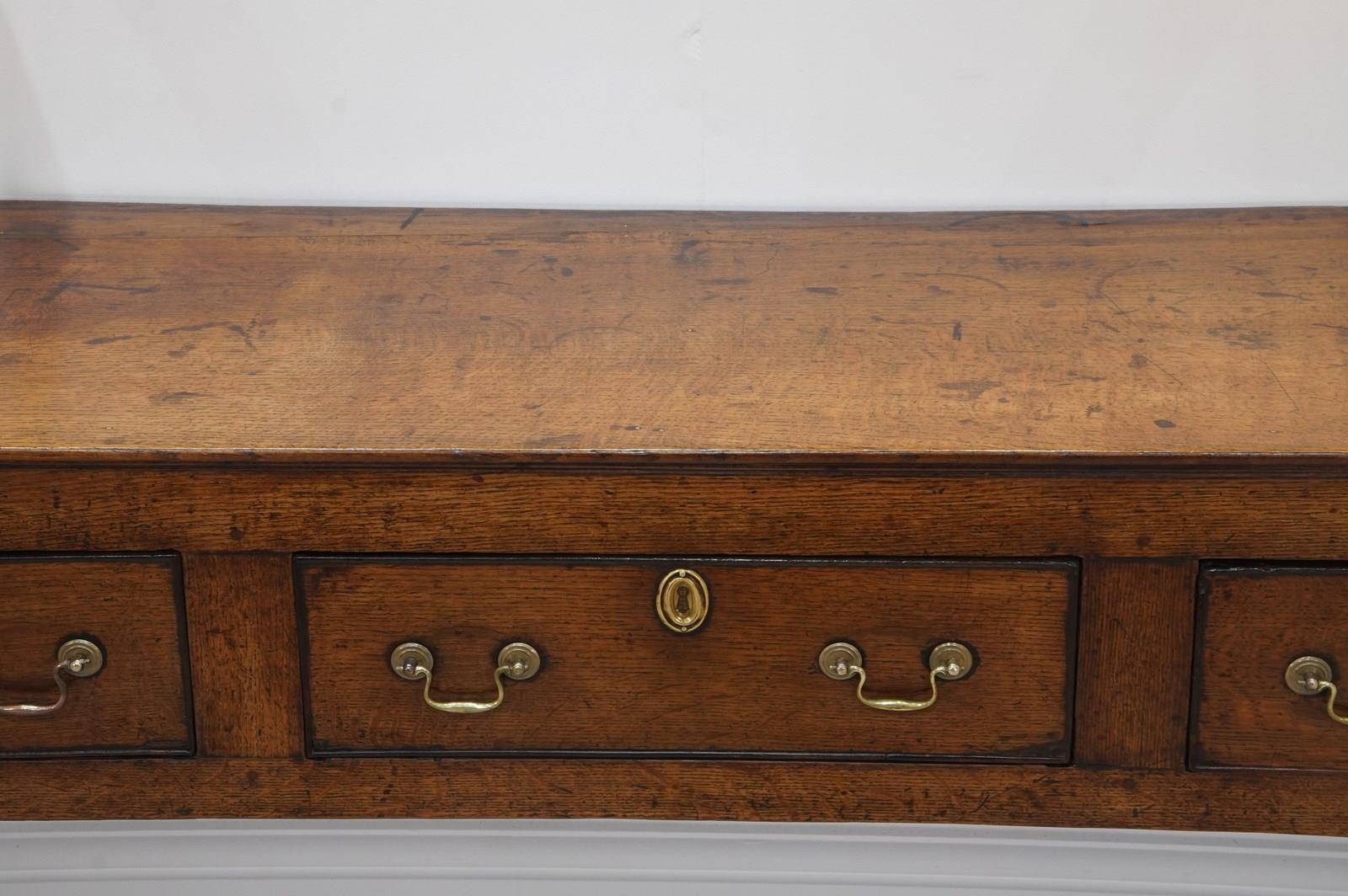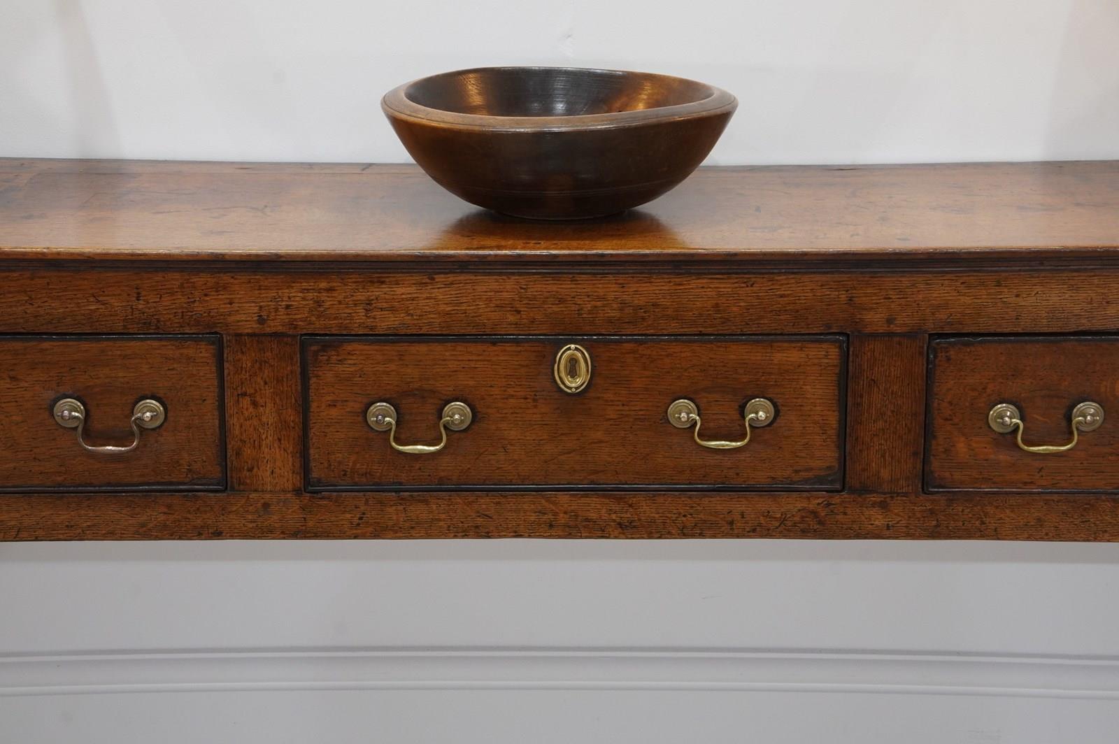 An 18th century English oak dresser base. An exceptionally wide seasoned oak timber spans the top of this period country house base. Below are a run of three neatly fitting drawers. Each drawer holds twin swans neck handles to the dresser base together with brass escutcheons. The whole standing on four square legs. There are a few historical nibbles and dints gathered over the passage of time only adding to its history and charm. Gorgeous rich colour and patina. Woodworm treated purely as a precautionary measure. English oak dresser base circa 1780.