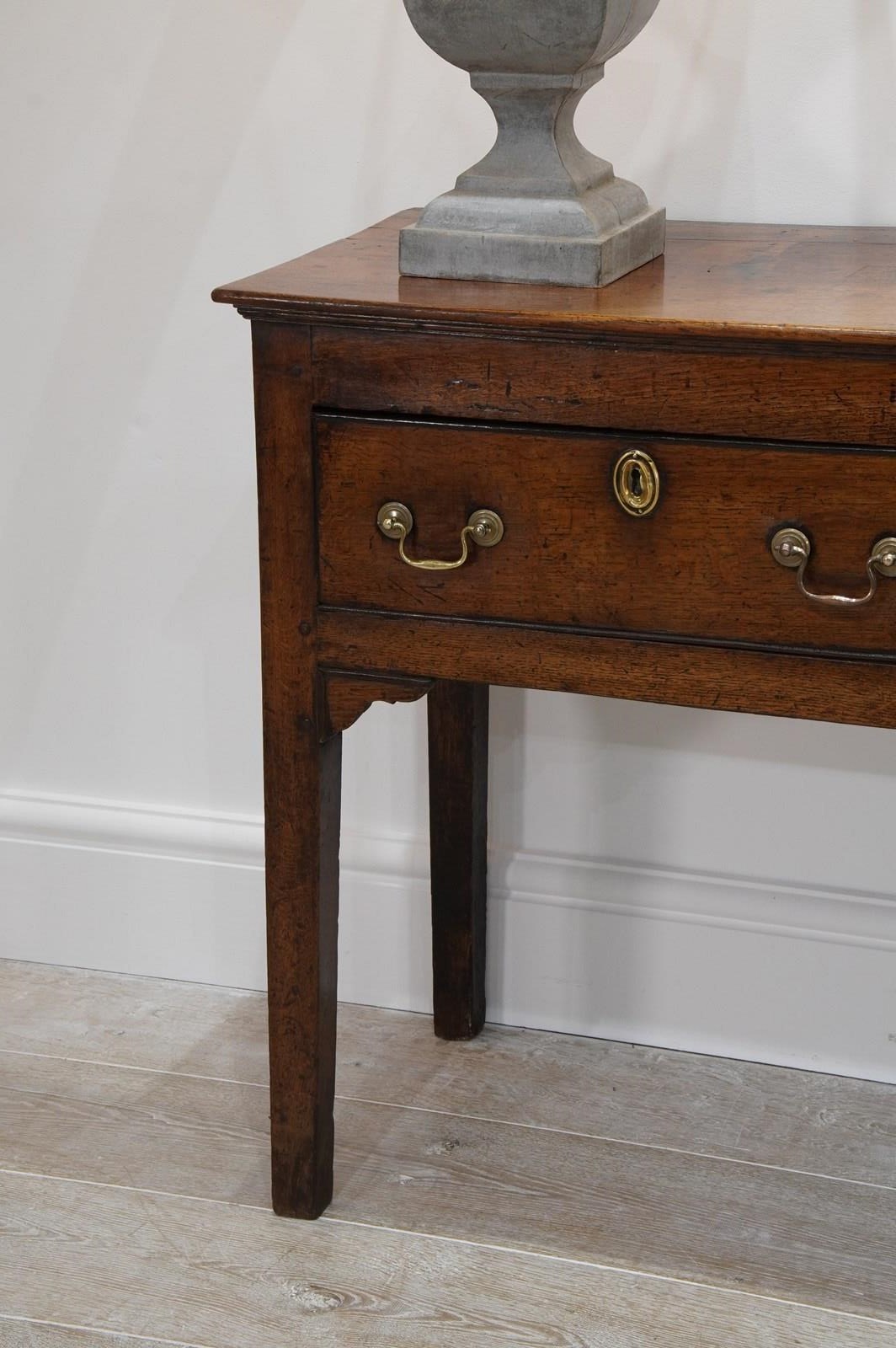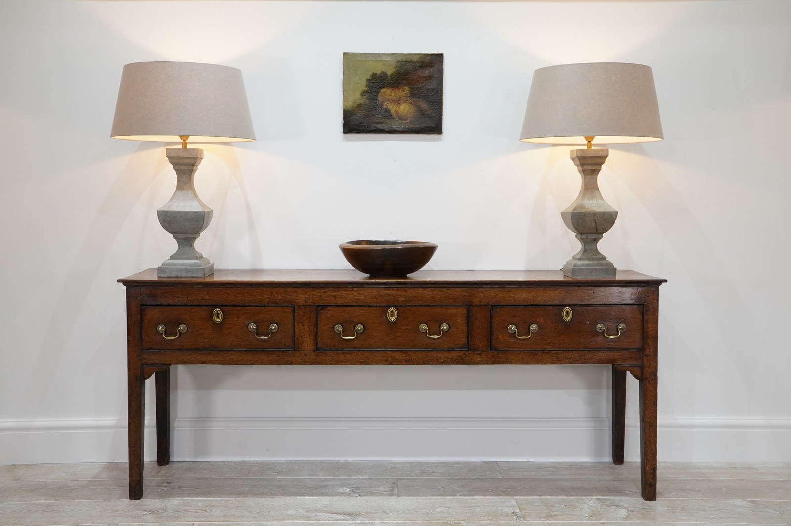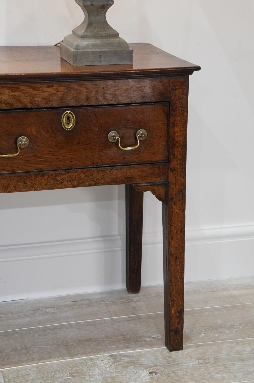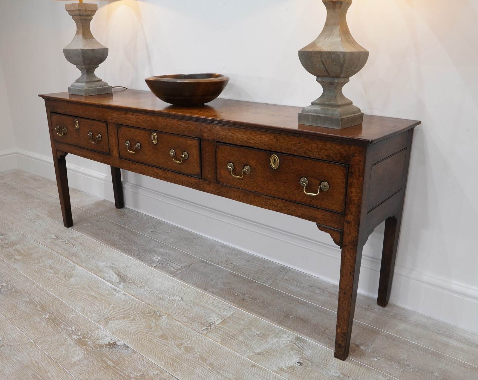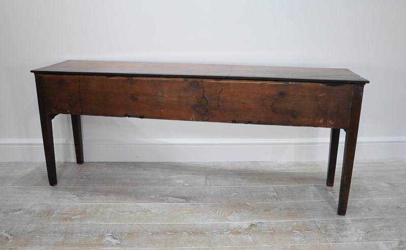 An 18th century English oak dresser base. An exceptionally wide seasoned oak timber spans the top of this period country house base. Below are a run of three neatly fitting drawers. Each drawer holds twin swans neck handles to the dresser base together with brass escutcheons. The whole standing on four square legs. There are a few historical nibbles and dints gathered over the passage of time only adding to its history and charm. Gorgeous rich colour and patina. Woodworm treated purely as a precautionary measure. English oak dresser base circa 1780.