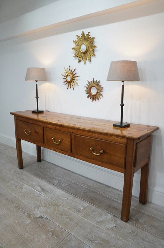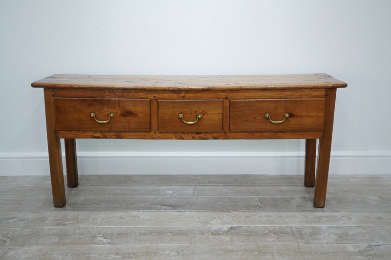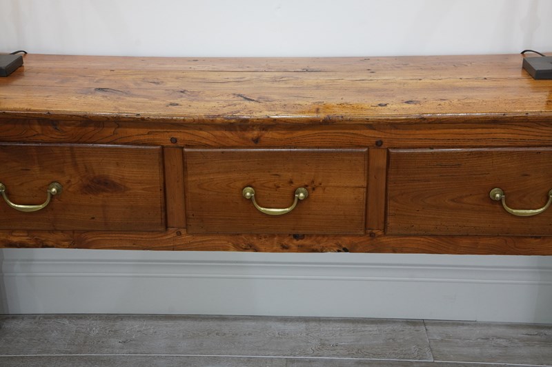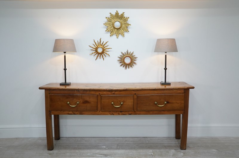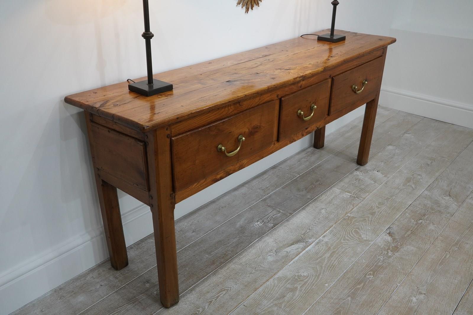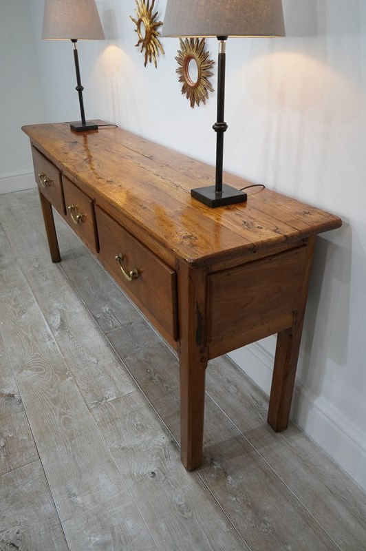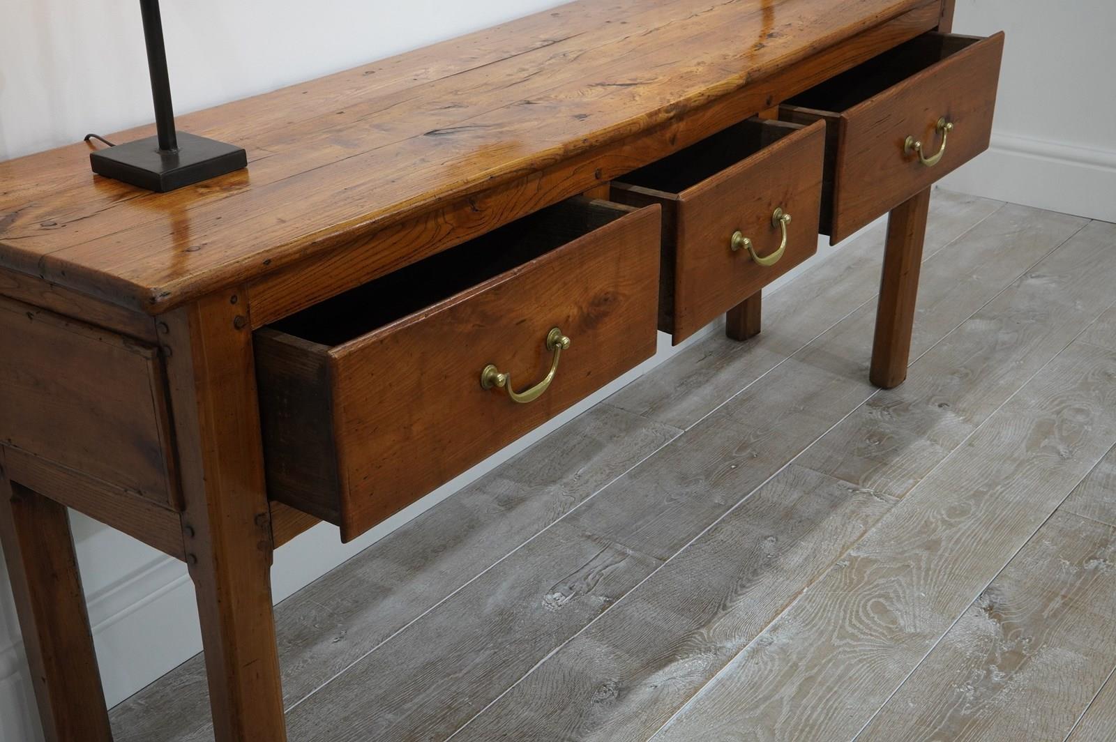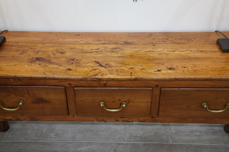A 19th century solid Elm farmhouse server. Three beautifully seasoned timbers span the top of this exceptional piece. A row of three deep drawers are housed beneath, each drawer still with its original heavy gauge, solid brass handle. The drawers fit well and run with ease. The ends are panelled, the back also having three raised panels to represent three drawers making it desirable to view from both sides.