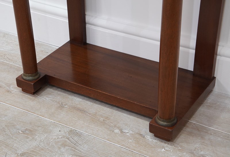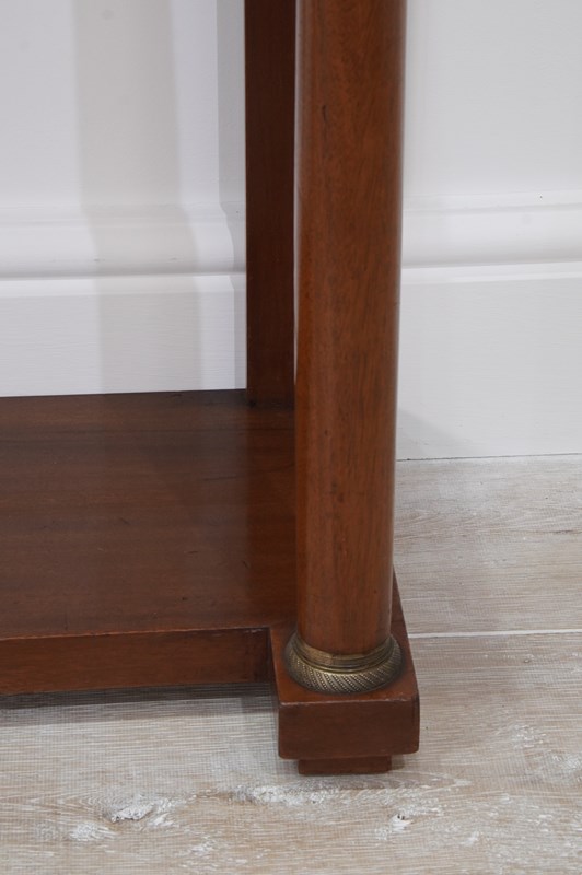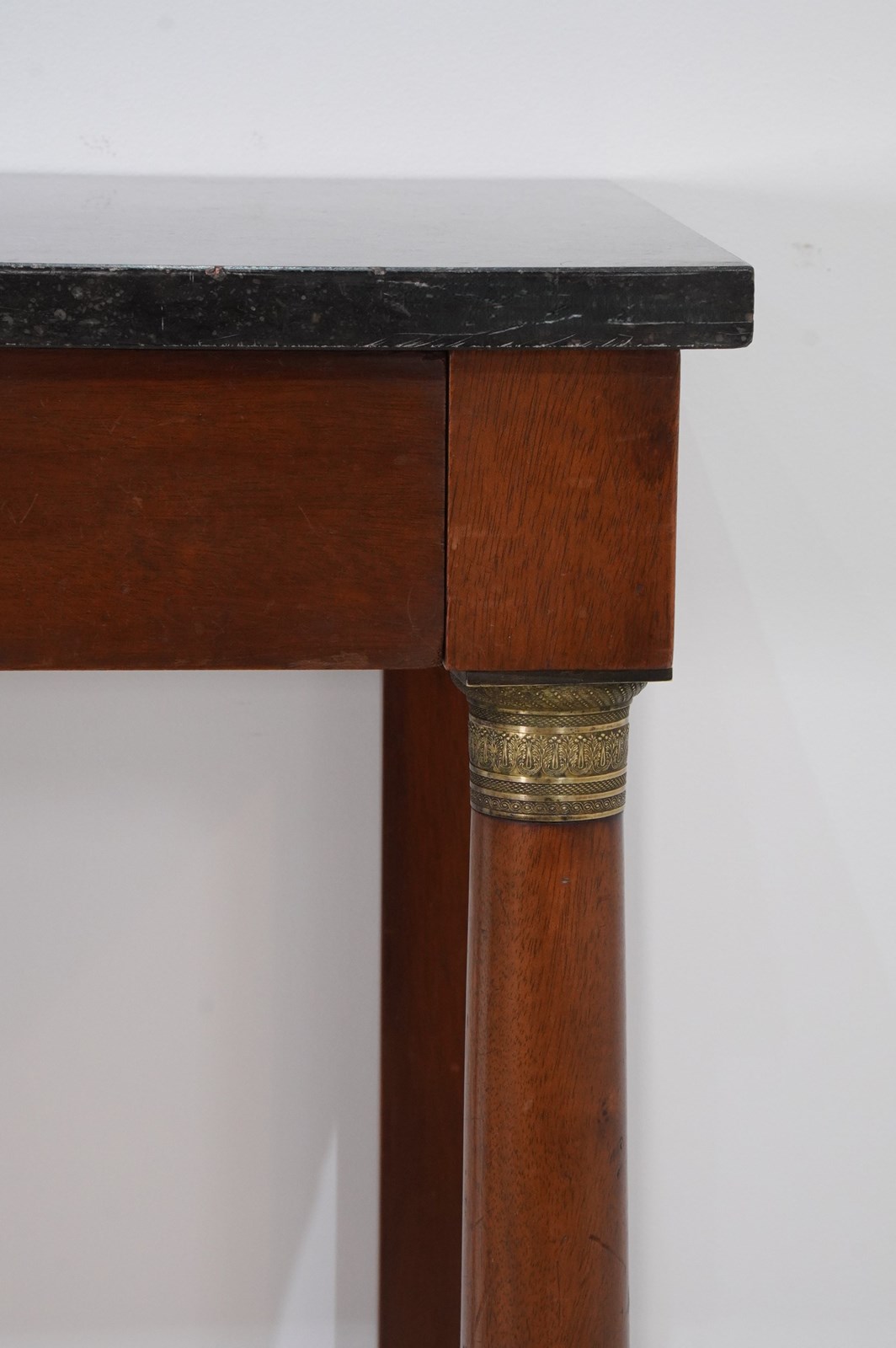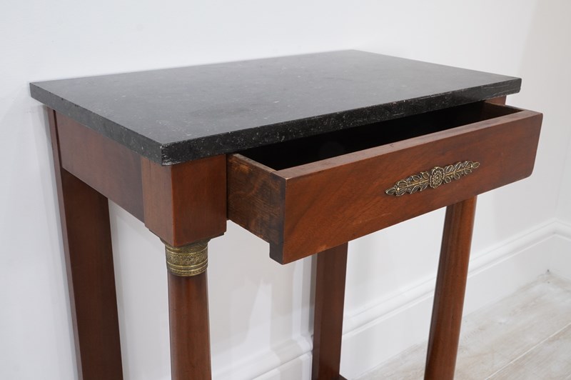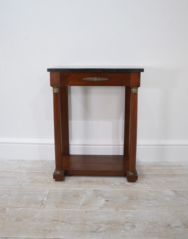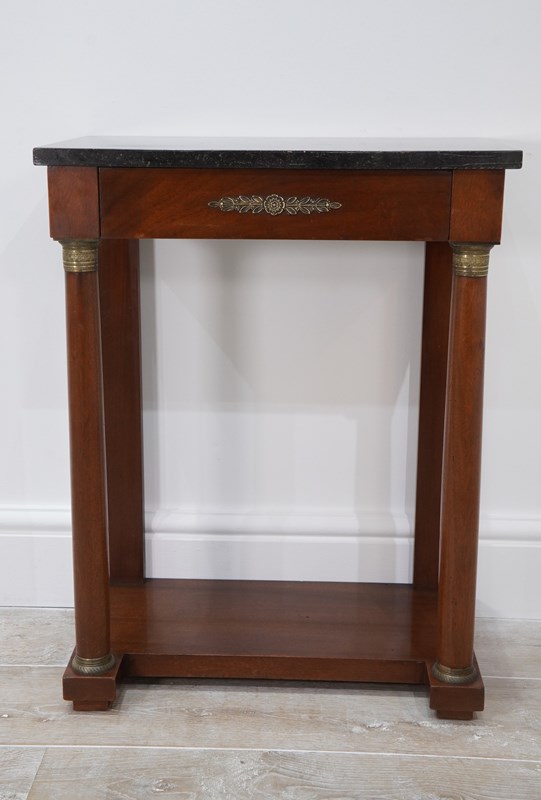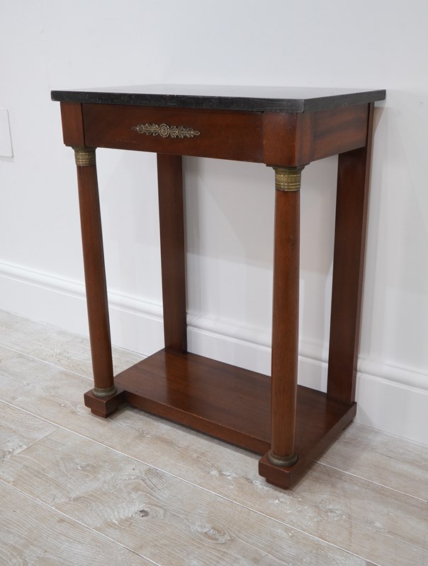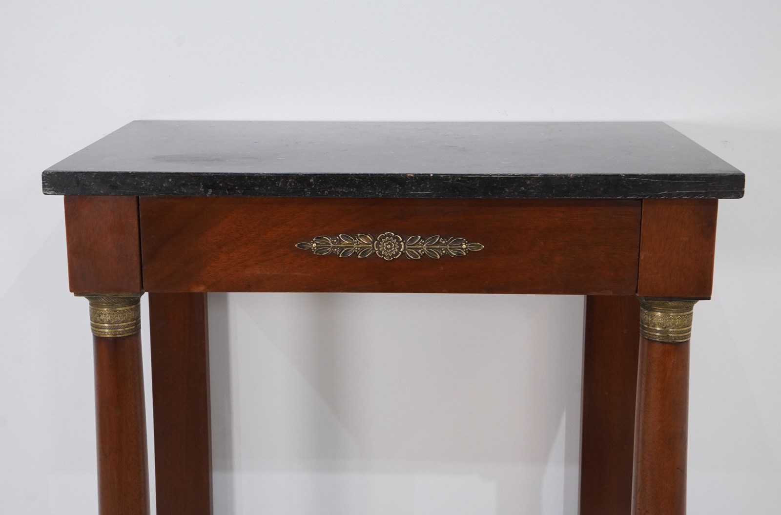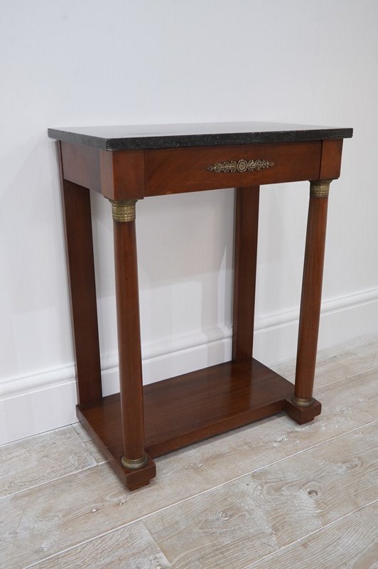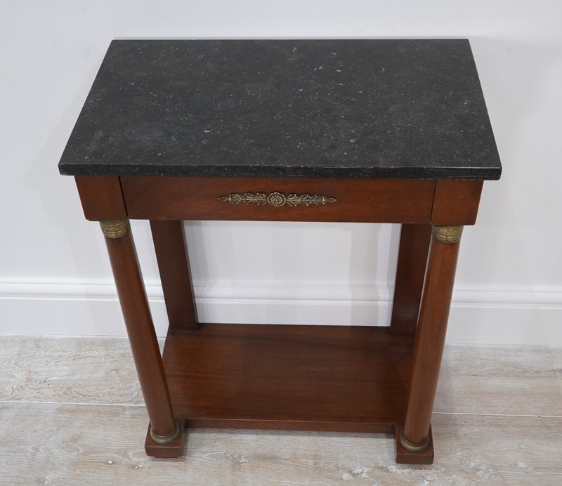 A late 19th century Mahogany console table with charcoal grey marble top and single drawer below, standing on four elegant legs embellished with brass capitals. The smaller scale to this pretty table is such that it could be placed anywhere in the home especially suitable for a small alcove.