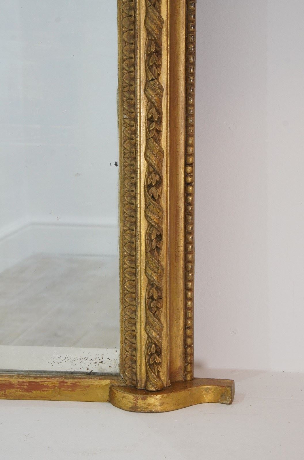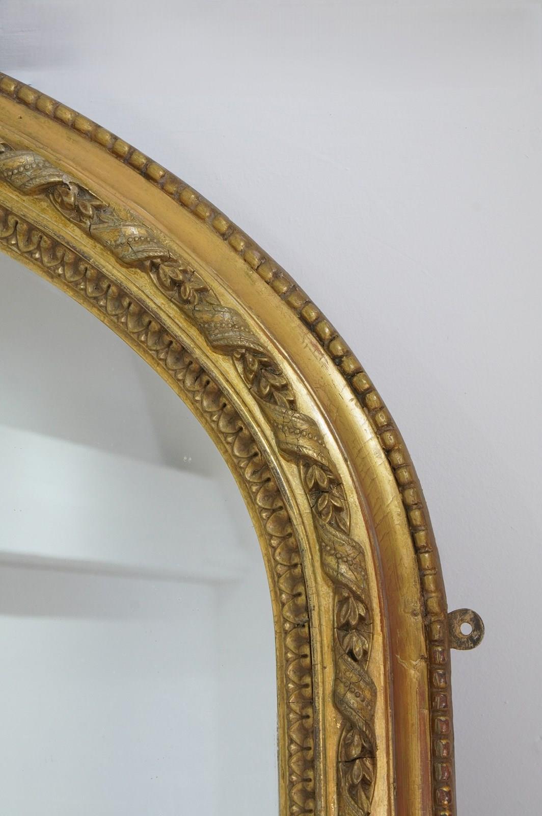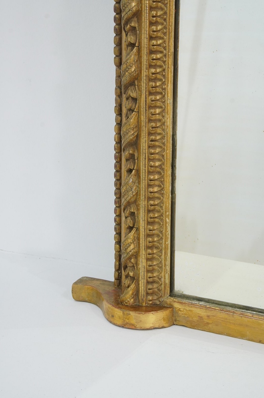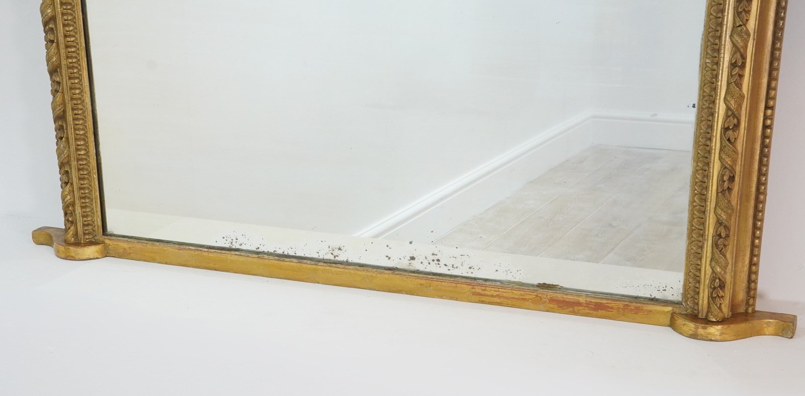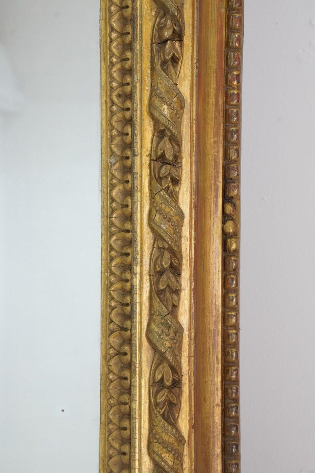 An early 19th century English gilded overmantle mirror. The raised central moulding to this handsome mirror is decorated with a continuous gesso gilded ribbon entwined with tiny acanthus leaves overlapping with further moulded decoration to either side. The original gold leaf has faded and evenly rubbed over the past near two centuries revealing varying base colours creating a wonderfully atmospheric English country house appearance. The glass mirror plate is the original piece together with the original pine backboards which have remained intact from the day it was assembled circa 1850.