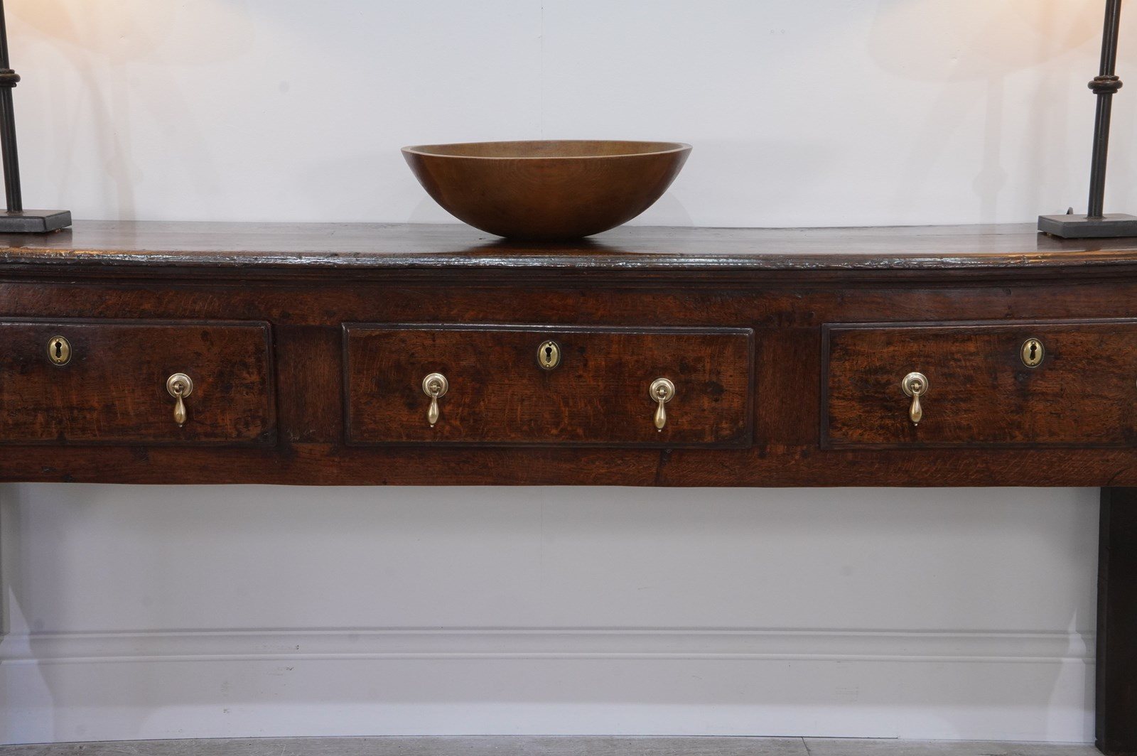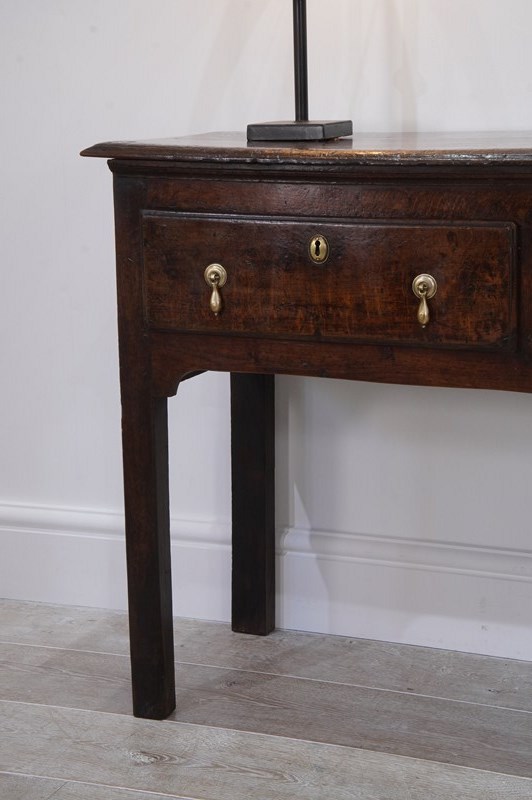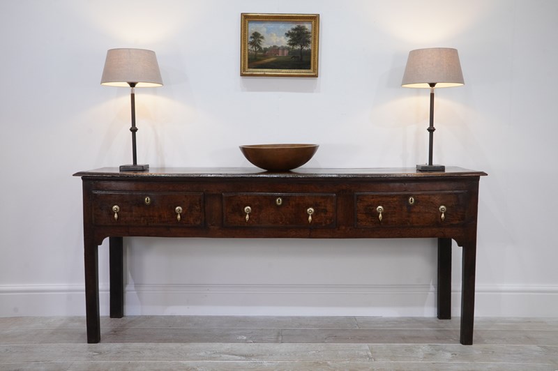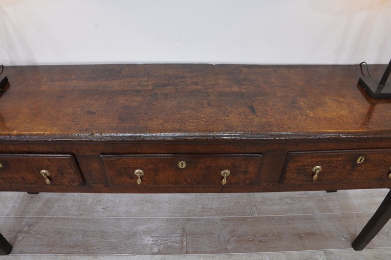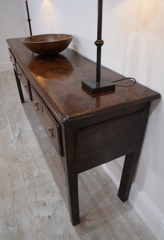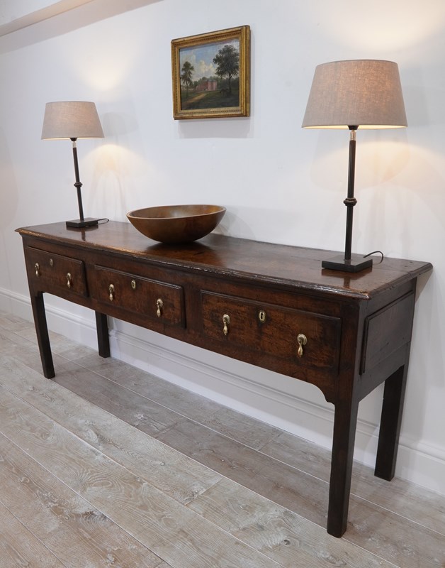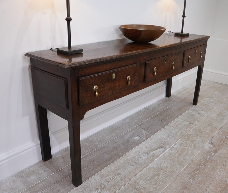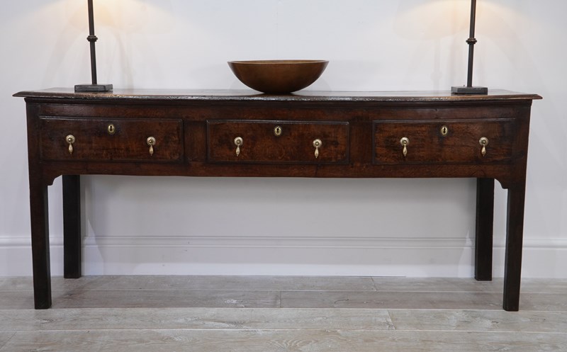 An early 19th century English oak dresser base / serving table standing on four plain straight legs. The top to this substantial base is constructed from two long solid oak timbers with subtle wear and character consistent with its age and history. There are three deep drawers below with antiqued brass drop handles as replacements for the originals made especially for this piece. It has great country charm and has developed a gorgeous rich colour over the past two centuries and with its clean lines would blend perfectly within period or contemporary surroundings. Cleaned inside and out, polished and wood worm treated purely as a precautionary measure. Country base circa 1820.
