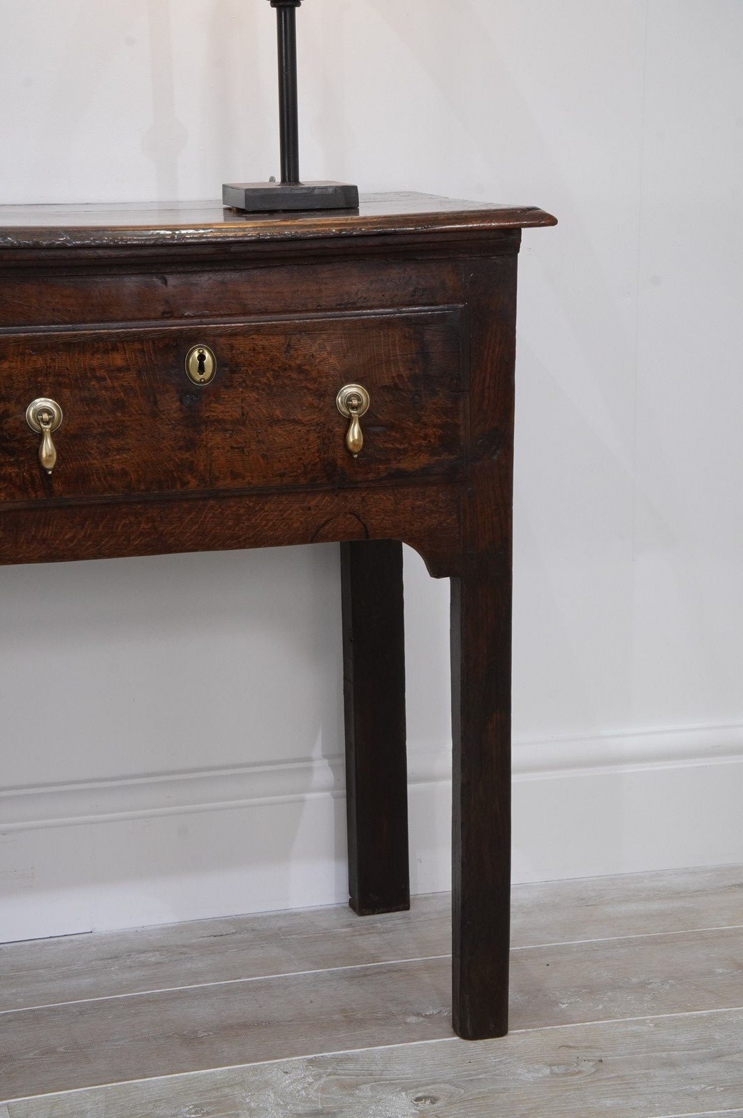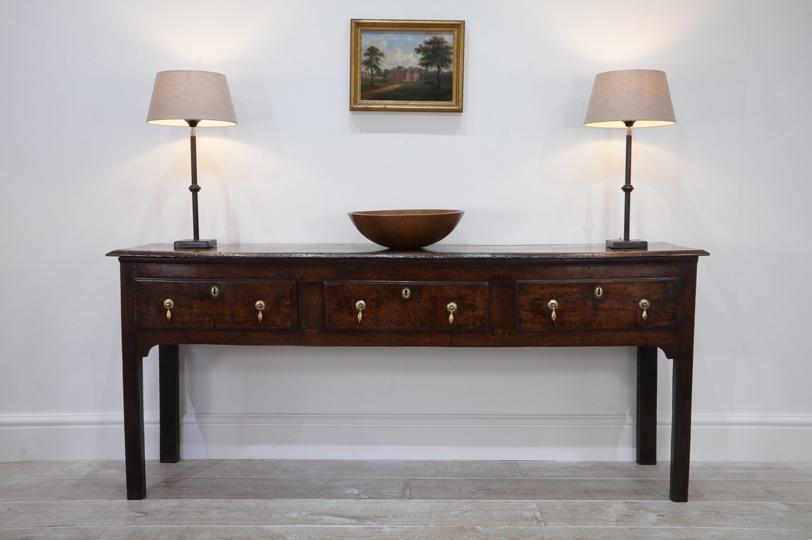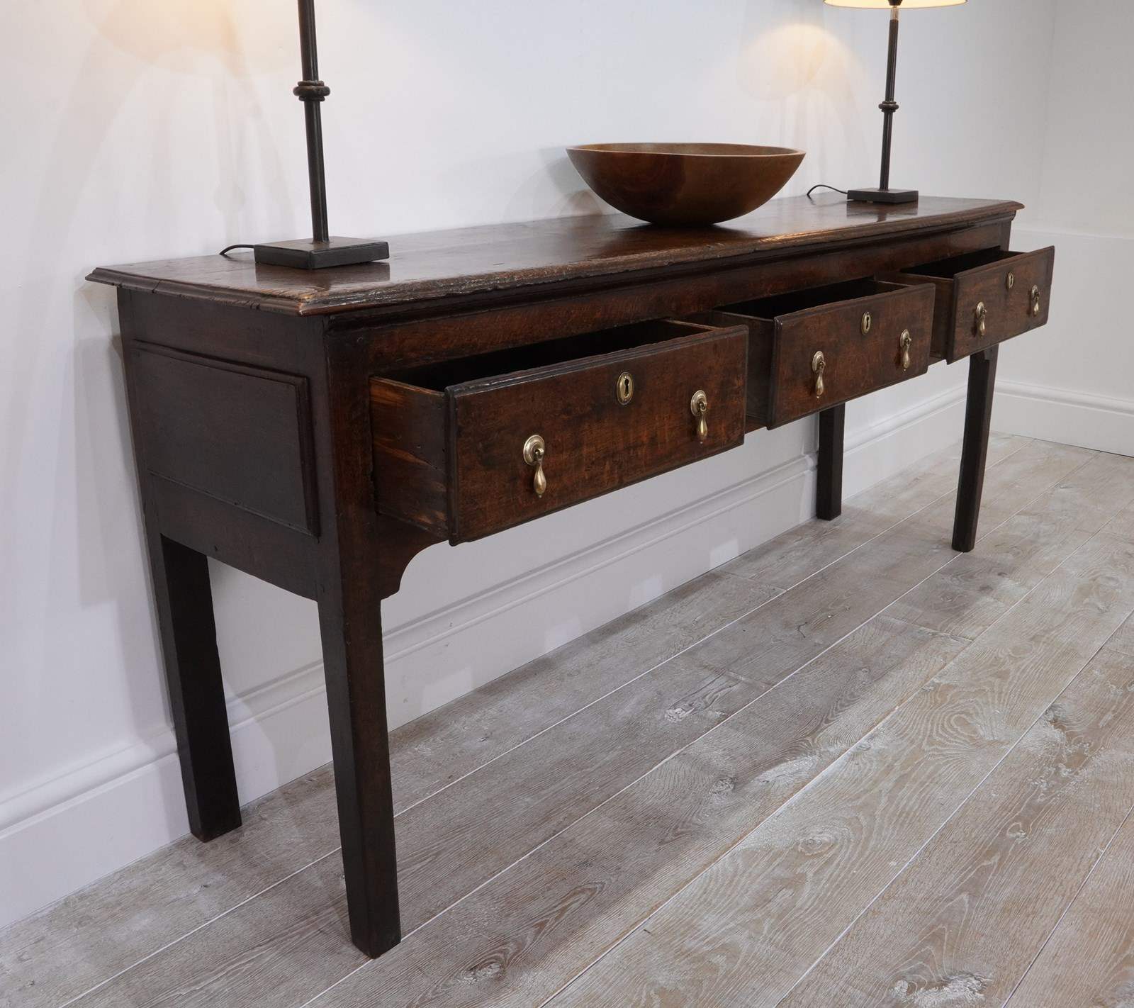 An early 19th century English oak dresser base / serving table standing on four plain straight legs. The top to this substantial base is constructed from two long solid oak timbers with subtle wear and character consistent with its age and history. There are three deep drawers below with antiqued brass drop handles as replacements for the originals made especially for this piece. It has great country charm and has developed a gorgeous rich colour over the past two centuries and with its clean lines would blend perfectly within period or contemporary surroundings. Cleaned inside and out, polished and wood worm treated purely as a precautionary measure. Country base circa 1820.