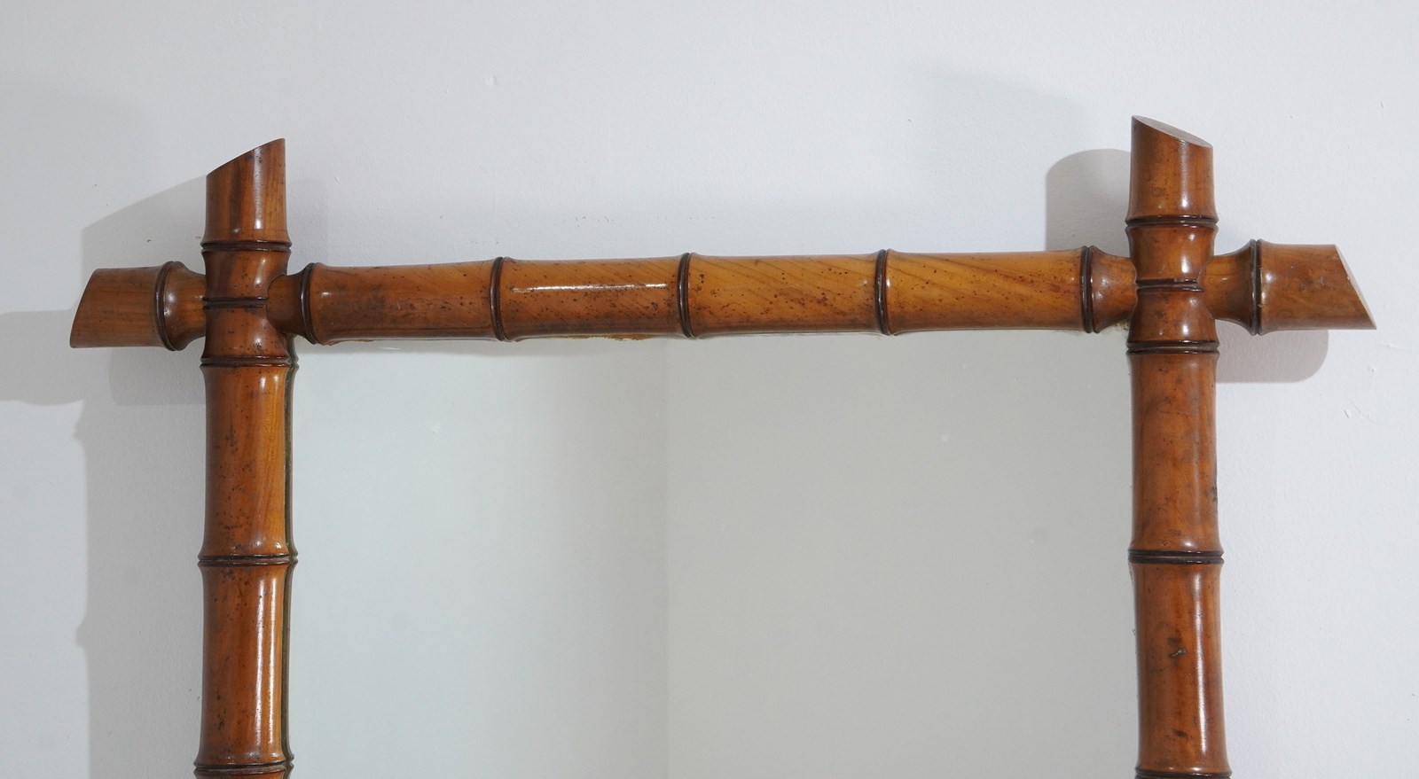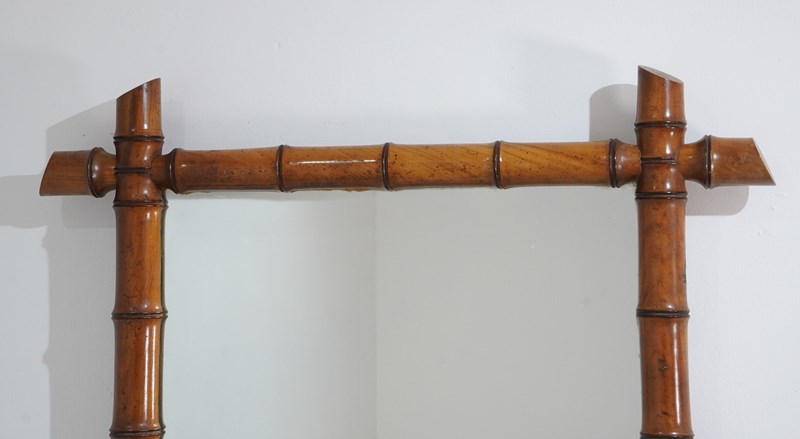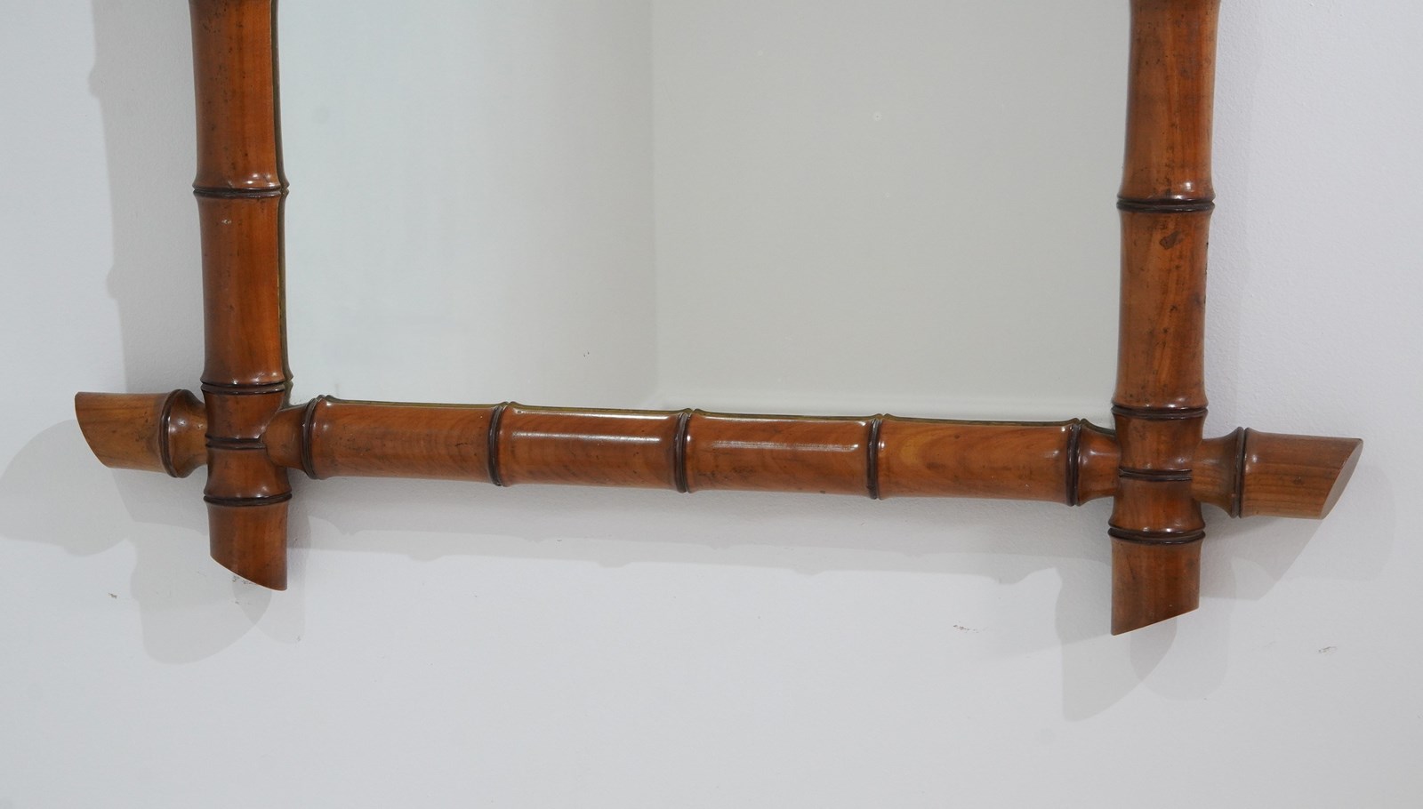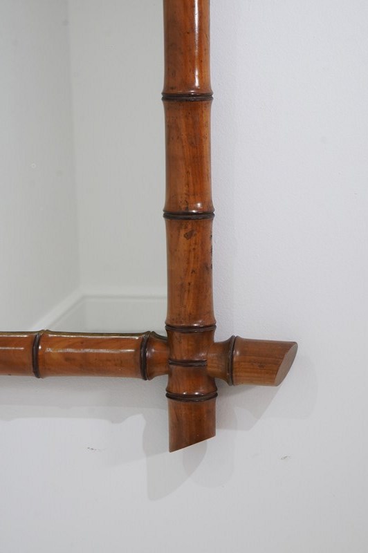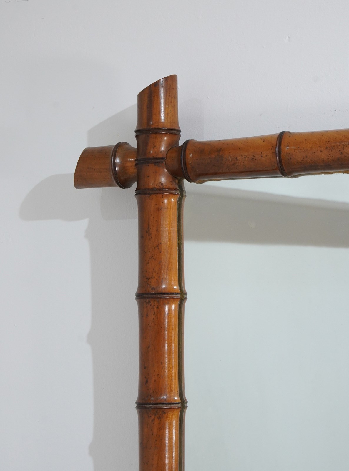 A late 19th century French chunky faux bamboo wall mirror. The wider than average cherrywood frame to this stylish mirror was designed to replicate bamboo. Deep golden honey colour with a richly patinated surface developed over the past century. Superb original condition. Original blemish free mirror plate. Original backboard.