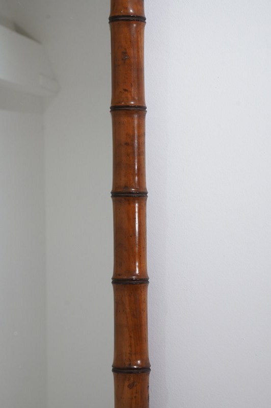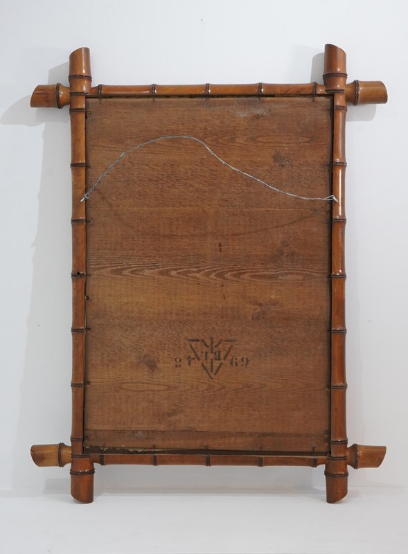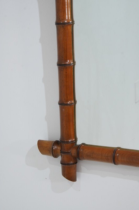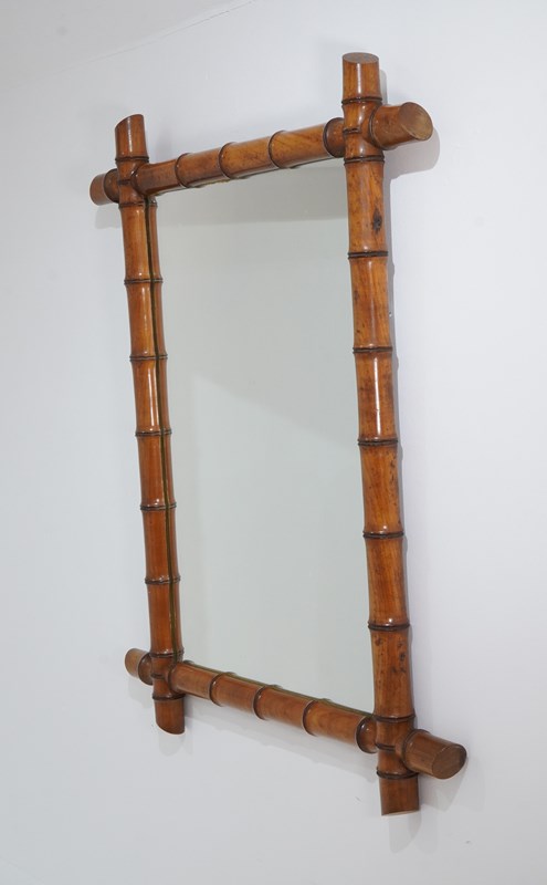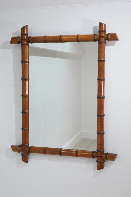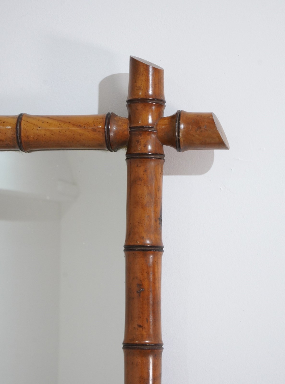 A late 19th century French chunky faux bamboo wall mirror. The wider than average cherrywood frame to this stylish mirror was designed to replicate bamboo. Deep golden honey colour with a richly patinated surface developed over the past century. Superb original condition. Original blemish free mirror plate. Original backboard.