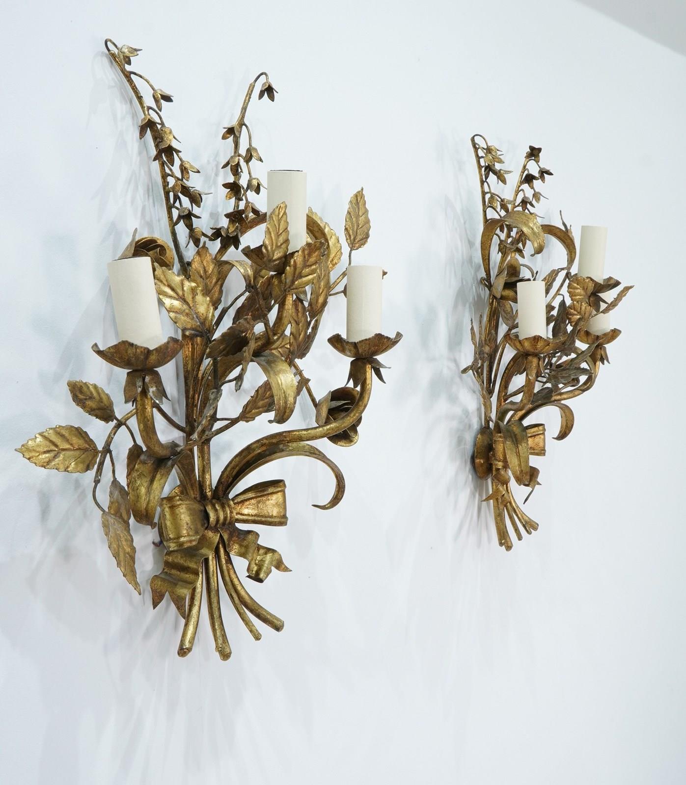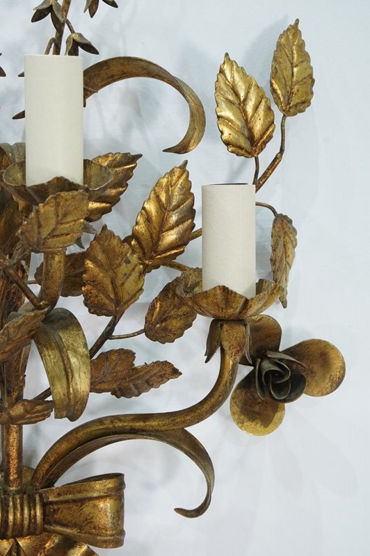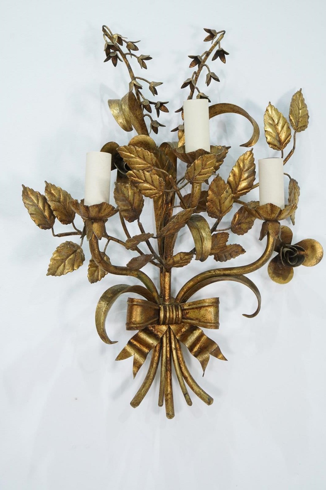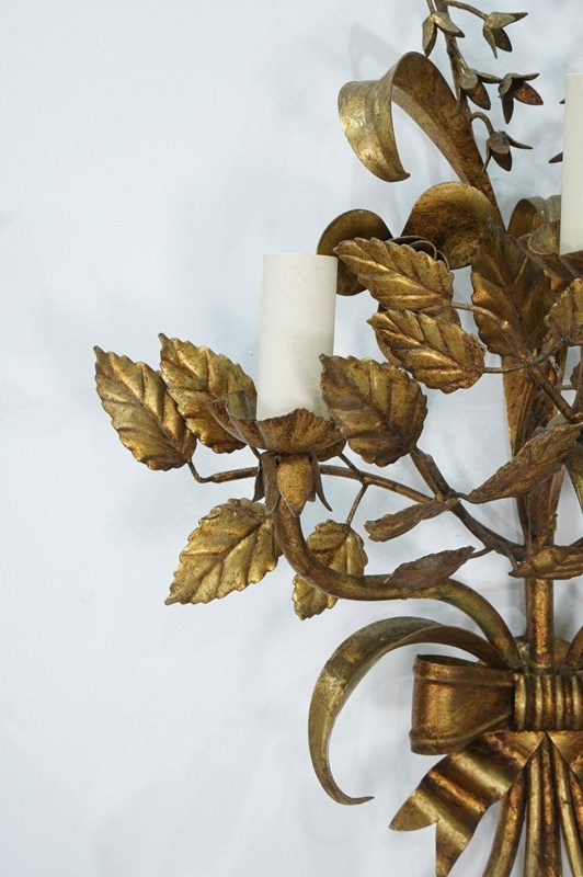 A countryside arrangement of gilt metal leaves and seed heads all ribbon tied create the background for these beautiful mid century wall sconces. A central light above two lower outstretched branches each with a new faux card candle fitting. Newly wired to modern day standards ready for immediate installation. Superb original condition. Gilt metal wall sconces. Italy circa 1950.