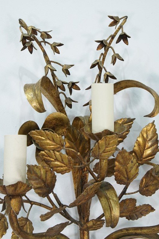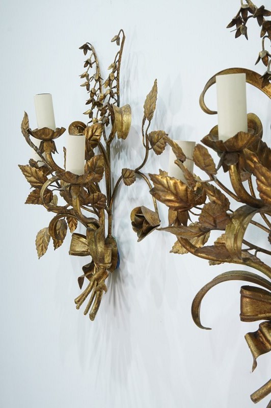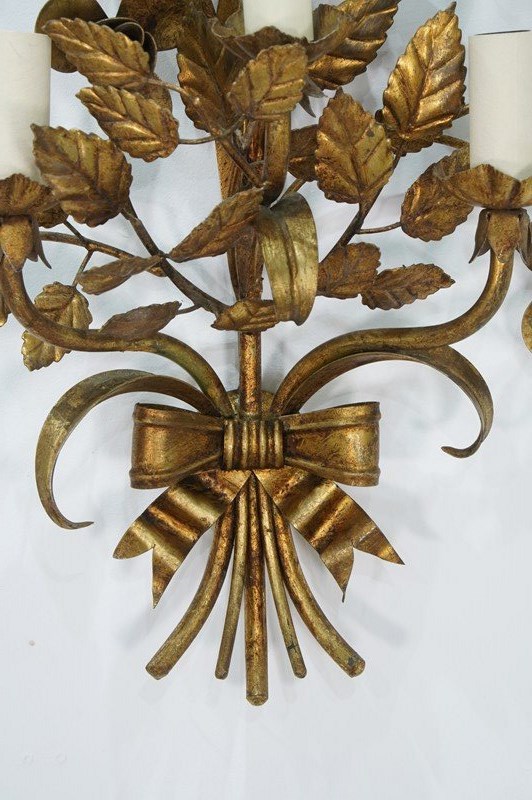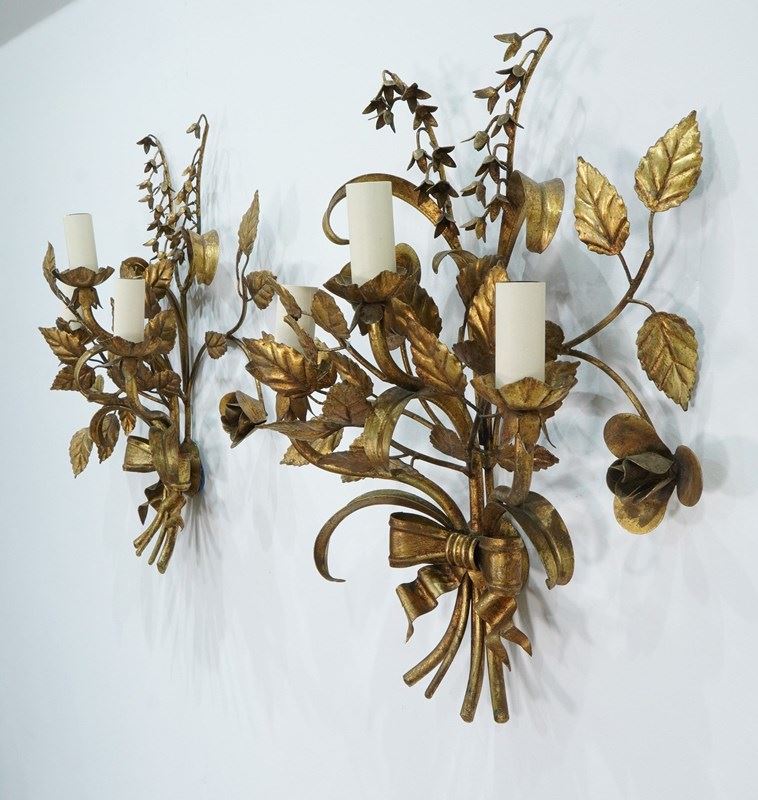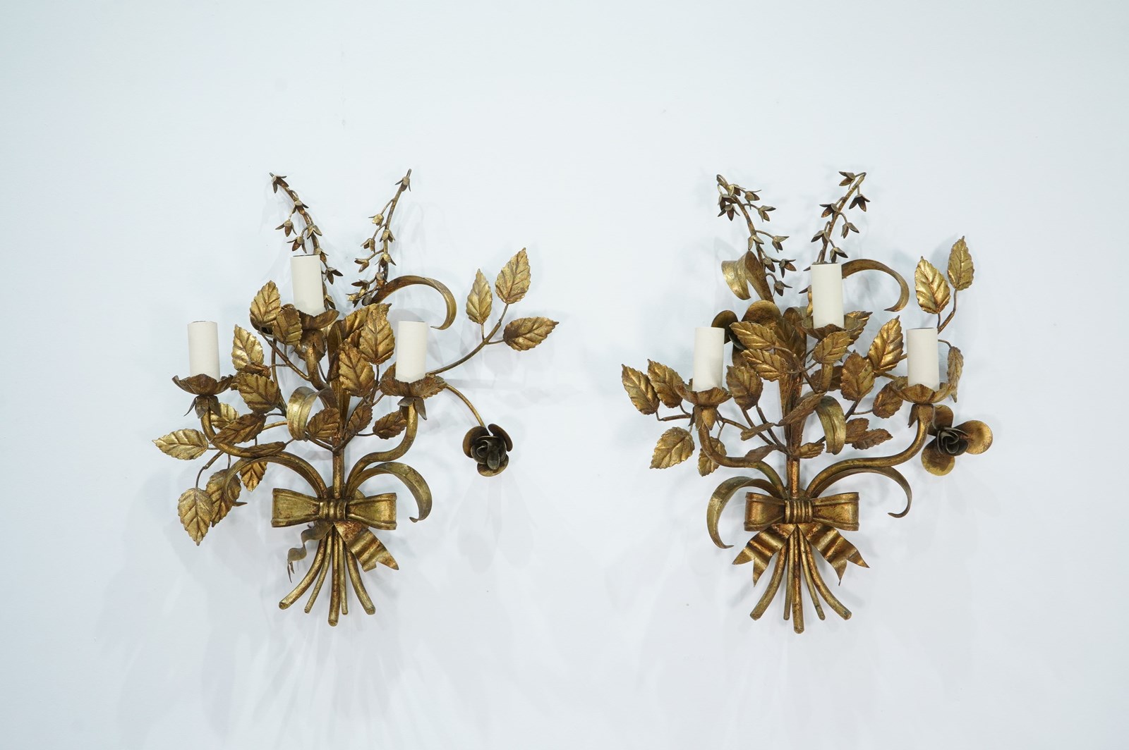 A countryside arrangement of gilt metal leaves and seed heads all ribbon tied create the background for these beautiful mid century wall sconces. A central light above two lower outstretched branches each with a new faux card candle fitting. Newly wired to modern day standards ready for immediate installation. Superb original condition. Gilt metal wall sconces. Italy circa 1950.