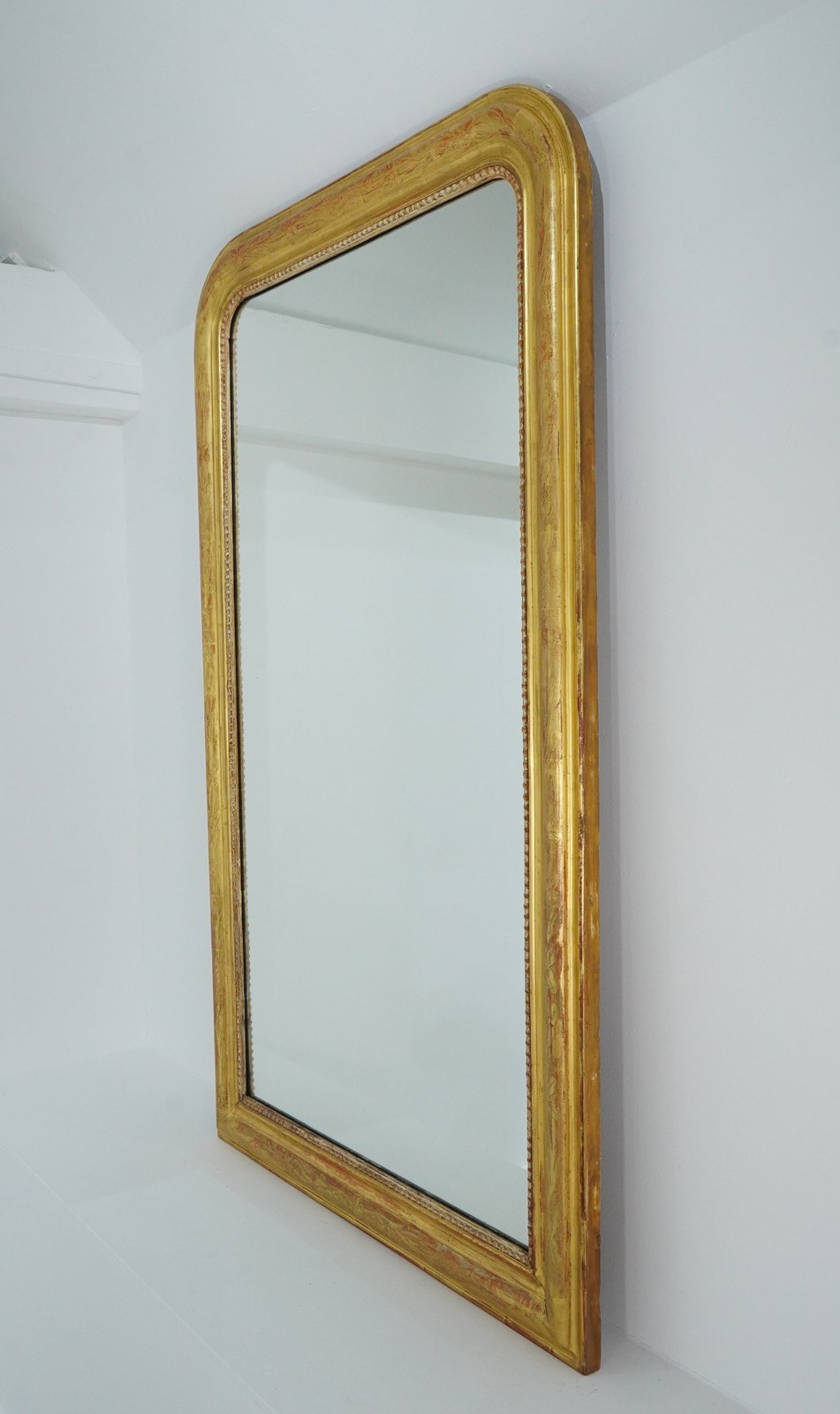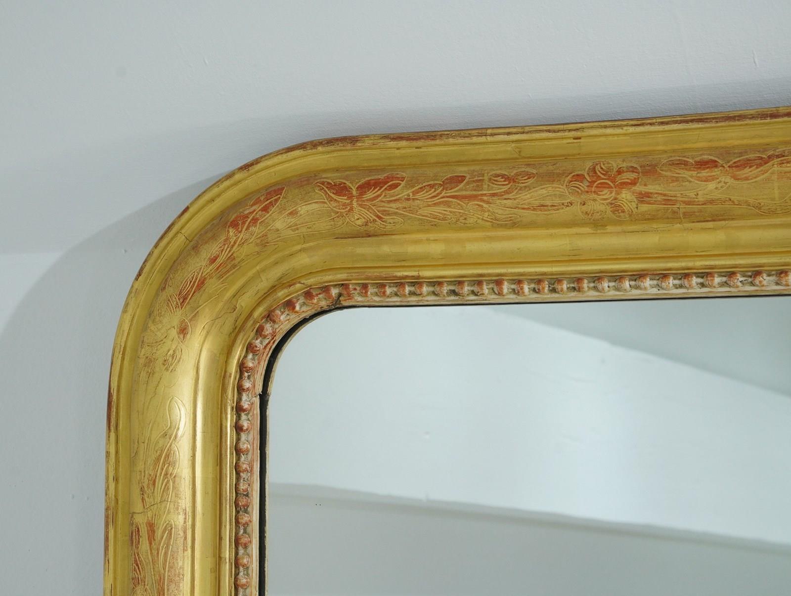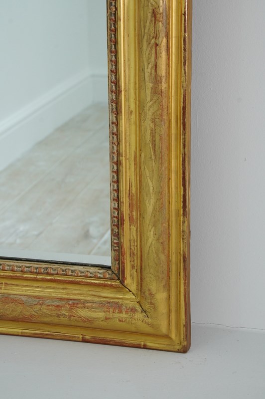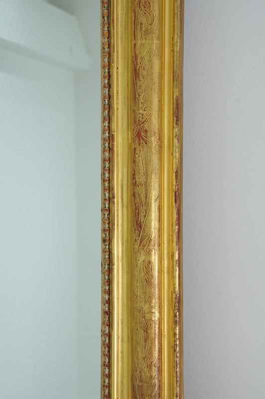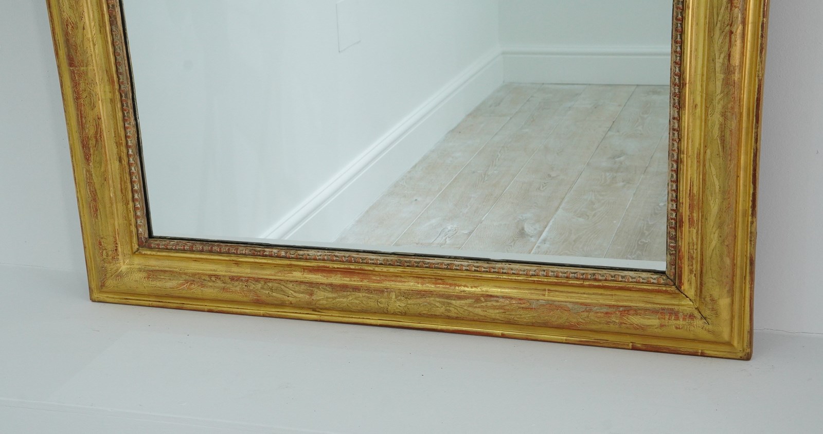 The slightly taller proportions to this pretty 19th century wall mirror are such that it could easily be used floor standing as a dressing mirror. The tall gilded frame has been carefully cleaned highlighting the original gilded surface. The gilding has naturally faded and worn a little over the past century and more revealing the rich warm bole base coat creating a subtle contrast of faded gold and earthy tones of terracotta. A finely etched design of entwining leaves and flowers decorate the entire frame to this iconic French Louis Philippe mirror. A complete row of small gesso beads frame the later glass mirror plate.