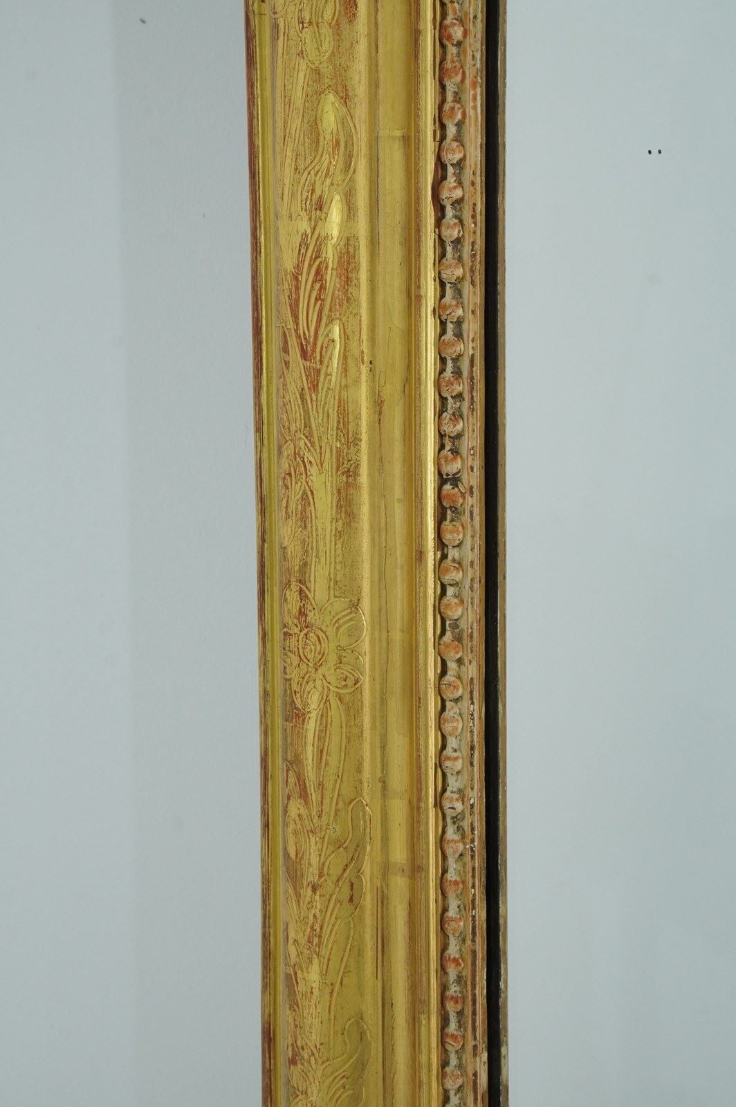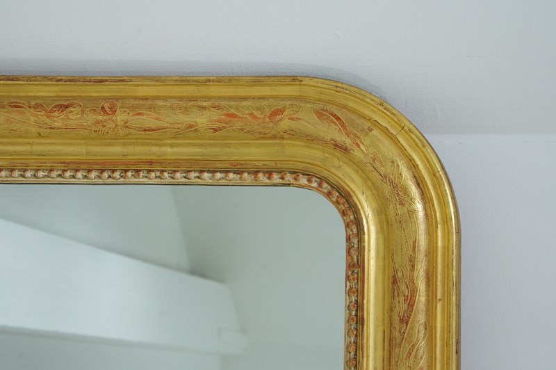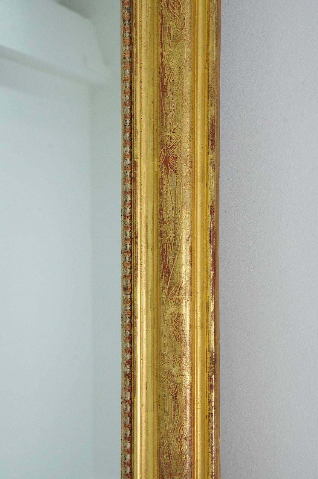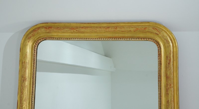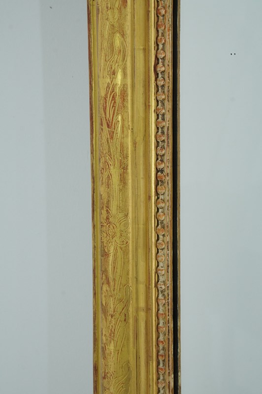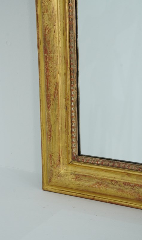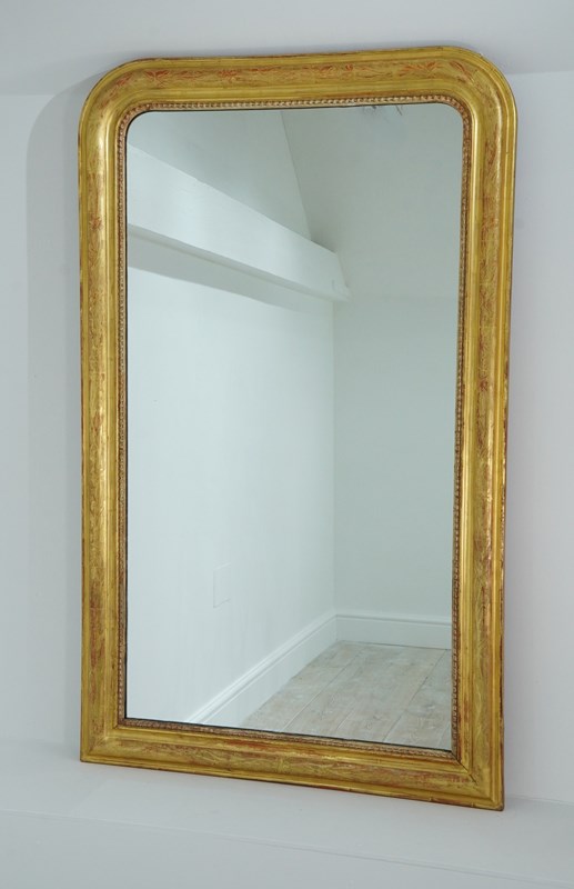 The slightly taller proportions to this pretty 19th century wall mirror are such that it could easily be used floor standing as a dressing mirror. The tall gilded frame has been carefully cleaned highlighting the original gilded surface. The gilding has naturally faded and worn a little over the past century and more revealing the rich warm bole base coat creating a subtle contrast of faded gold and earthy tones of terracotta. A finely etched design of entwining leaves and flowers decorate the entire frame to this iconic French Louis Philippe mirror. A complete row of small gesso beads frame the later glass mirror plate.