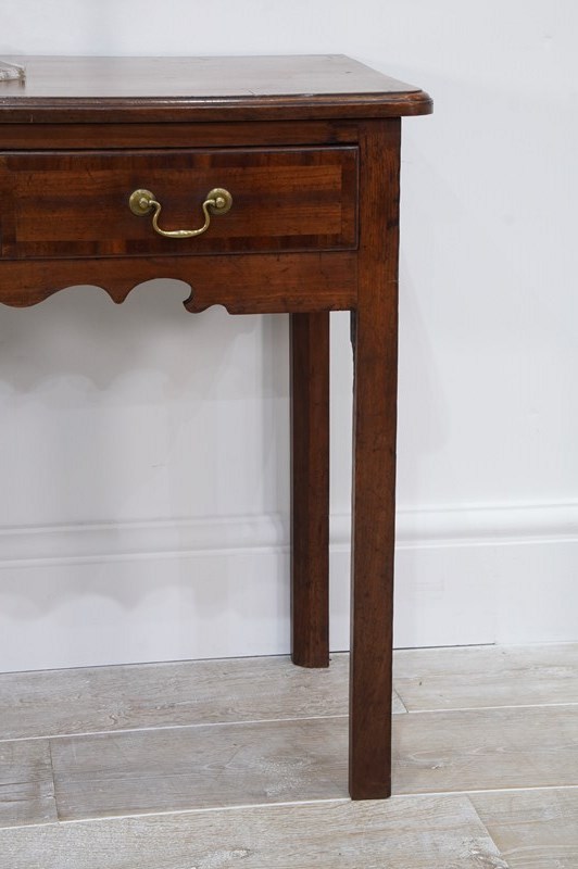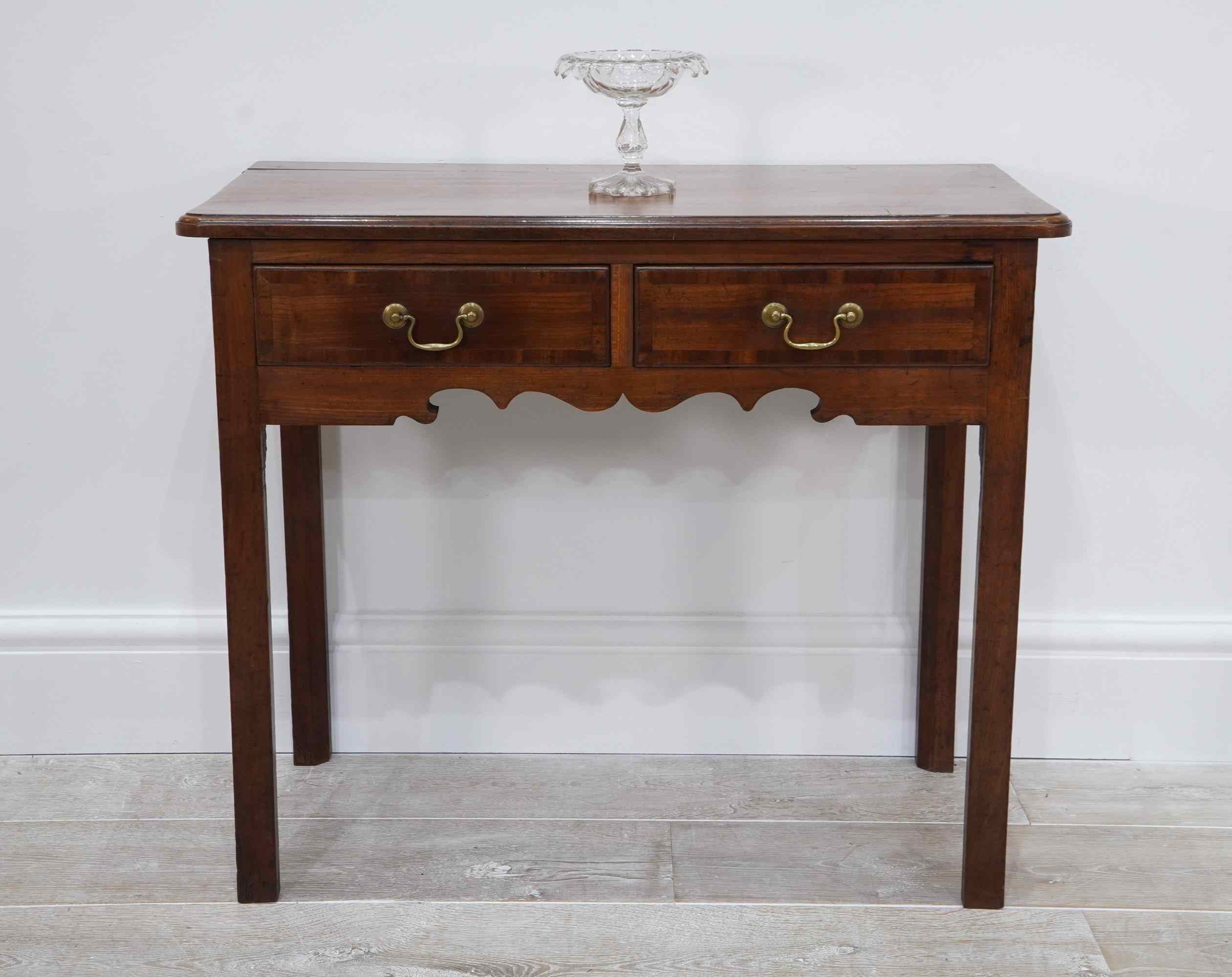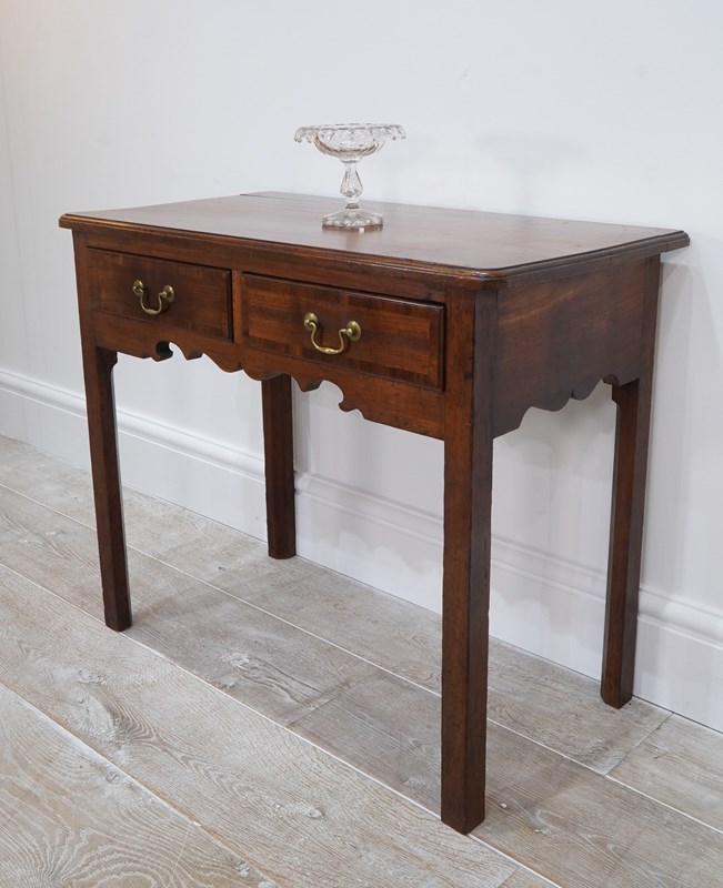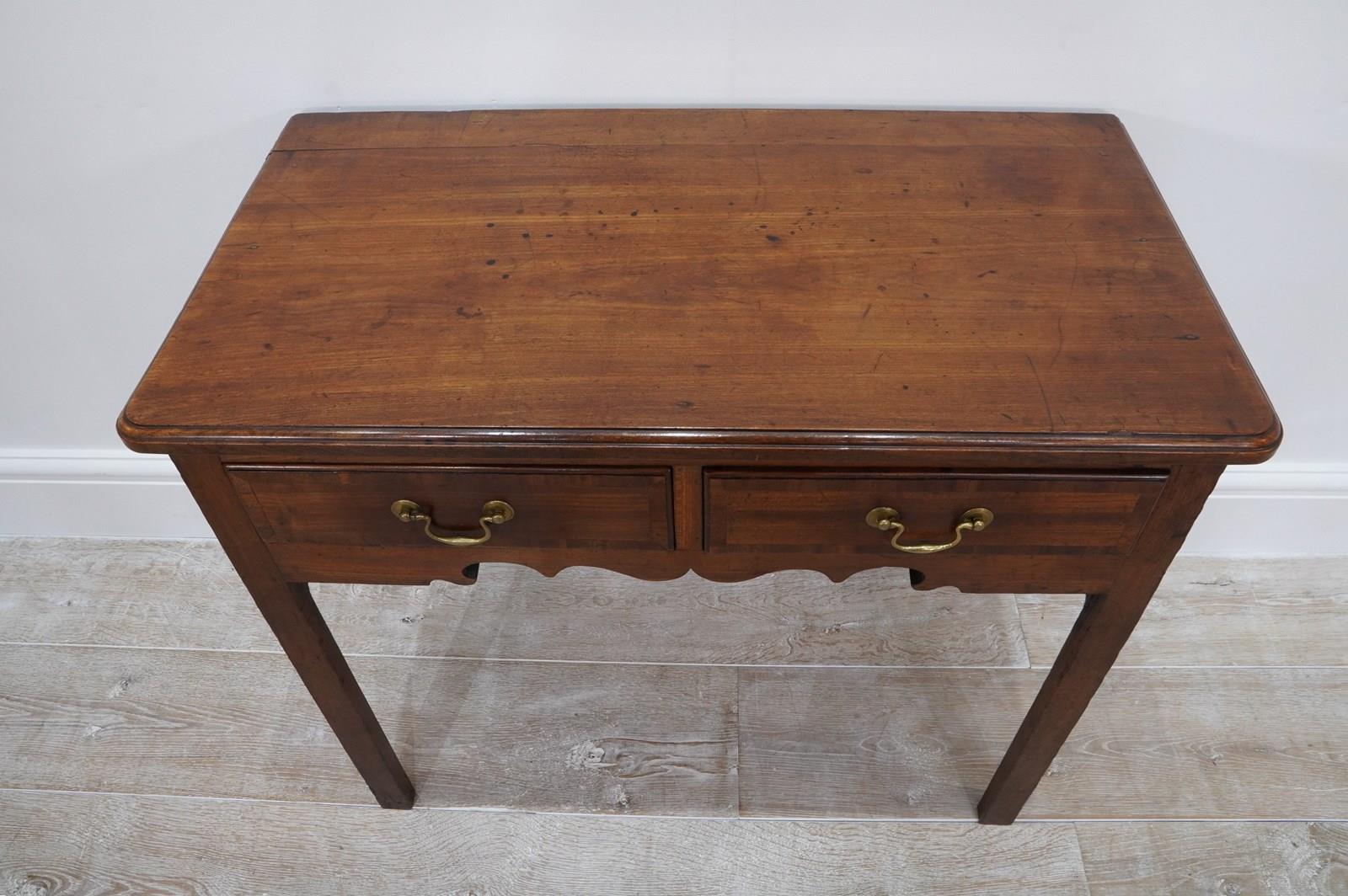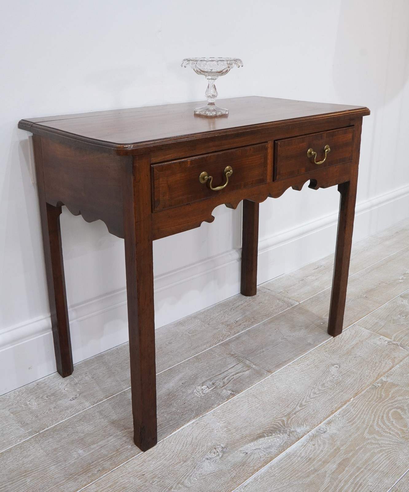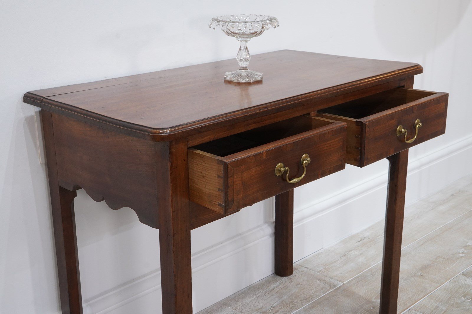 An English Georgian lowboy. The solid cherrywood timbers to this pretty low boy / side table have mellowed to a deep rich honey colour over the past two centuries. Two drawers with original swan neck handles above a pretty shaped frieze. Raised on solid cherrywood legs with neat chamfered edges. Unusual to find an English lowboy in cherrywood. Superb original condition.