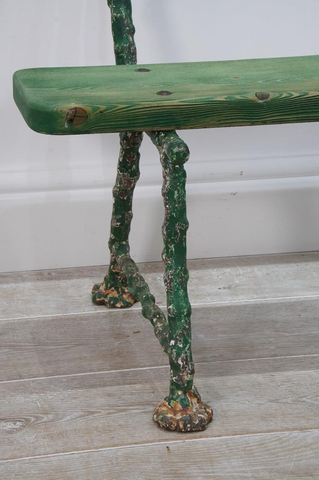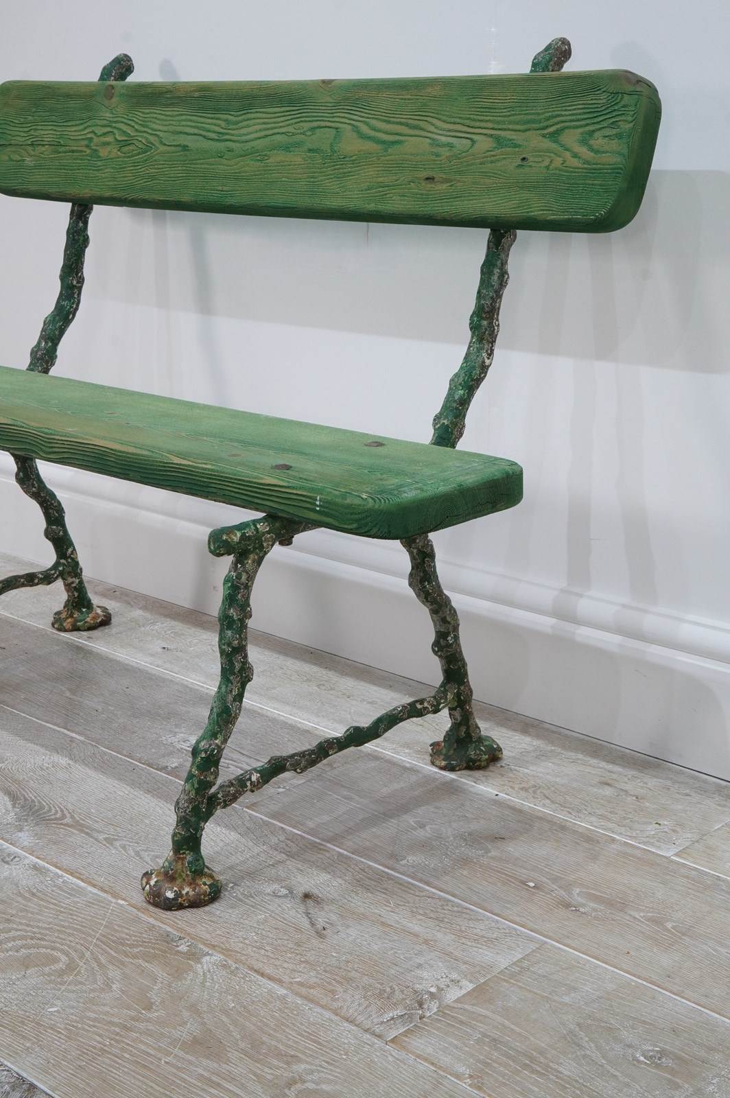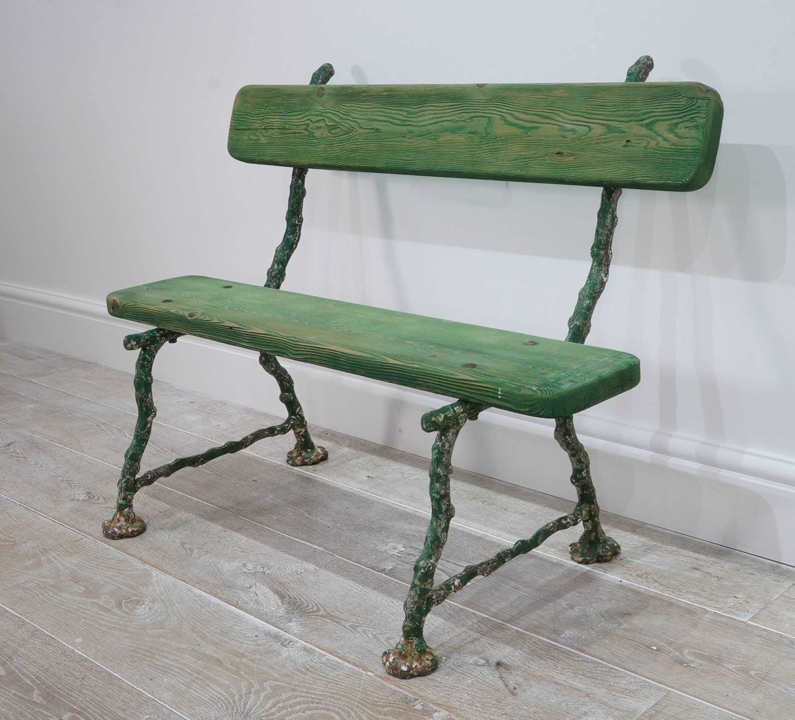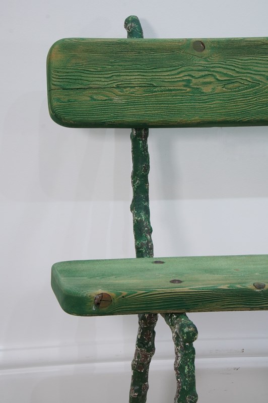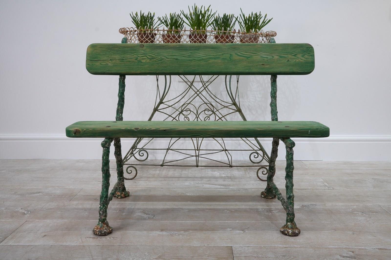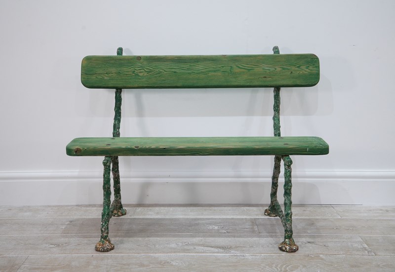 A small 19th century two seater cast iron garden bench. The ends to this pretty bench are cast in the form thick garden twigs hand scraped back to the original painted surface. Original pine seat and back rest.