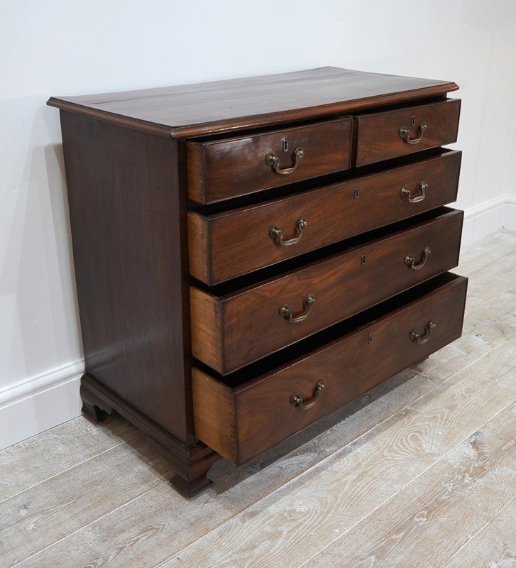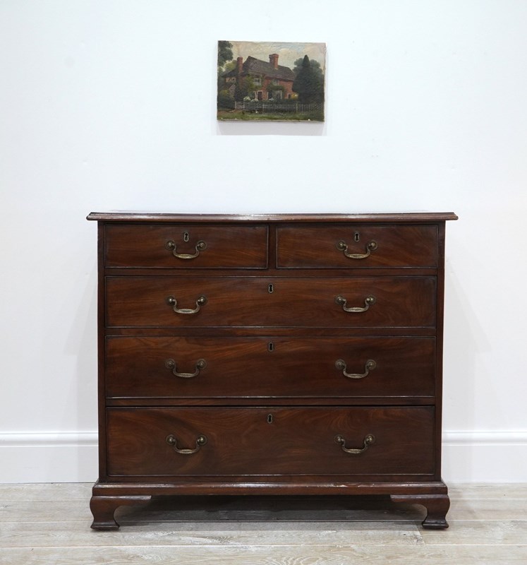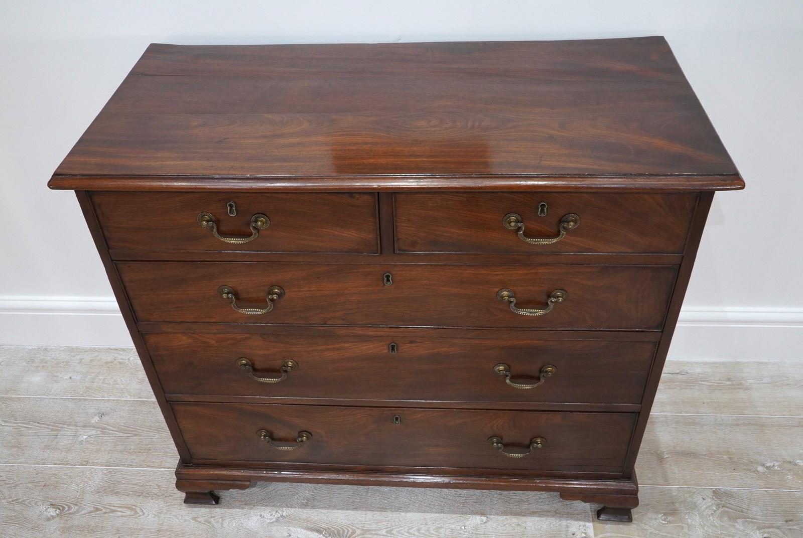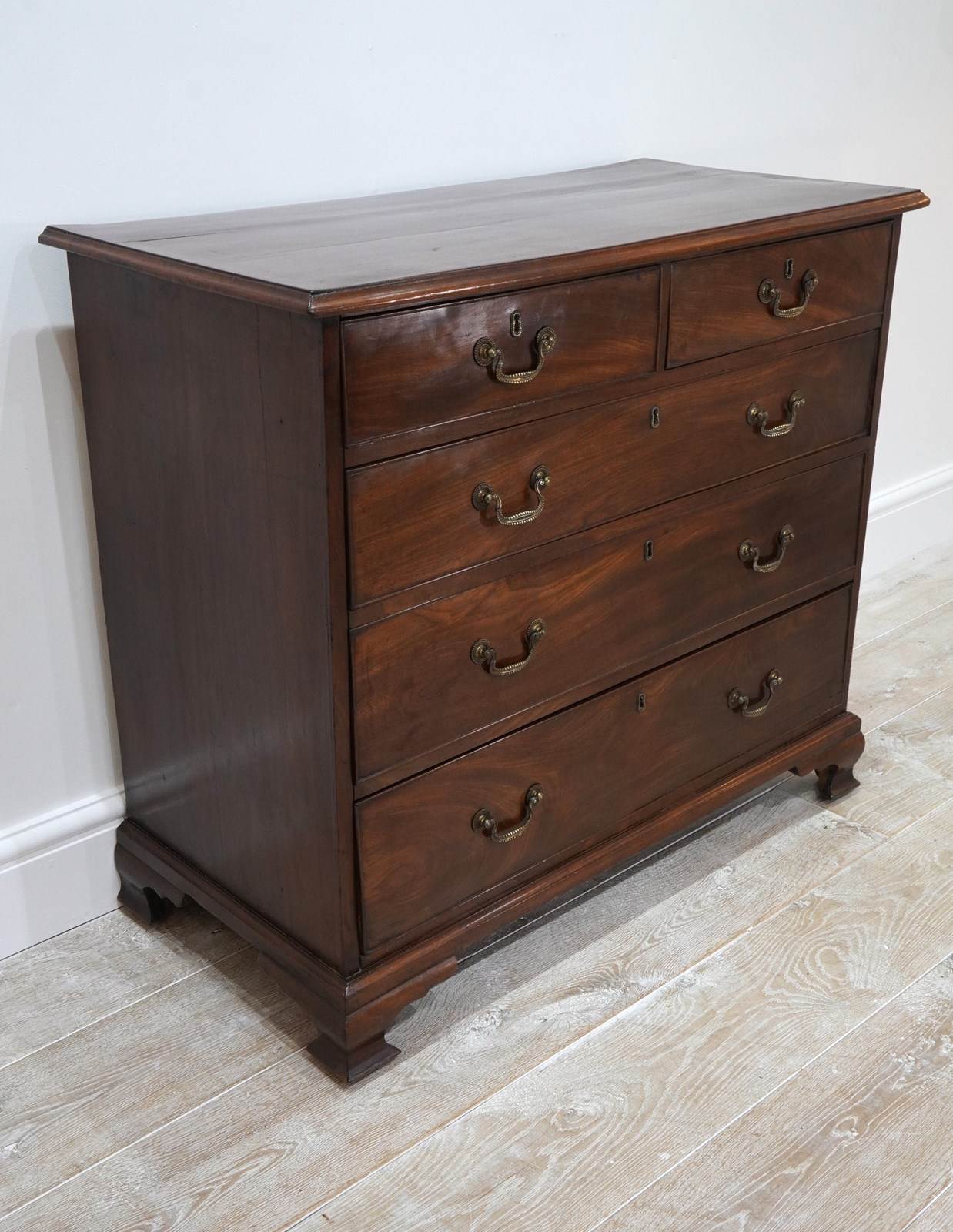 The chest stands well on four low shapely ogee bracket feet and comprises of five deep drawers within a solid mahogany carcass. The sides are strong and solid. The top has a particularly nice grain running through the mahogany with no unsightly marks. The drawers are oak lined, fit neatly and run with ease and have managed to retain the original decorative brass handles and matching escutcheons boasting quite a feature to this handsome chest.