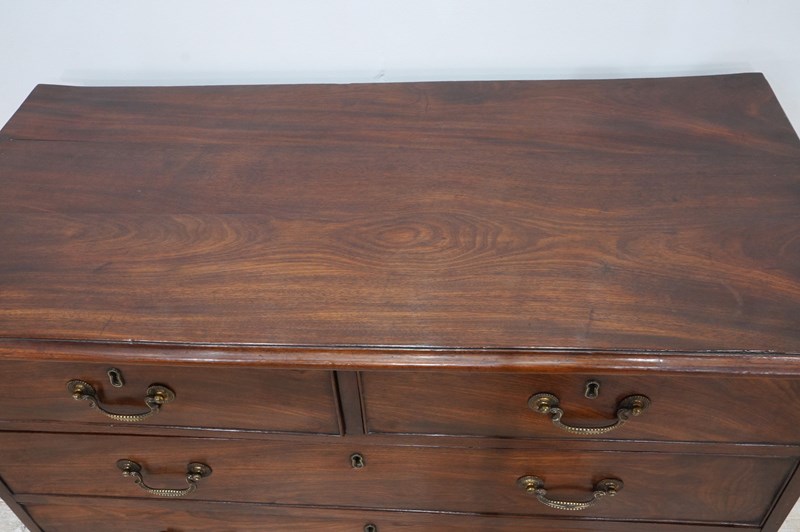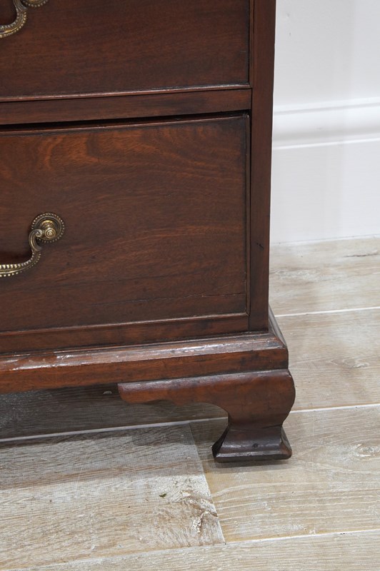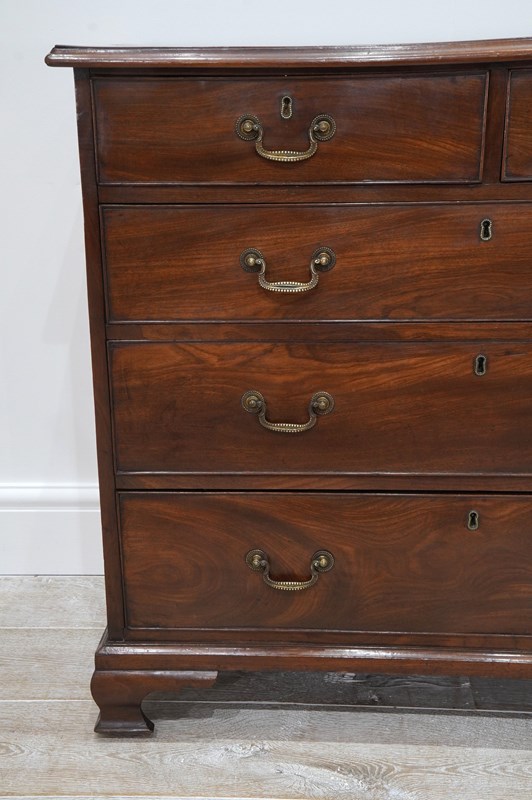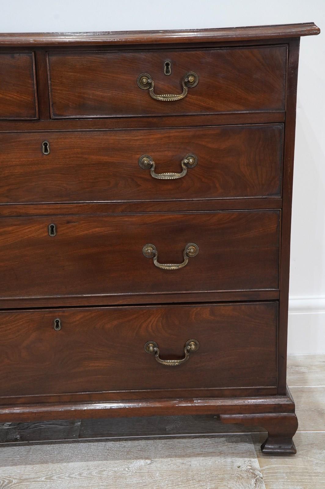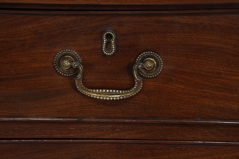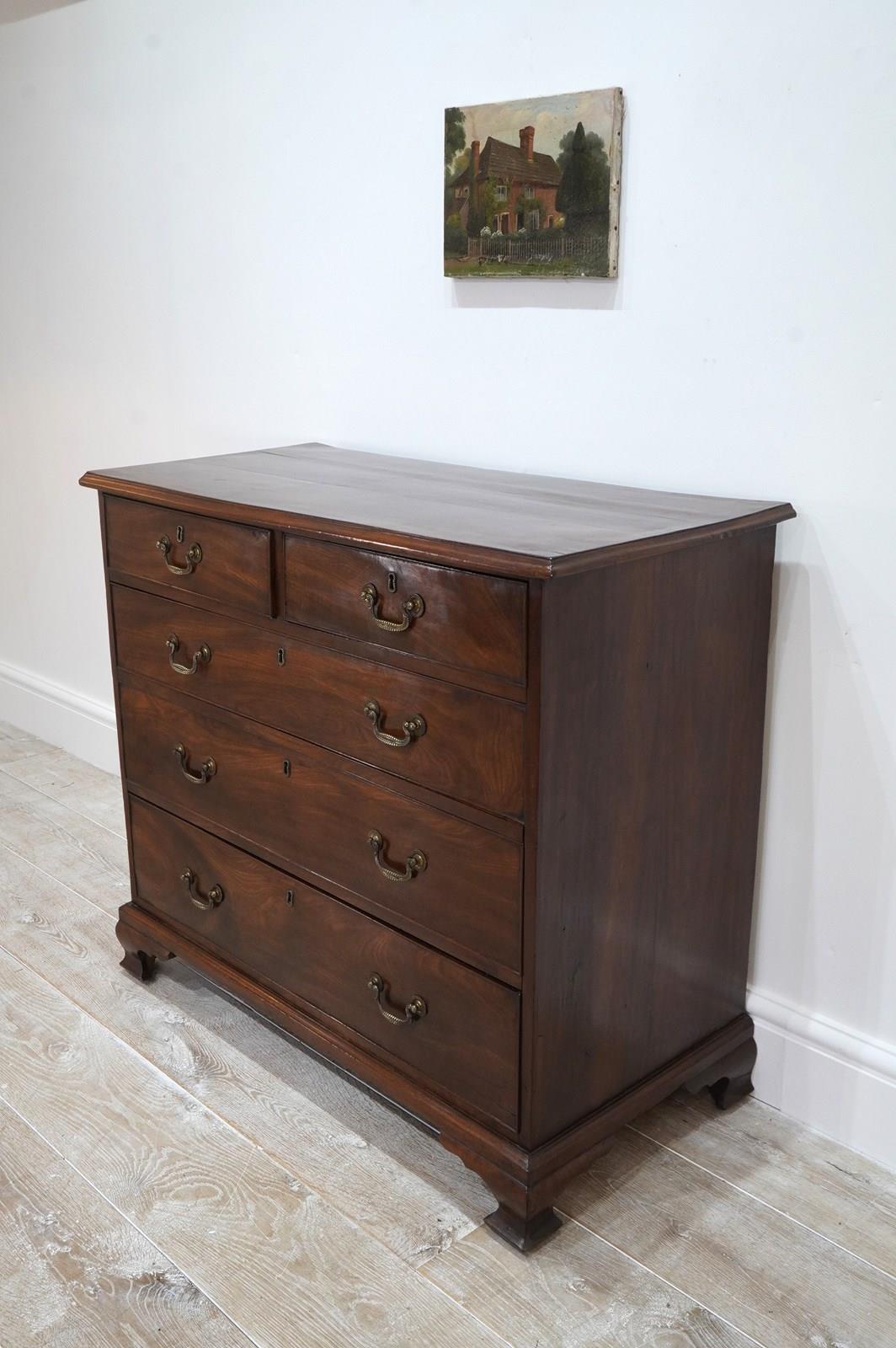 The chest stands well on four low shapely ogee bracket feet and comprises of five deep drawers within a solid mahogany carcass. The sides are strong and solid. The top has a particularly nice grain running through the mahogany with no unsightly marks. The drawers are oak lined, fit neatly and run with ease and have managed to retain the original decorative brass handles and matching escutcheons boasting quite a feature to this handsome chest.