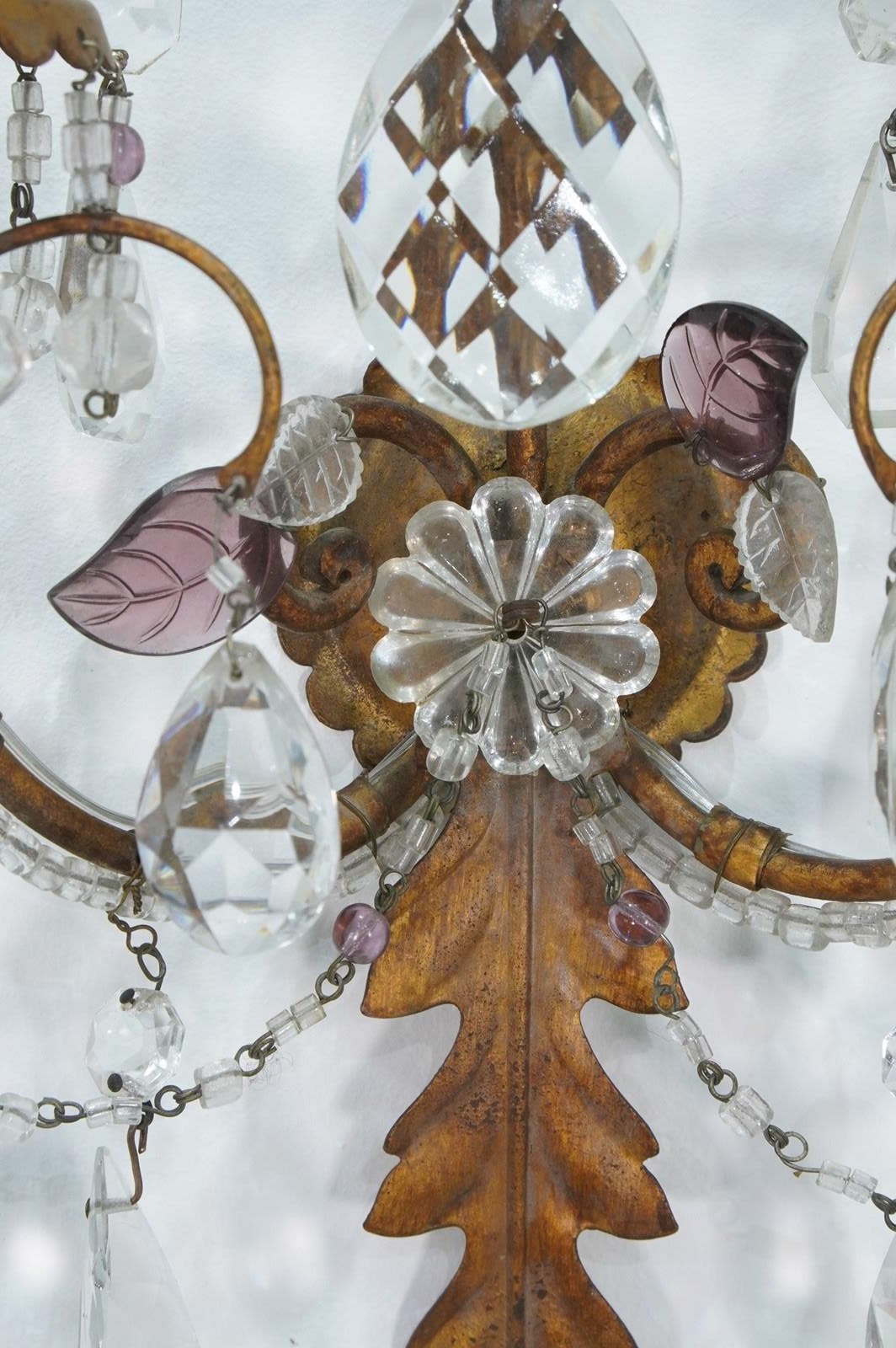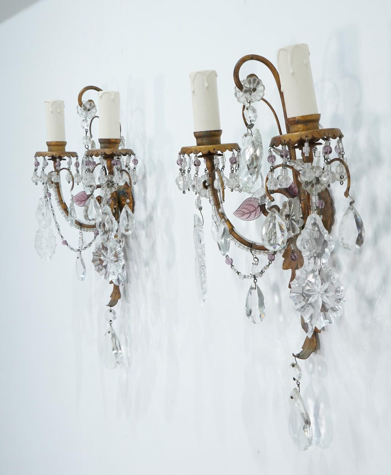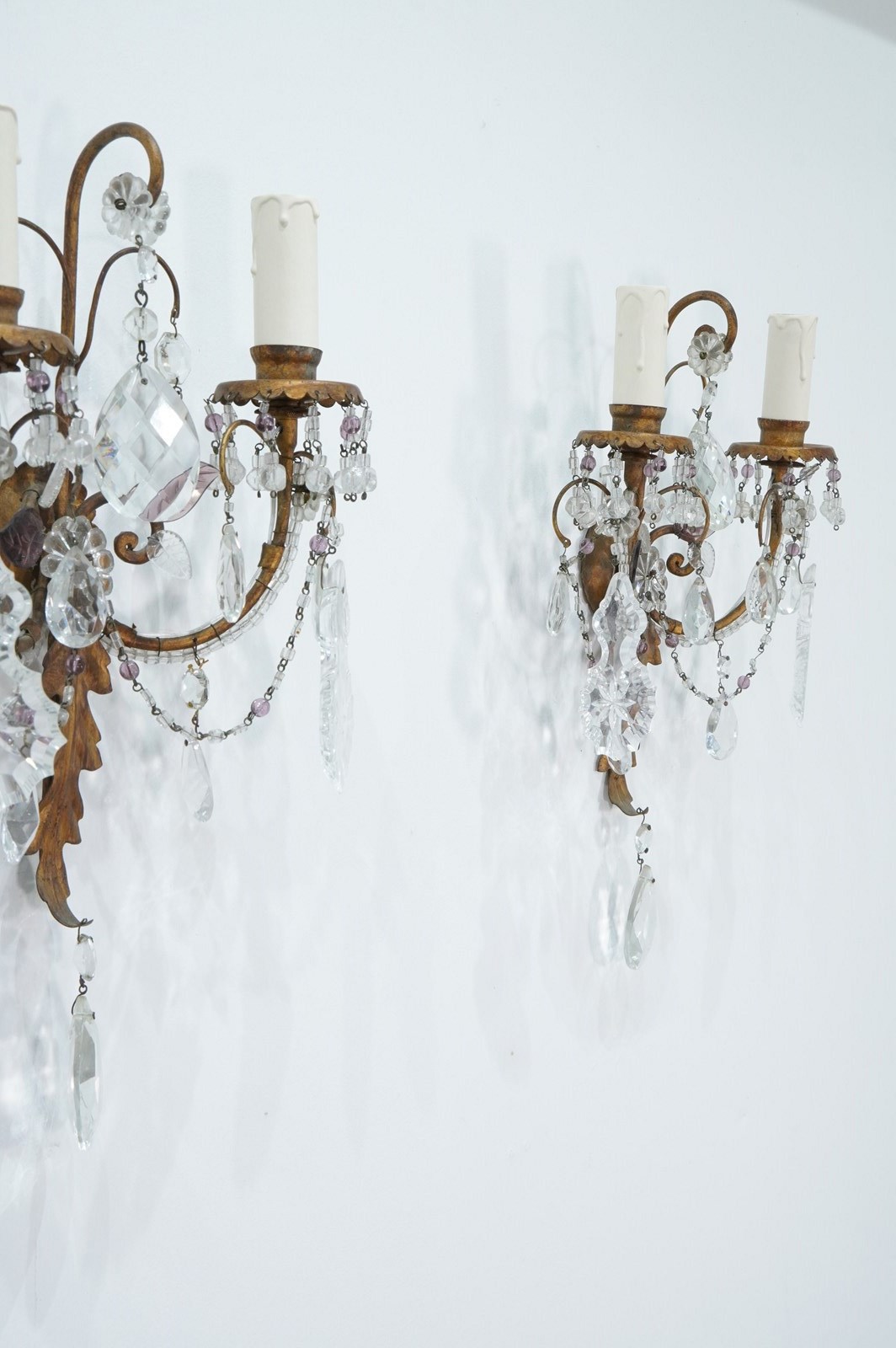 The prettiest pair of mid century twin branch wall sconces. Two outward scrolling arms terminating with faux card light fittings above gilt metal drip pans. The whole being dressed with a mass of faceted clear glass drops and lozenges interspersed with additional pale Amethyst glass leaves. Italy circa 1950.