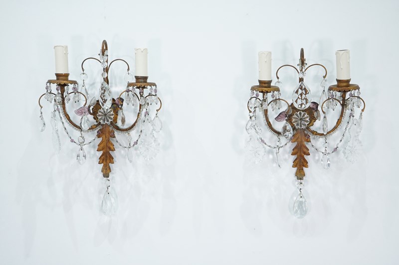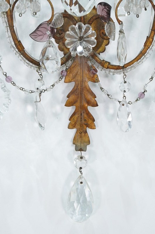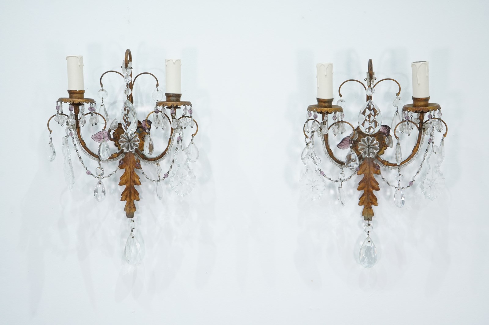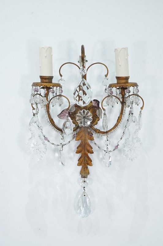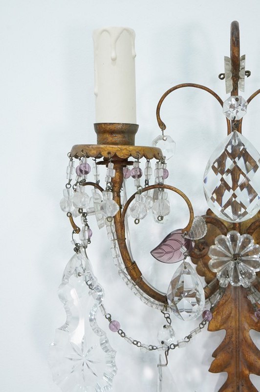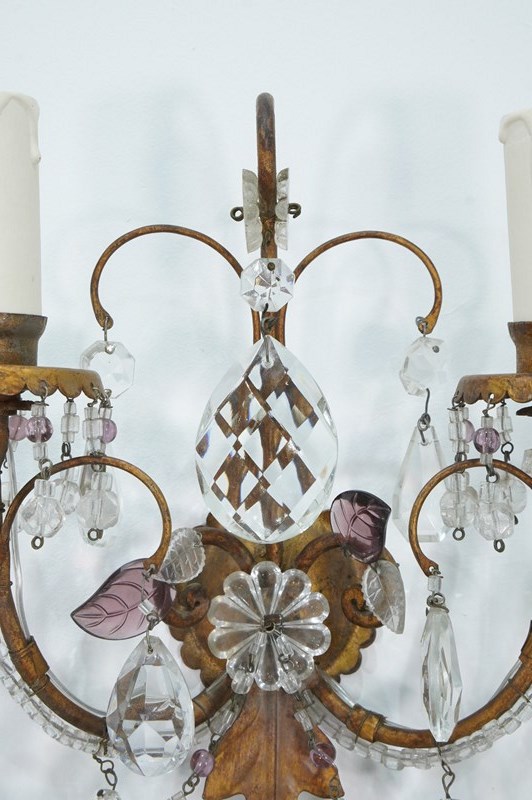 The prettiest pair of mid century twin branch wall sconces. Two outward scrolling arms terminating with faux card light fittings above gilt metal drip pans. The whole being dressed with a mass of faceted clear glass drops and lozenges interspersed with additional pale Amethyst glass leaves. Italy circa 1950.