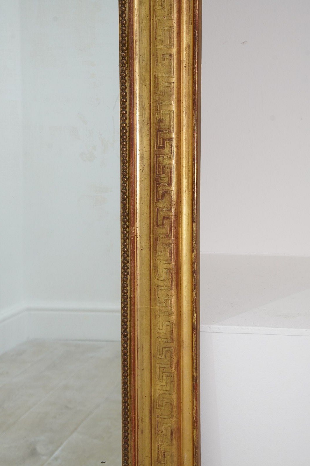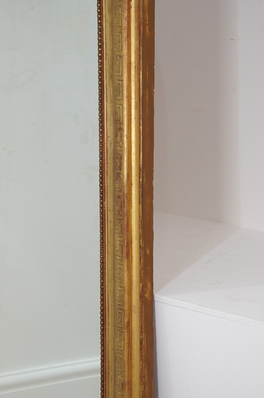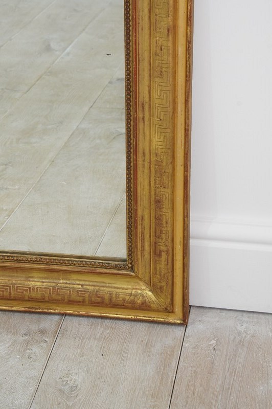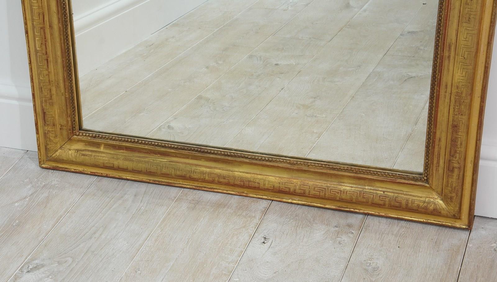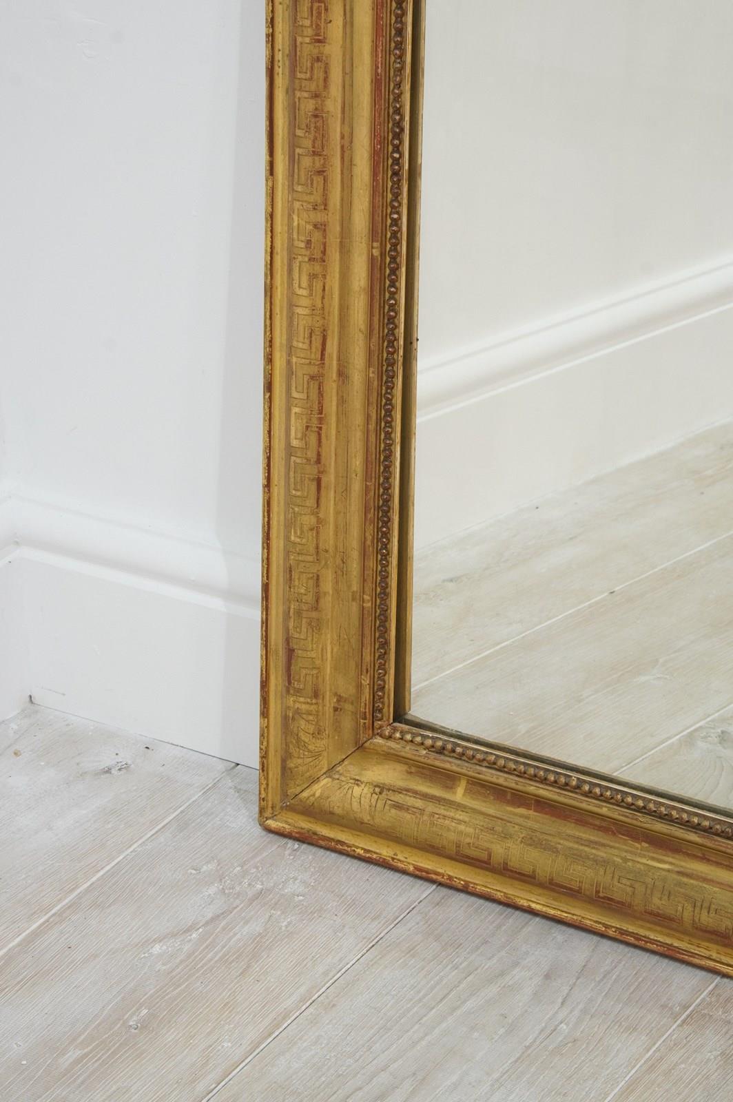 A super large French gilded wall mirror boasting such marvellous proportions that it could easily be used free standing as a leaner mirror should it be required to do so. The gilded surface is etched with a Greek key pattern around the entire frame, the gilding is bright and lustrous with just the occasional age related rub marks. The original mirror plate is flawless giving uninterrupted reflection. later back board. French gilded mirror circa 1840.