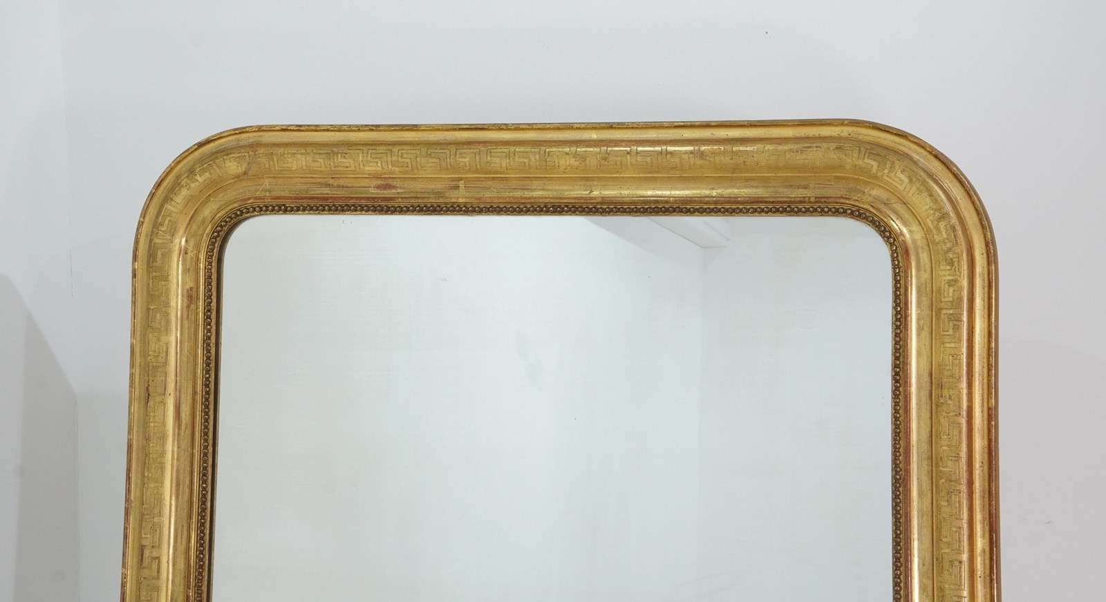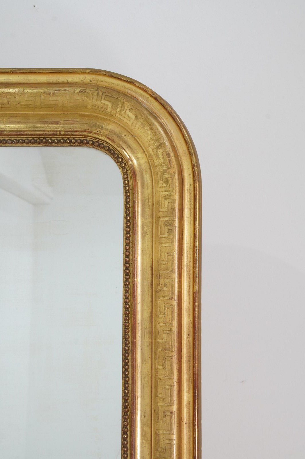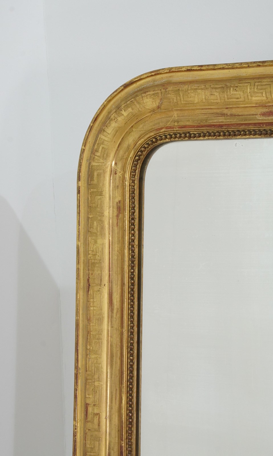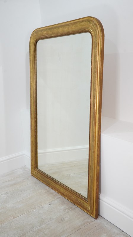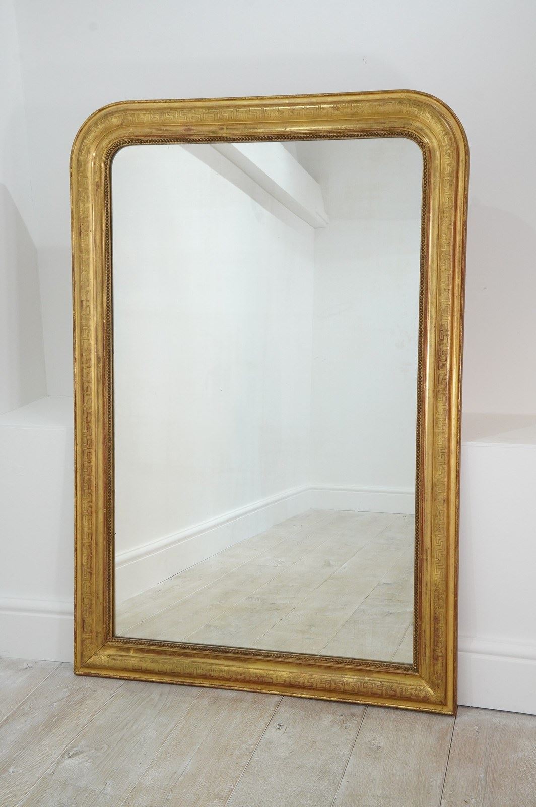 A super large French gilded wall mirror boasting such marvellous proportions that it could easily be used free standing as a leaner mirror should it be required to do so. The gilded surface is etched with a Greek key pattern around the entire frame, the gilding is bright and lustrous with just the occasional age related rub marks. The original mirror plate is flawless giving uninterrupted reflection. later back board. French gilded mirror circa 1840.