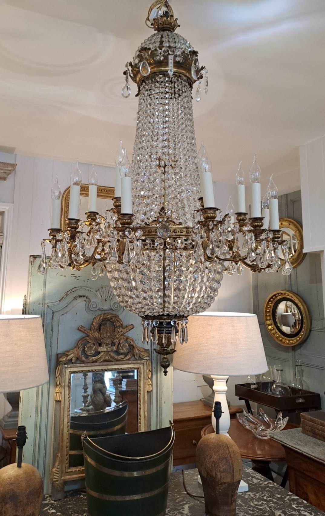 Below the dome sits a decorative gilded ring with alternating lead crystal icicles and drops with a further arrangement of long graceful strands cascading down to a second larger gilded hoop representing the tented body of the chandelier. The hoop supports six triple candle fittings with an impressive eighteen lights in total each light fitting housed within a quality cream card faux candle. Below the hoop a lower section is suspended with further strands of cut glass beads. To the base of the beaded bag is a decorative turned ebony and gilded brass finial. The individual strands of diamond shaped beads, icicles and drops have all been carefully removed, hand washed and polished for extra sparkle. The whole piece completely checked for any damaged or missing parts, replaced where necessary and so reassembled to perfection. Newly wired and safety PAT tested. Ready for immediate installation. France circa 1900. weight 28 kgs / 61 lbs.