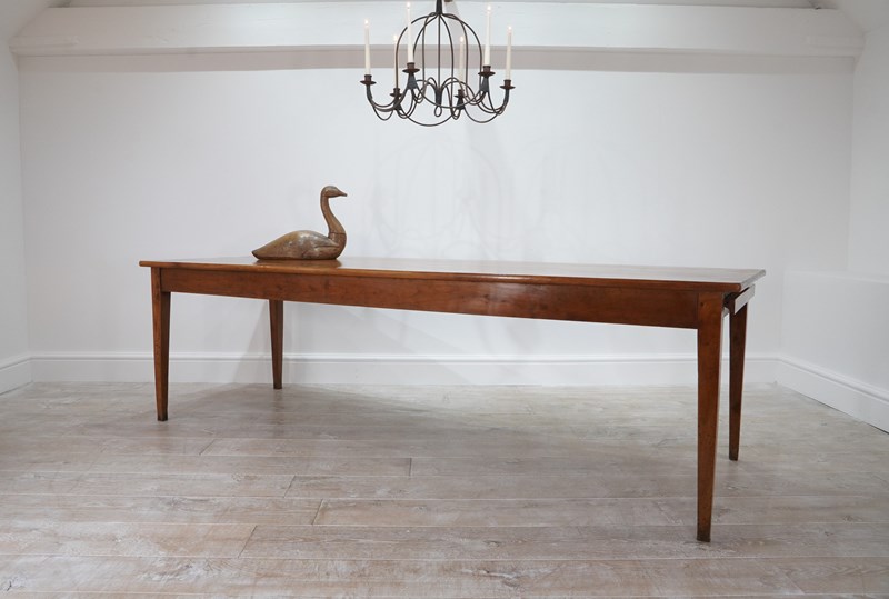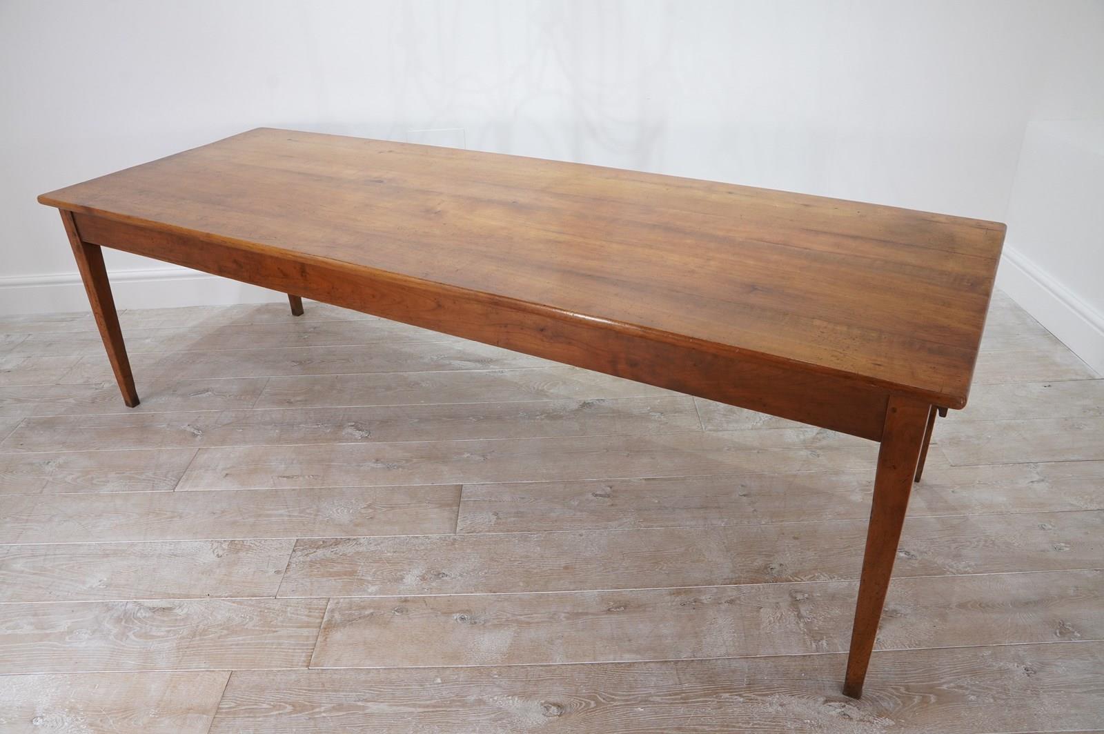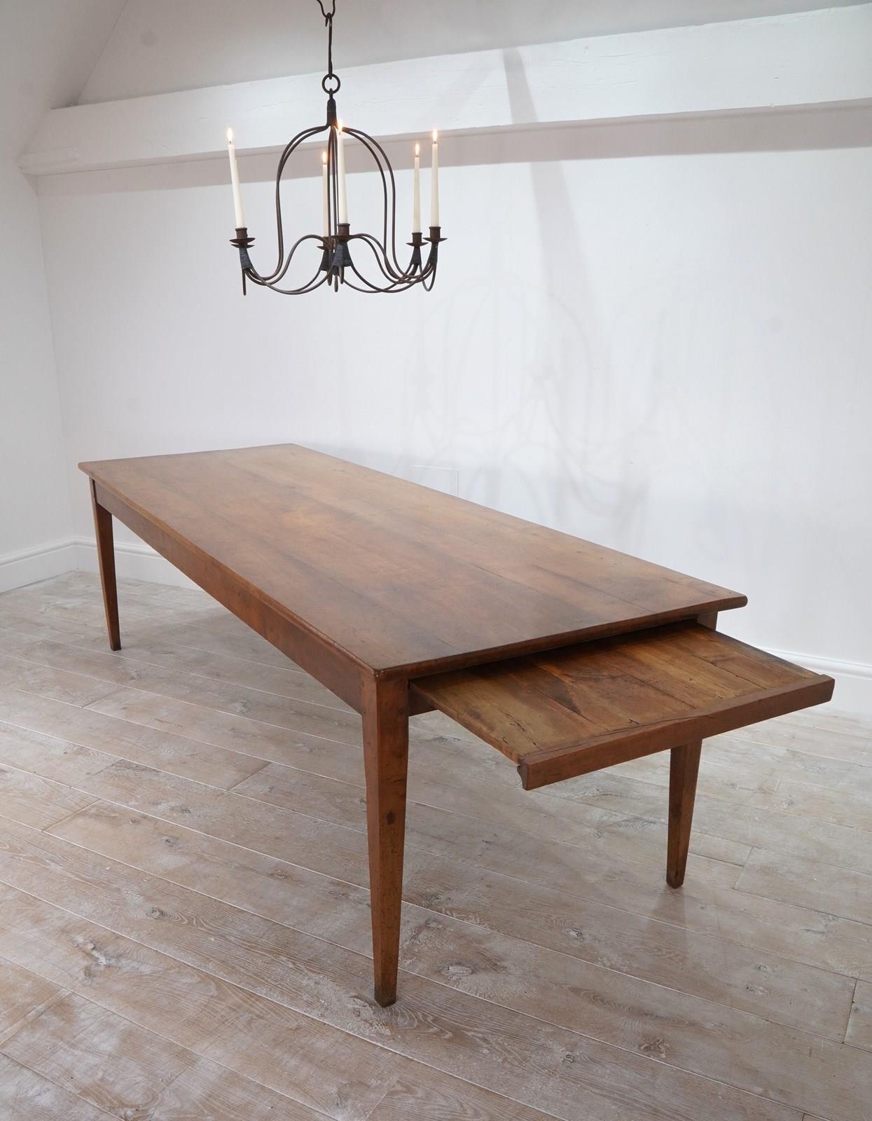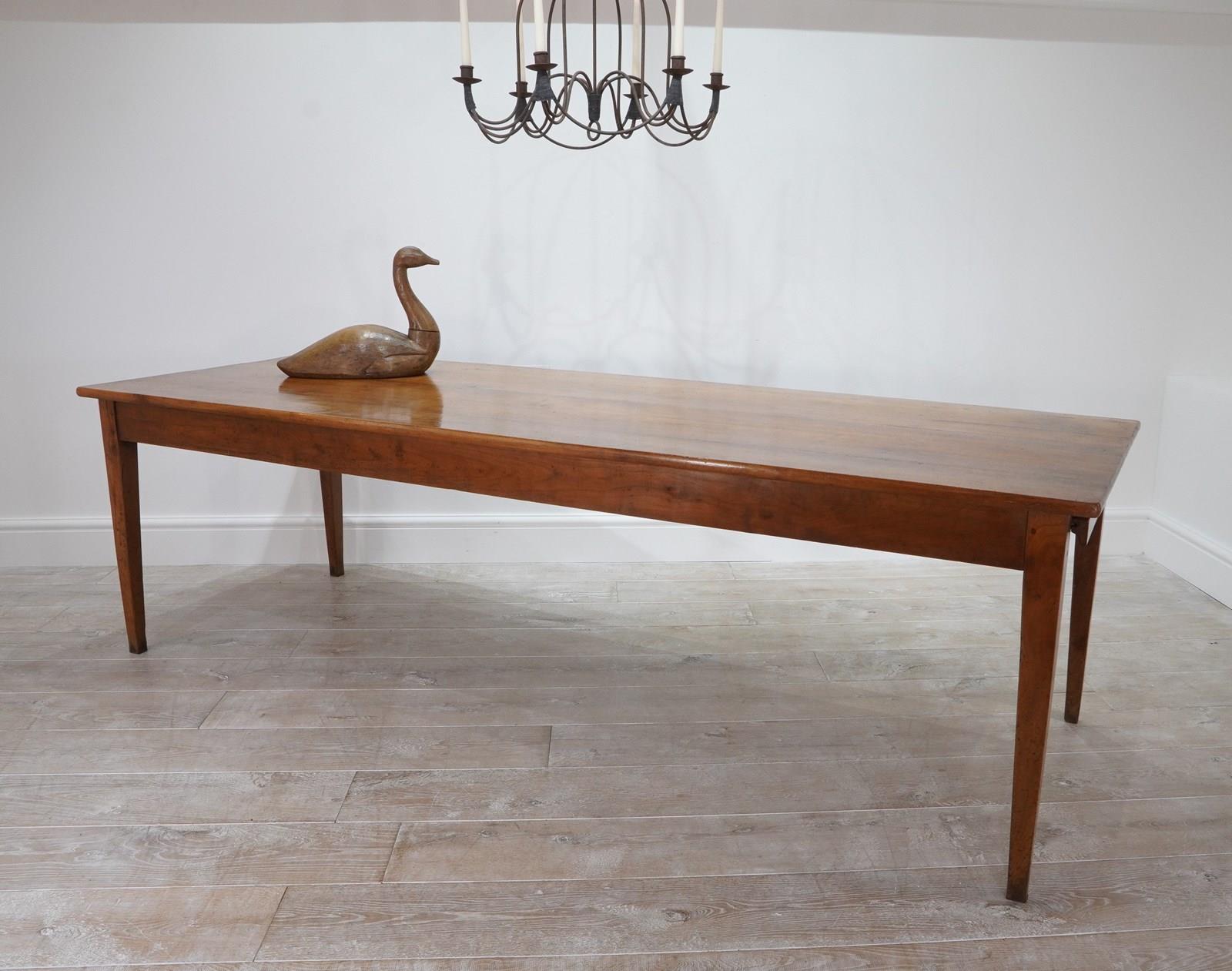 A French cherrywood dining table of superior proportions being an impressive 2.5 metres long by 89 cm wide. The top to this beautiful table consists of four solid cherrywood timbers with the bonus of a bread slide to one end allowing another 40 cm length in surface space if required. The timbers have developed the most glorious soft colour over the past near two centuries together with a richly patinated surface. It stands well on four elegant tapering legs at the correct knee height, perfect for comfortable dining. The table top has a neatly closed flat surface with no gaps or wobbles and will easily seat 10 / 12 dinner guests. Solid cherrywood dining table circa 1850.