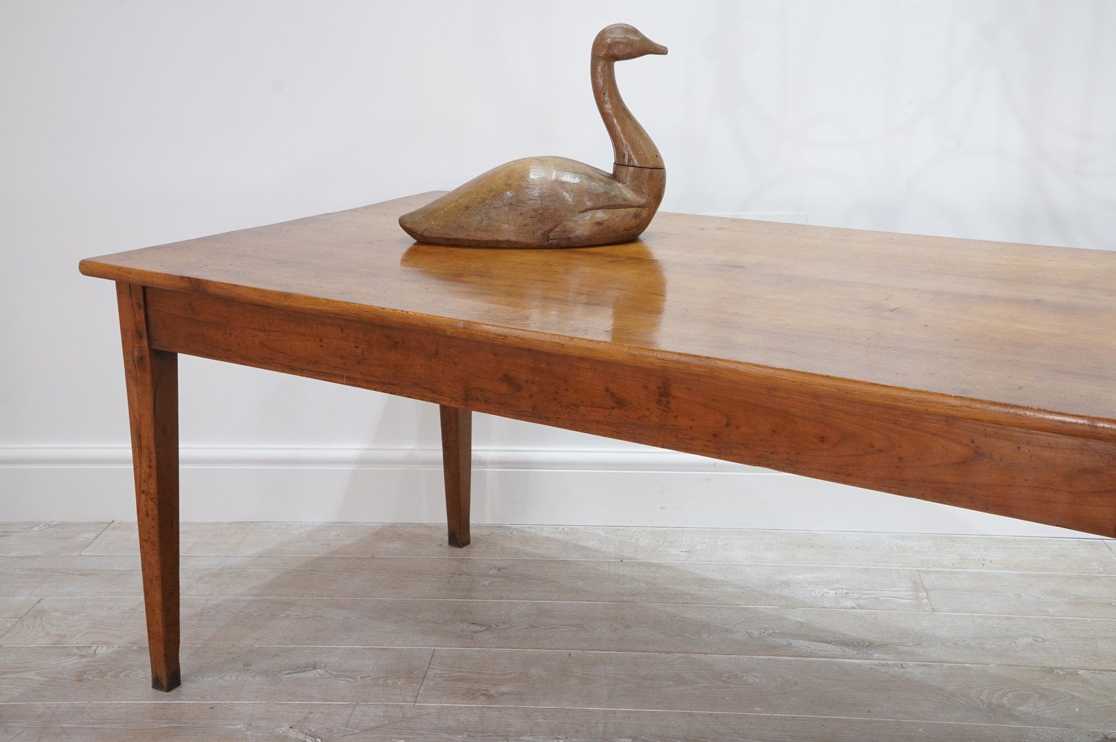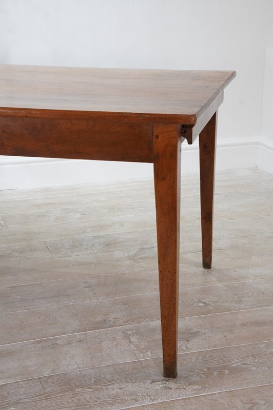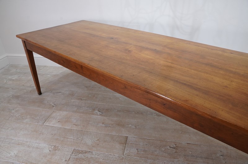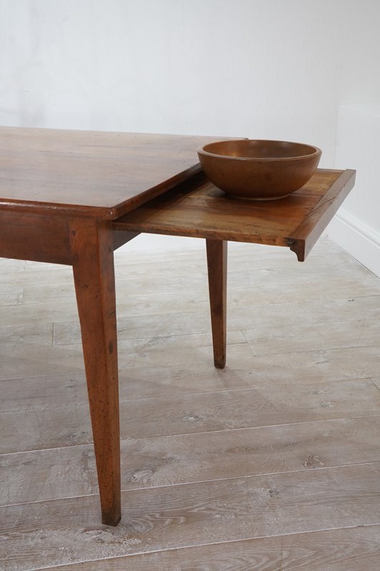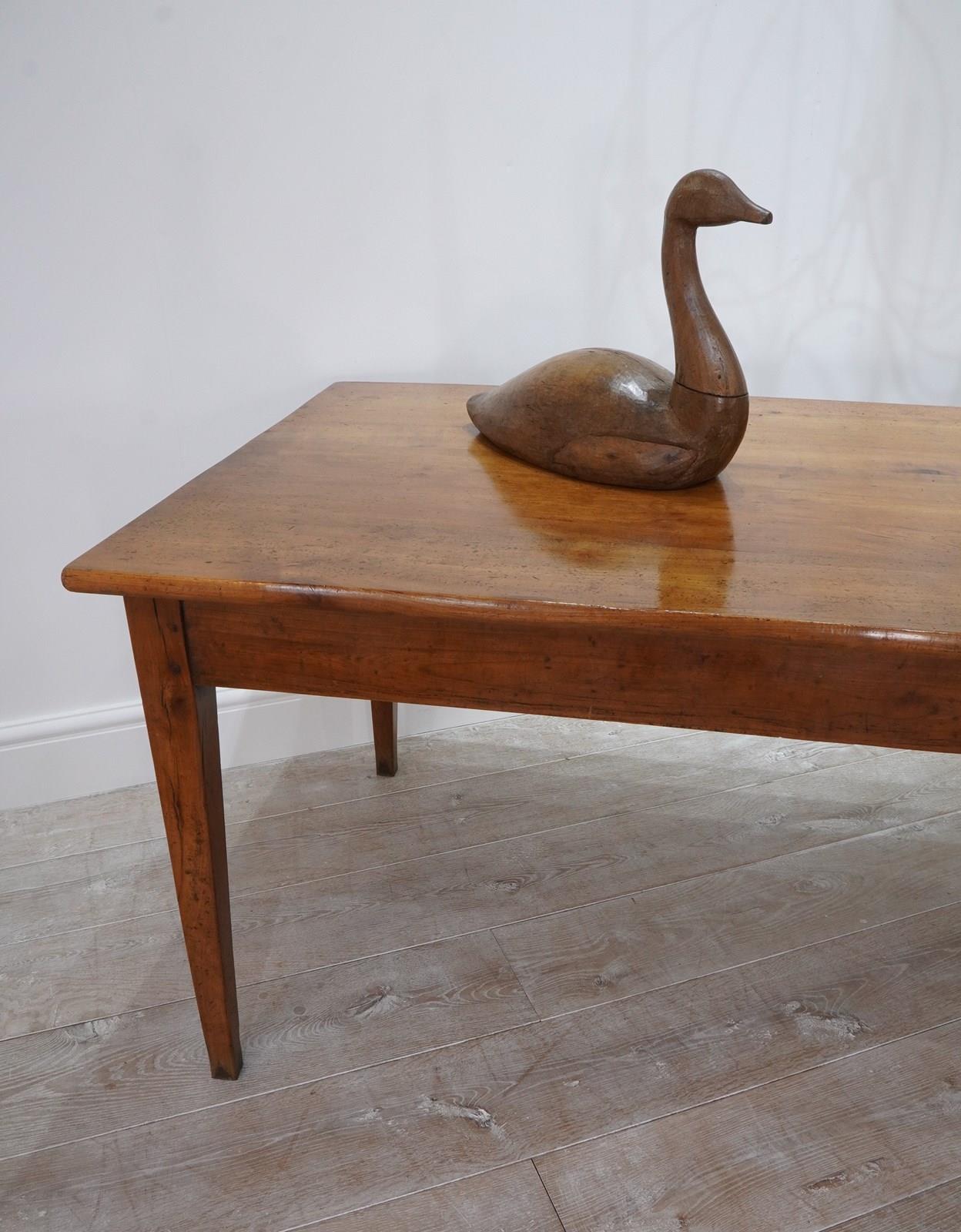 A French cherrywood dining table of superior proportions being an impressive 2.5 metres long by 89 cm wide. The top to this beautiful table consists of four solid cherrywood timbers with the bonus of a bread slide to one end allowing another 40 cm length in surface space if required. The timbers have developed the most glorious soft colour over the past near two centuries together with a richly patinated surface. It stands well on four elegant tapering legs at the correct knee height, perfect for comfortable dining. The table top has a neatly closed flat surface with no gaps or wobbles and will easily seat 10 / 12 dinner guests. Solid cherrywood dining table circa 1850.