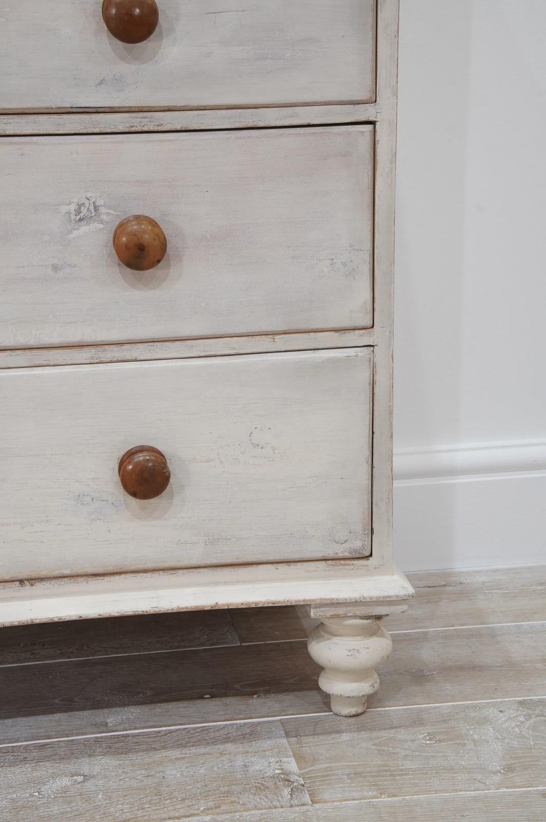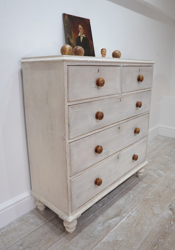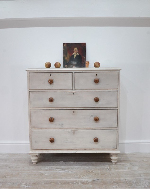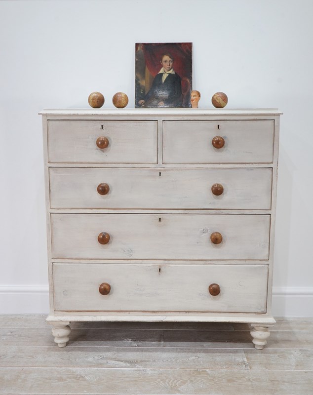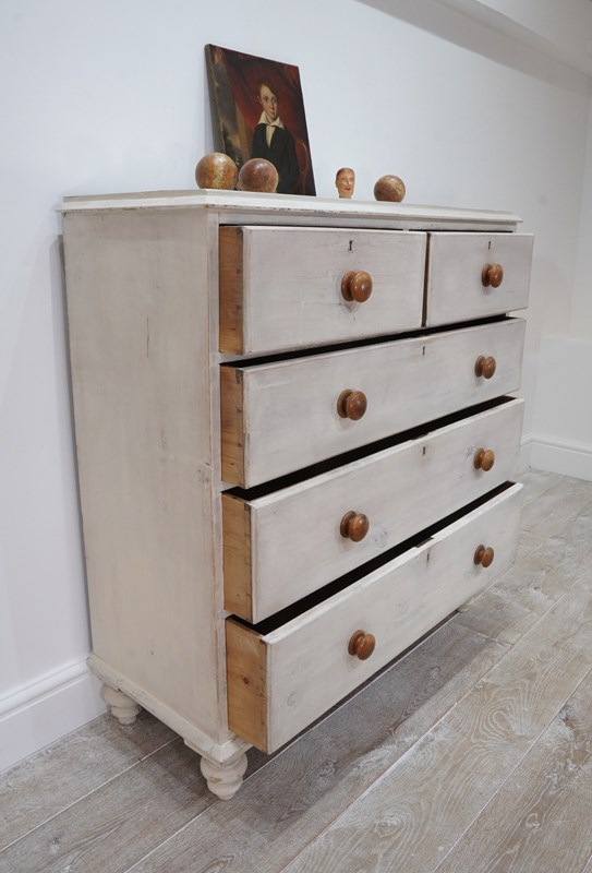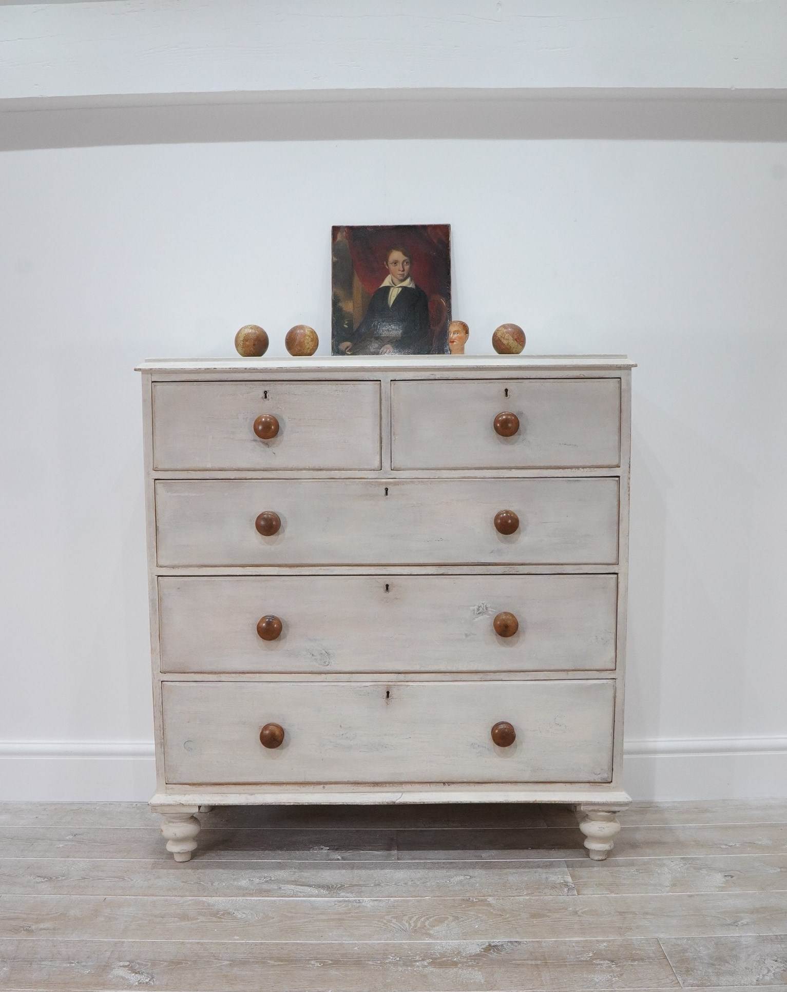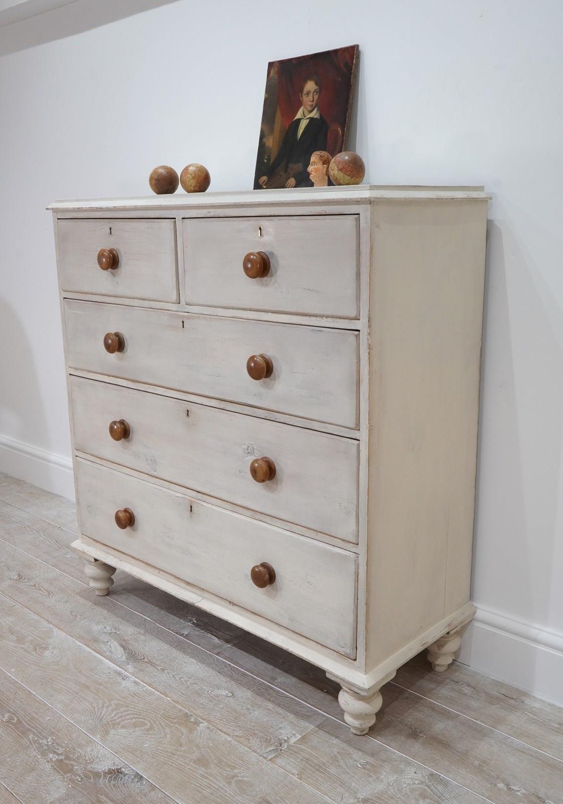 A substantial Victorian pine chest of drawers in washed down cream paint standing on four shapely turned feet. This charismatic chest holds two short drawers above three longer. Each of the five drawers have retained their beautiful boxwood handles highlighting an already impressive chest. They fit well and run with ease within the solid pine carcass. The chest has been thoroughly cleaned inside and out ready for immediate use within the home. A particularly good quality painted pine chest of drawers. England circa 1880.