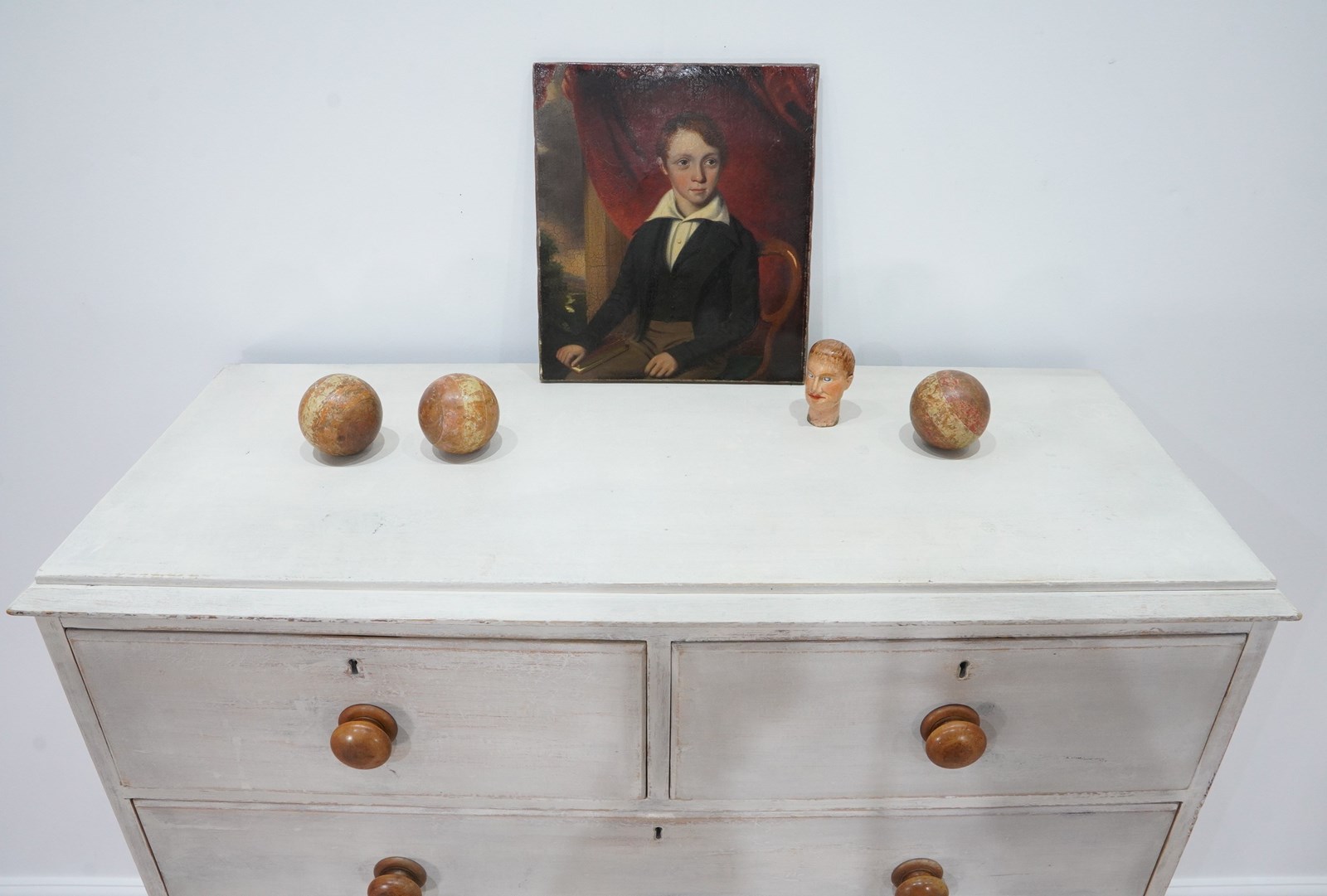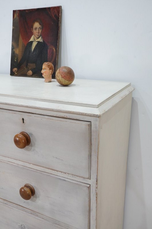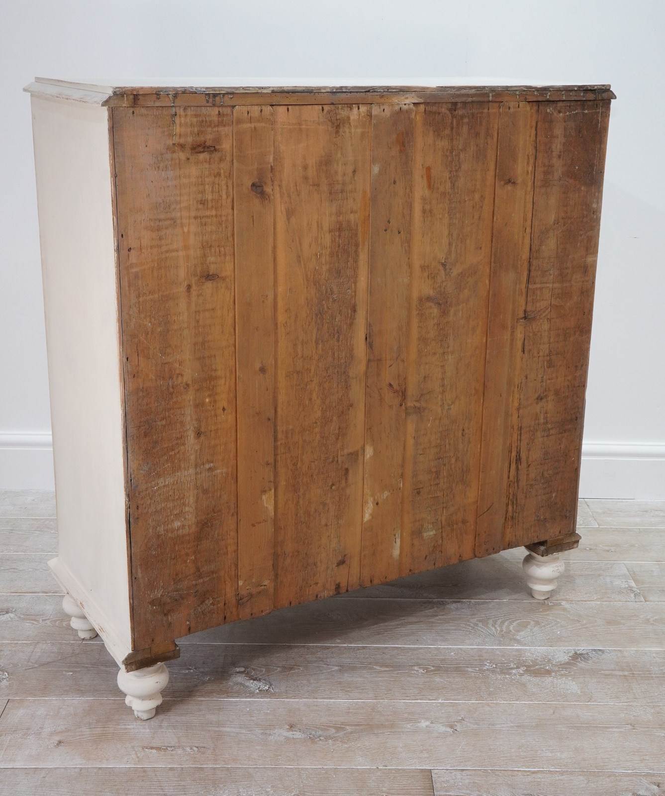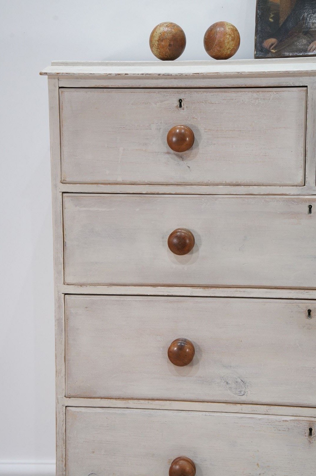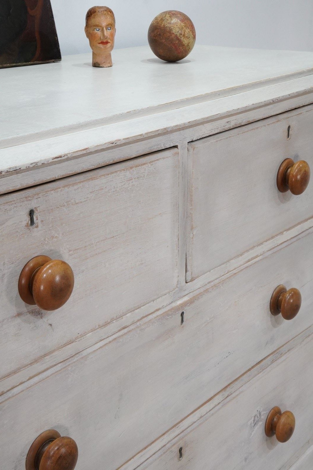 A substantial Victorian pine chest of drawers in washed down cream paint standing on four shapely turned feet. This charismatic chest holds two short drawers above three longer. Each of the five drawers have retained their beautiful boxwood handles highlighting an already impressive chest. They fit well and run with ease within the solid pine carcass. The chest has been thoroughly cleaned inside and out ready for immediate use within the home. A particularly good quality painted pine chest of drawers. England circa 1880.