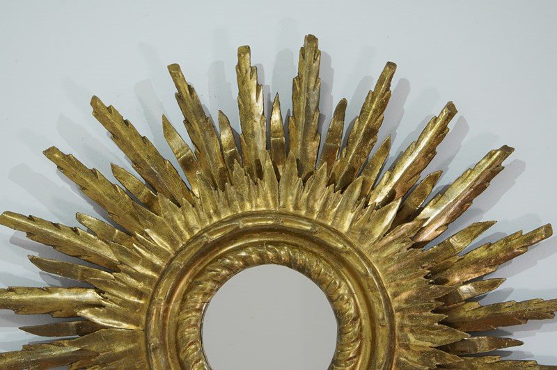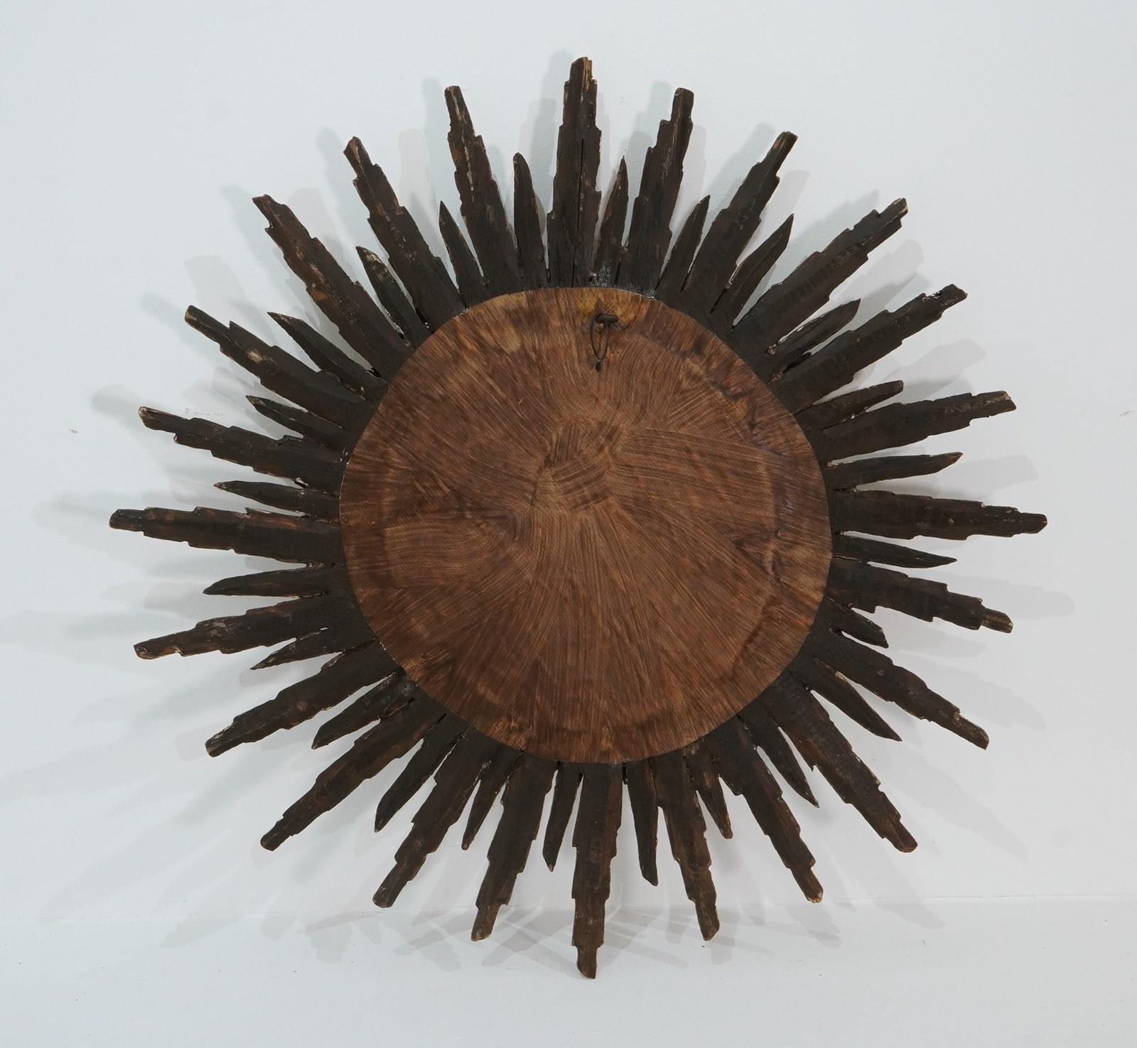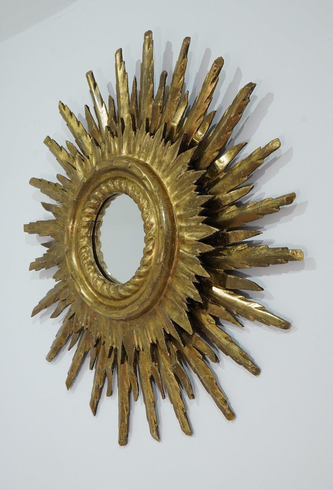 A large mid century sunburst mirror. This magnificent sunburst is arranged over two tiers and has developed the most glorious colour and patina over the past near century. The shining rays boast a blend of gold and bronze with natural even wear creating a wonderfully atmospheric surface. Superb sound condition. Double wooden sunburst mirror. Circa 1950.