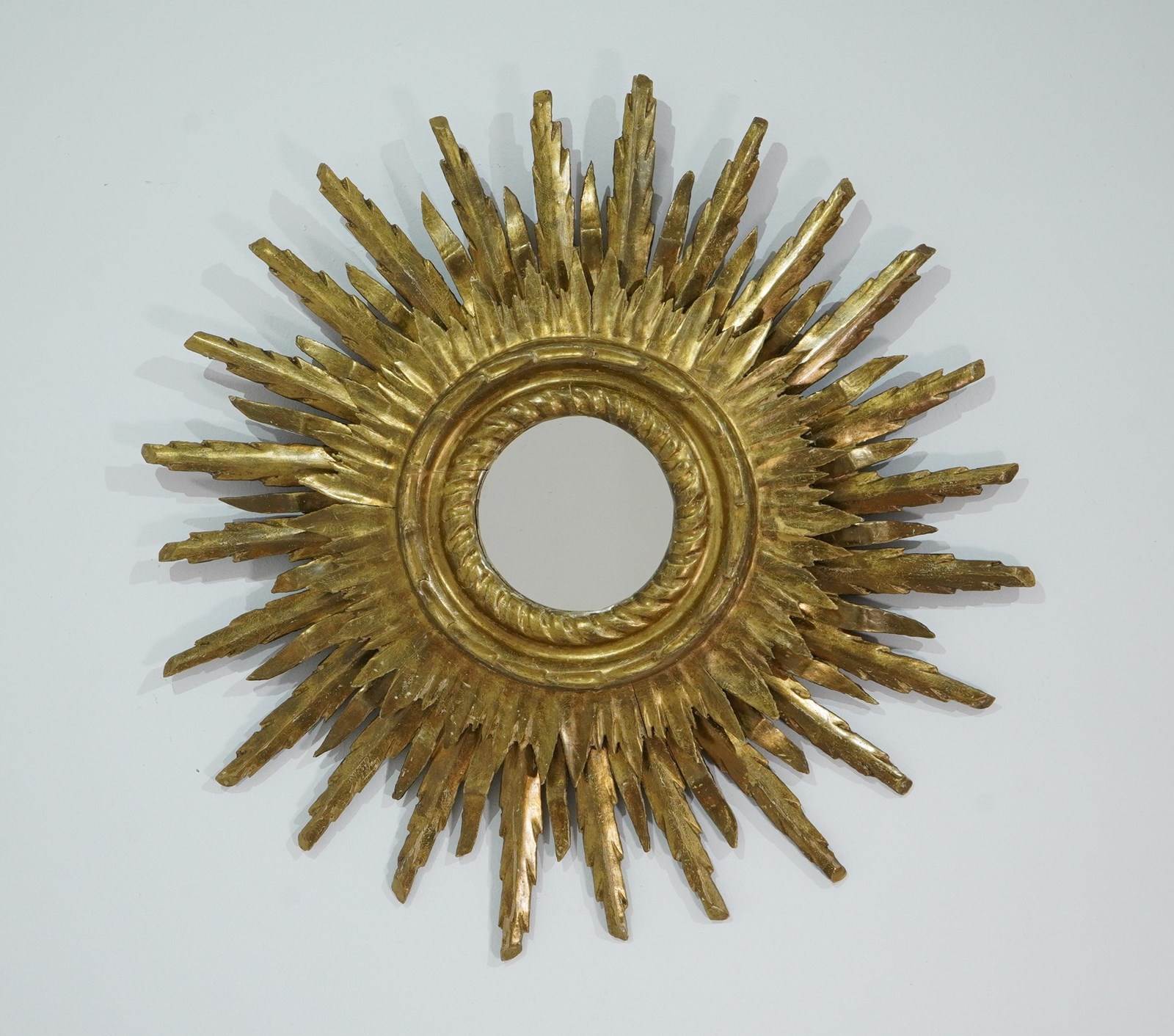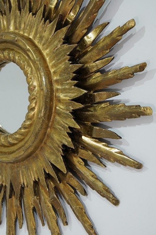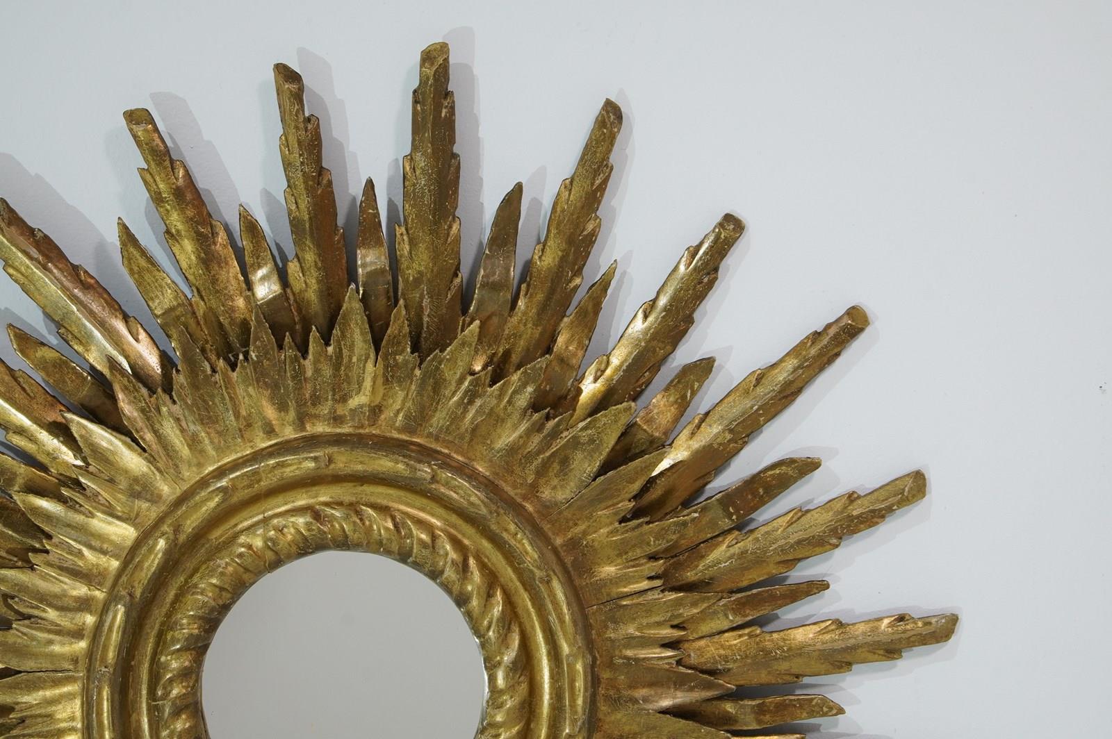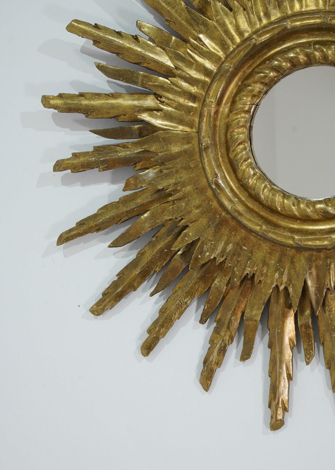 A large mid century sunburst mirror. This magnificent sunburst is arranged over two tiers and has developed the most glorious colour and patina over the past near century. The shining rays boast a blend of gold and bronze with natural even wear creating a wonderfully atmospheric surface. Superb sound condition. Double wooden sunburst mirror. Circa 1950.