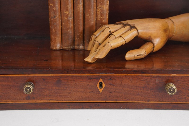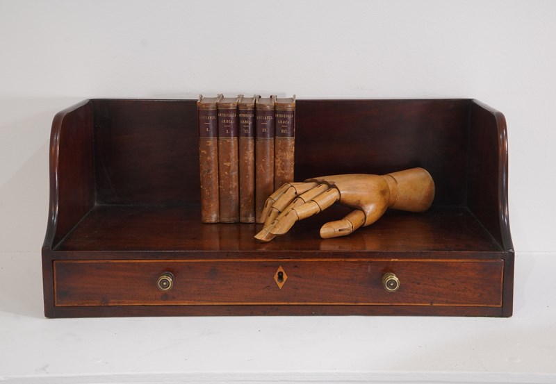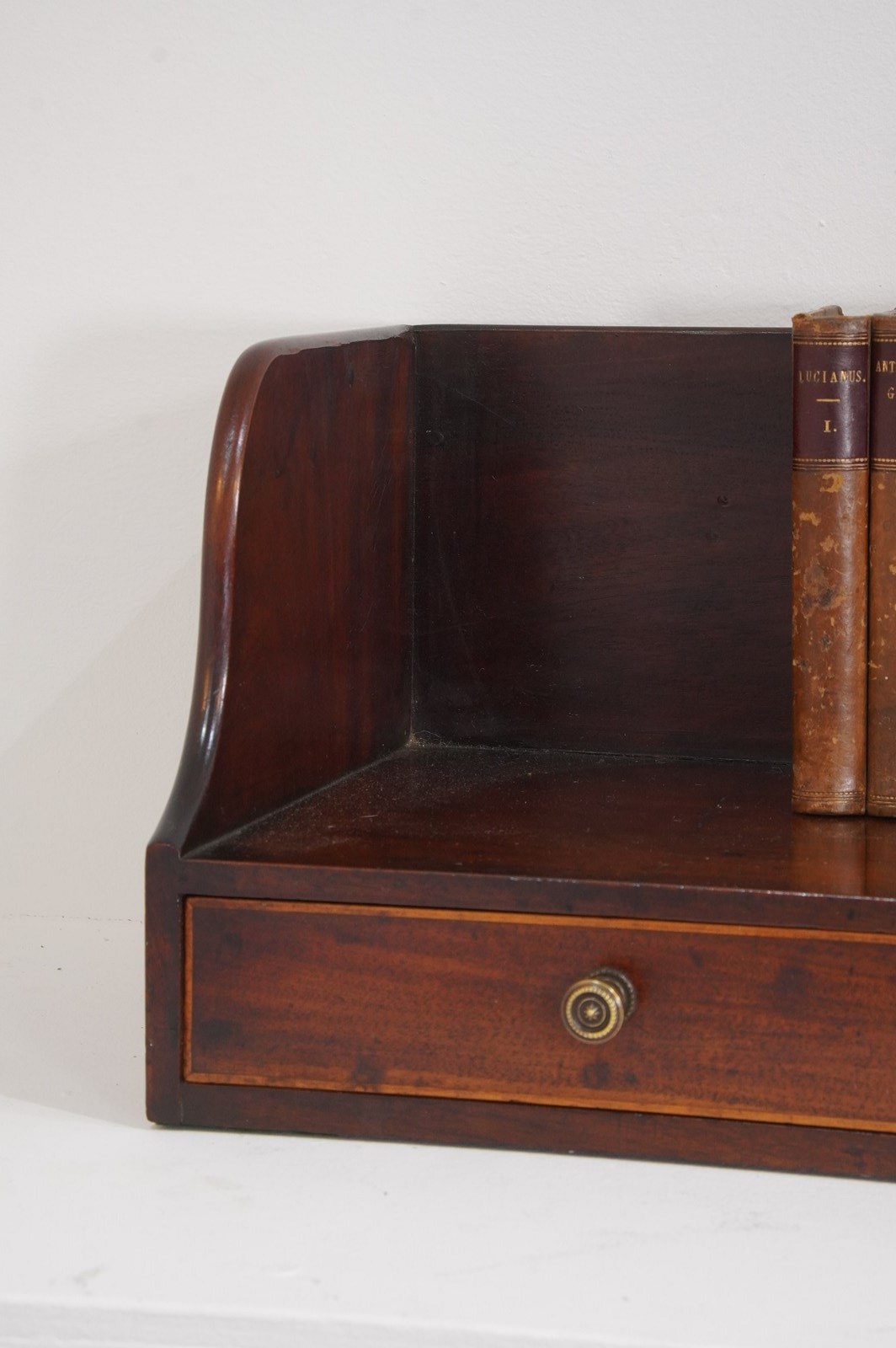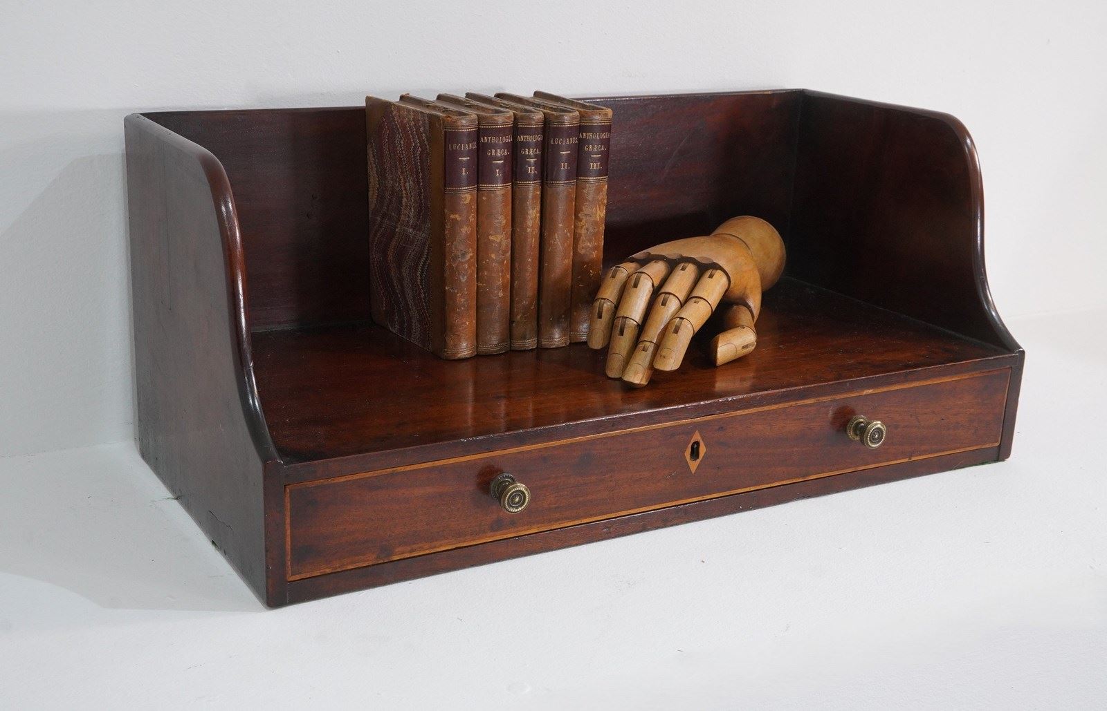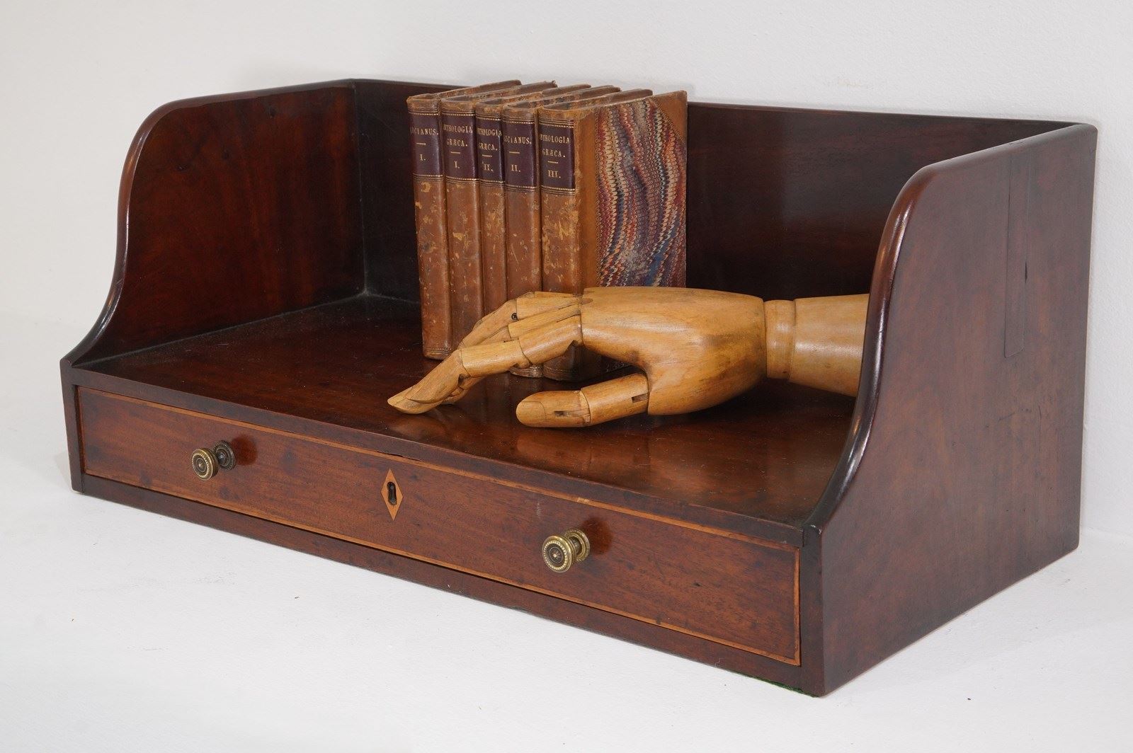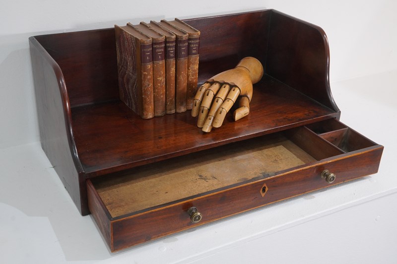 An English Regency mahogany book stand. A smart desk top book stand with the added advantage of a neat slim drawer below with double inkwell compartment complete with obligatory ink stains!
