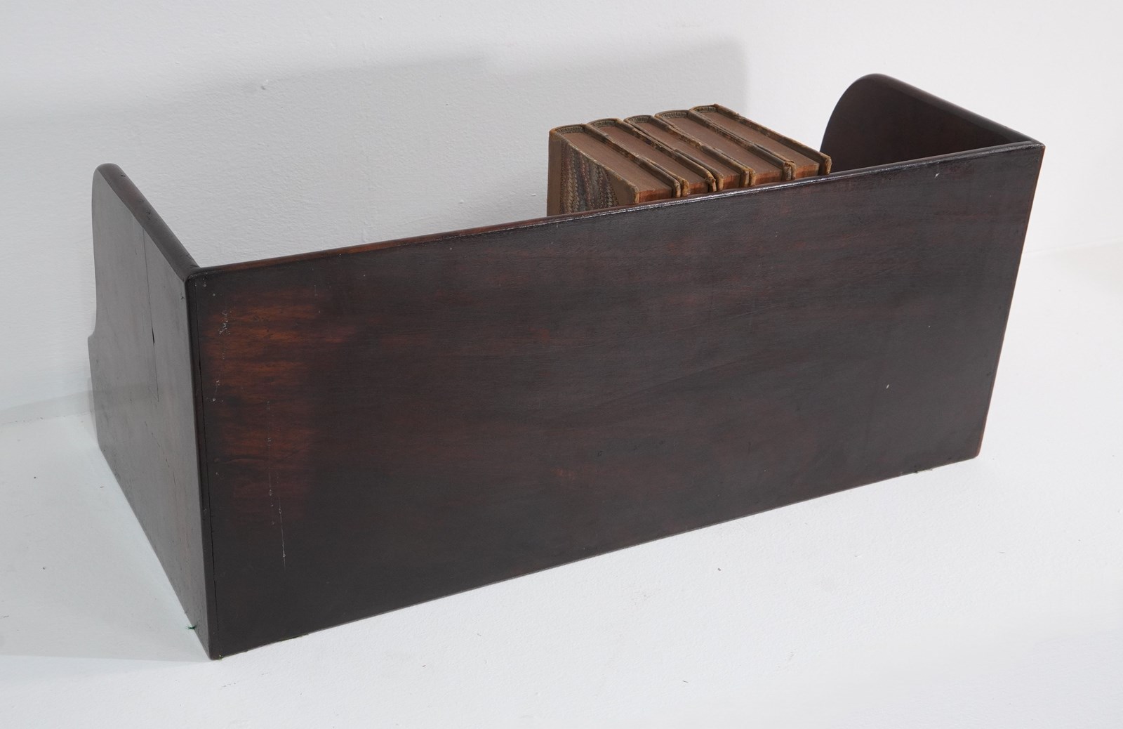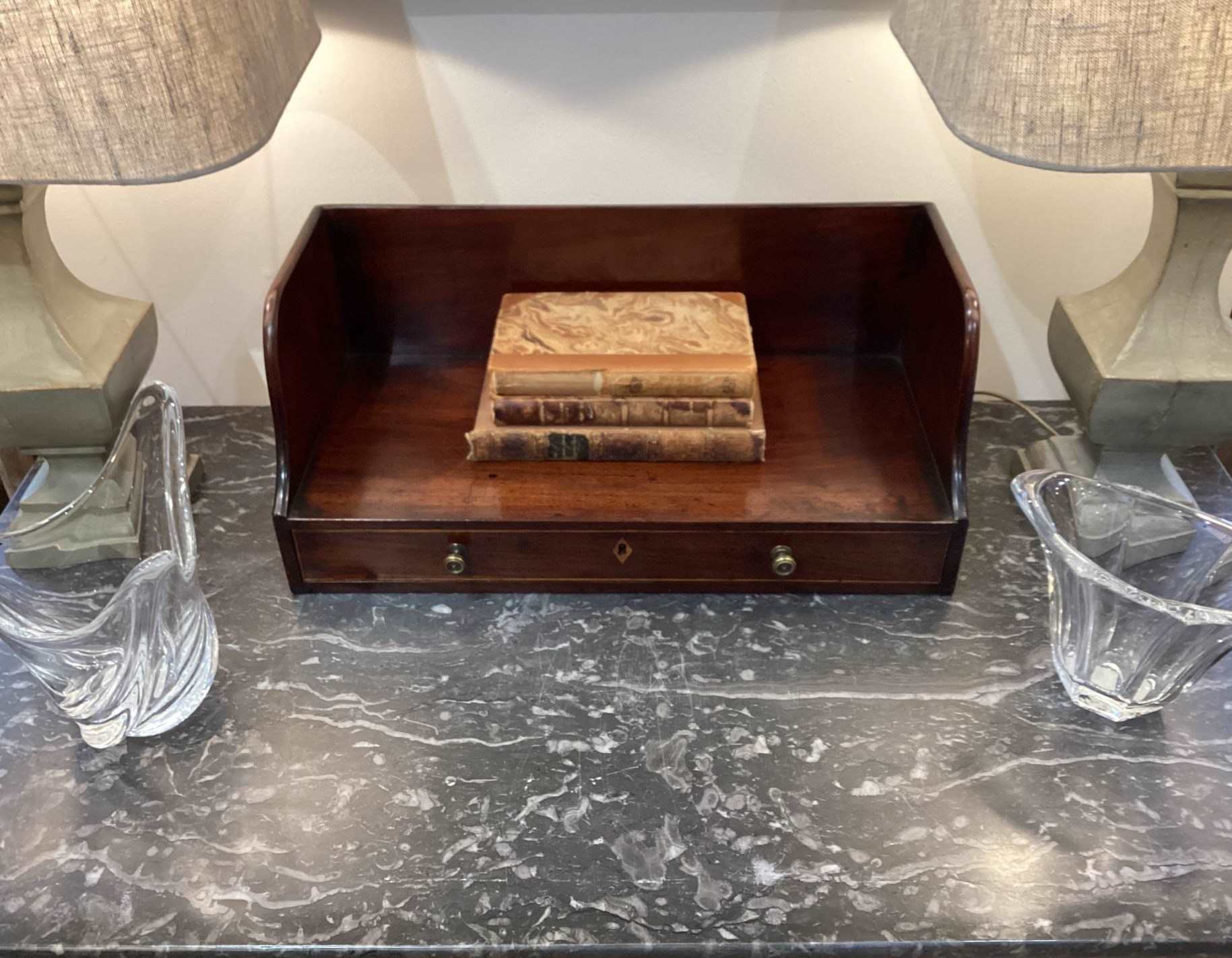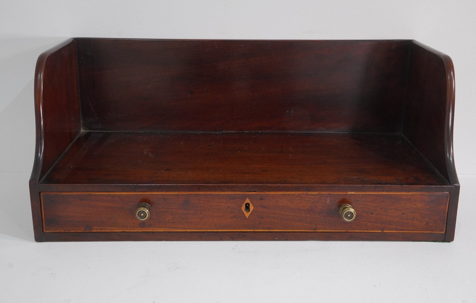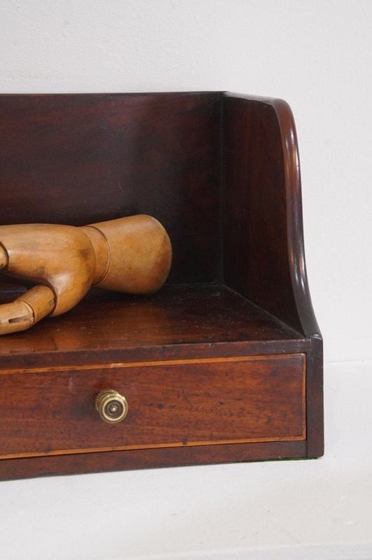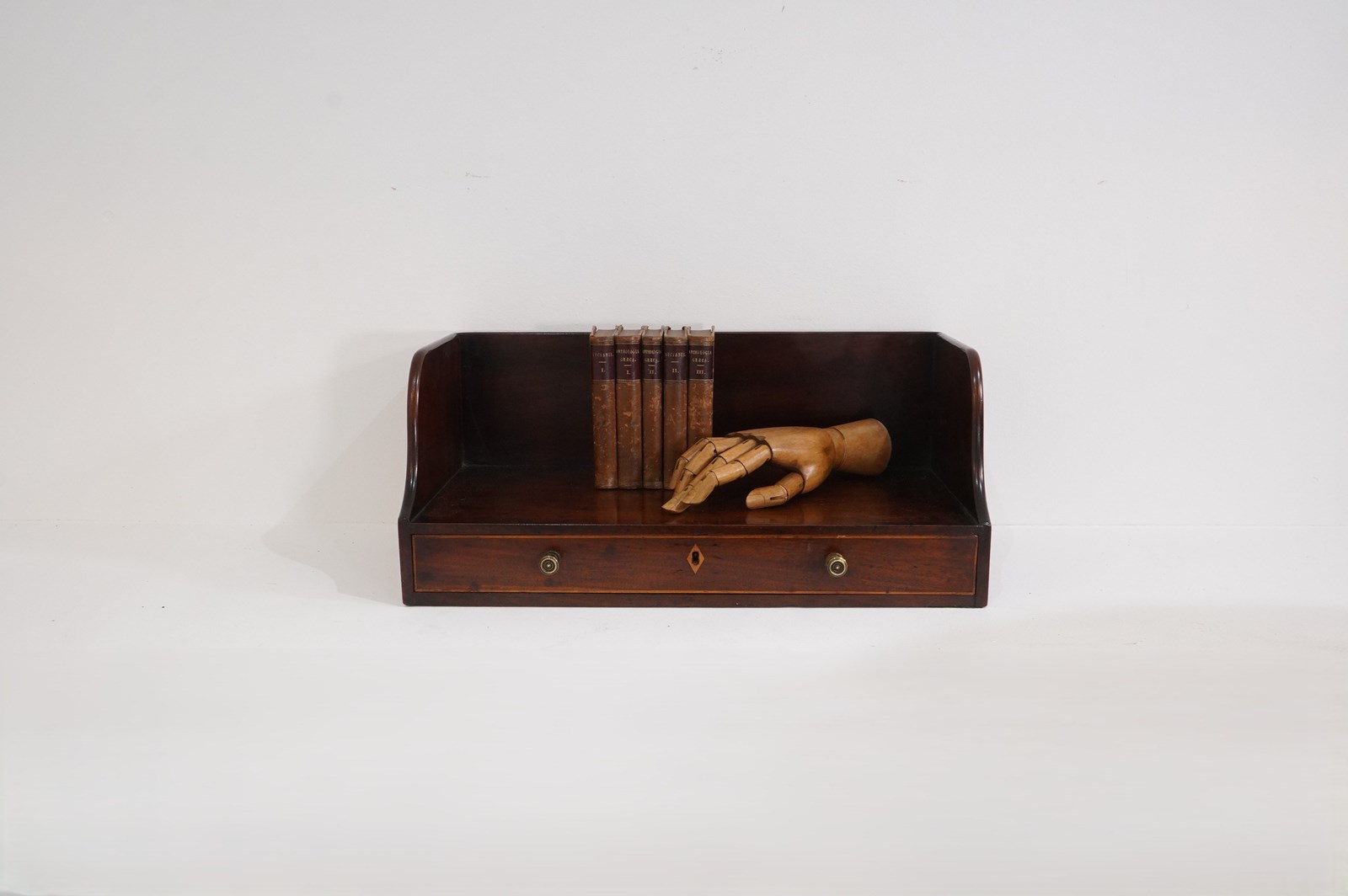 An English Regency mahogany book stand. A smart desk top book stand with the added advantage of a neat slim drawer below with double inkwell compartment complete with obligatory ink stains!