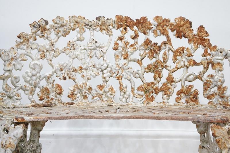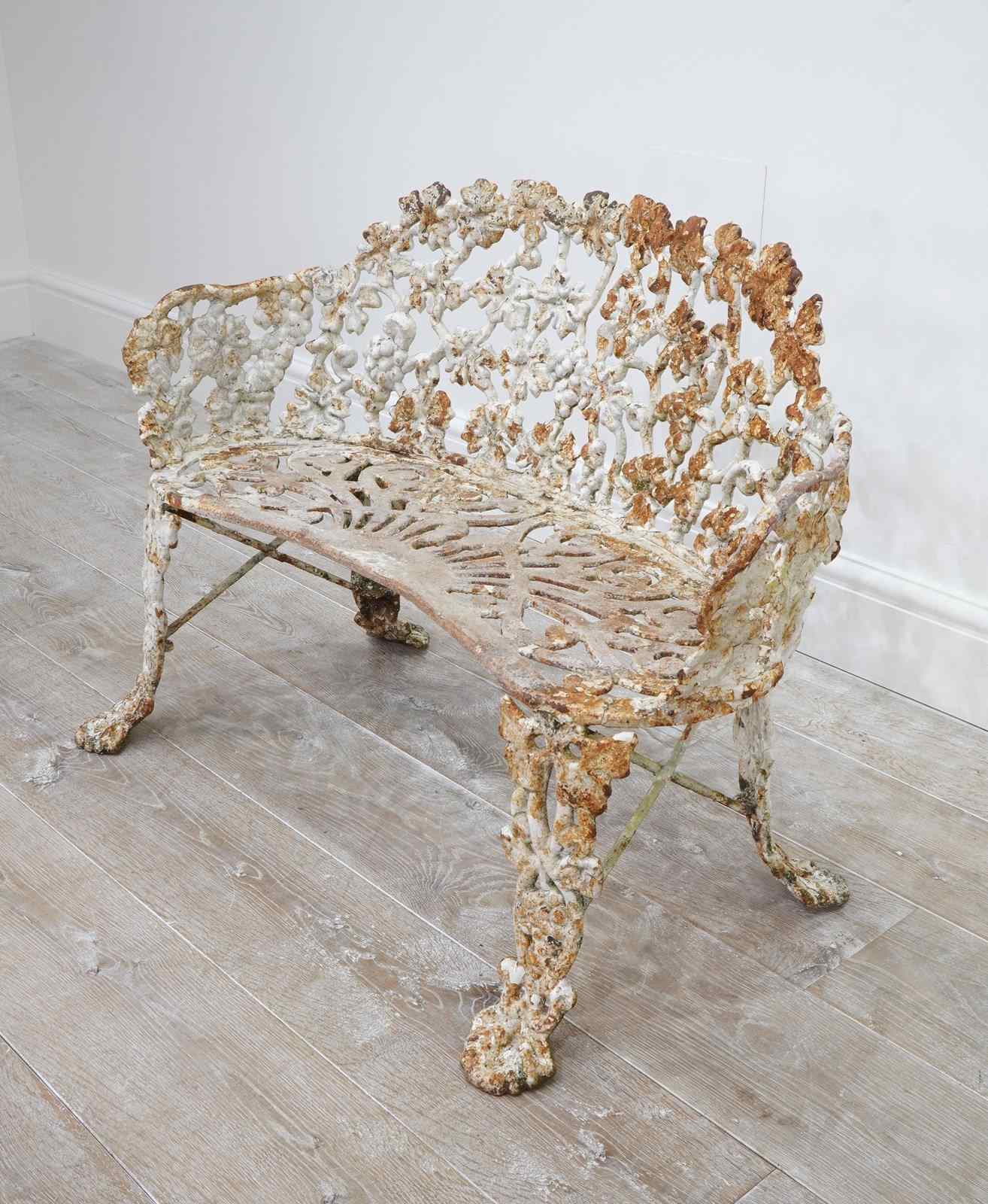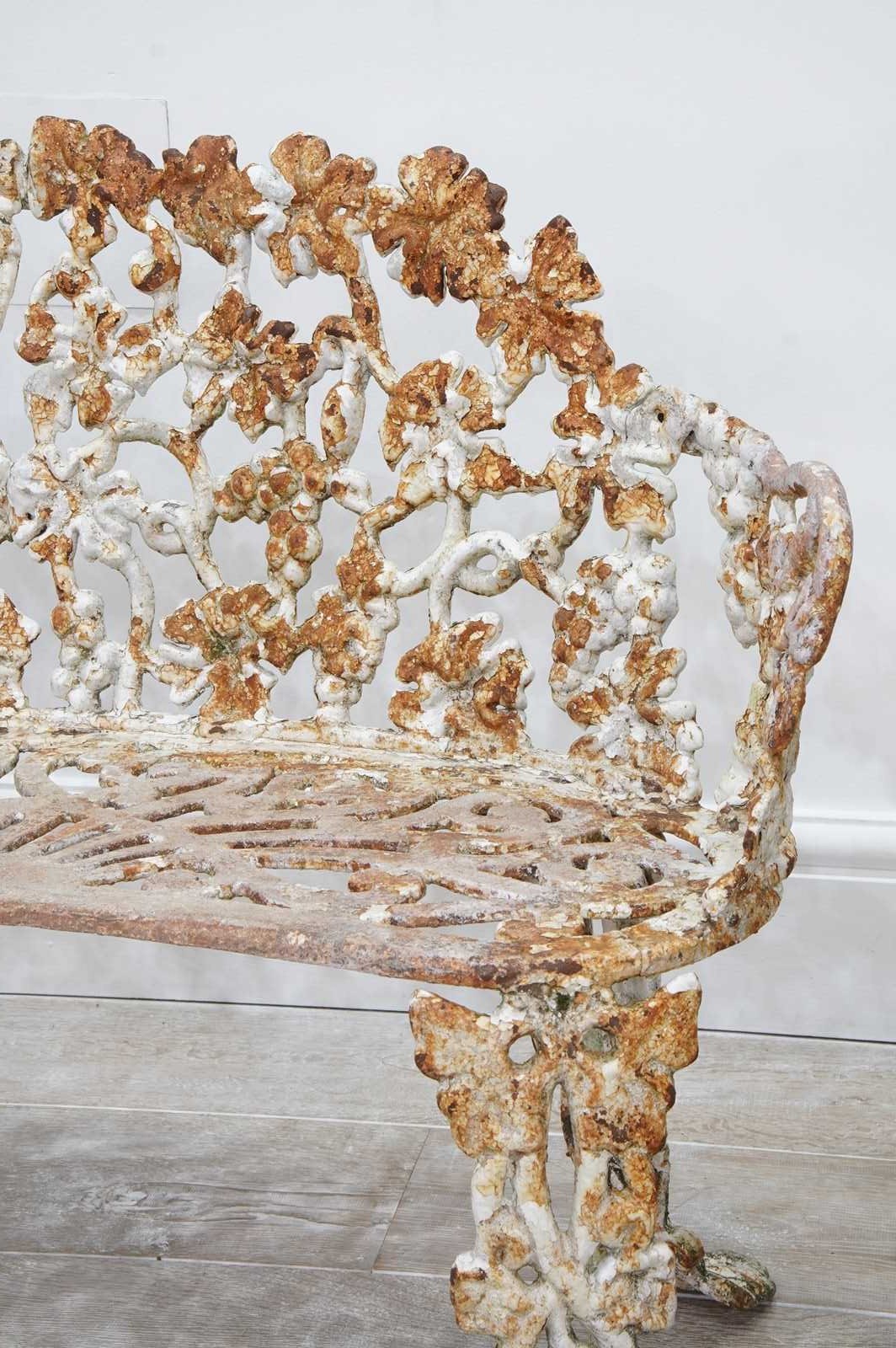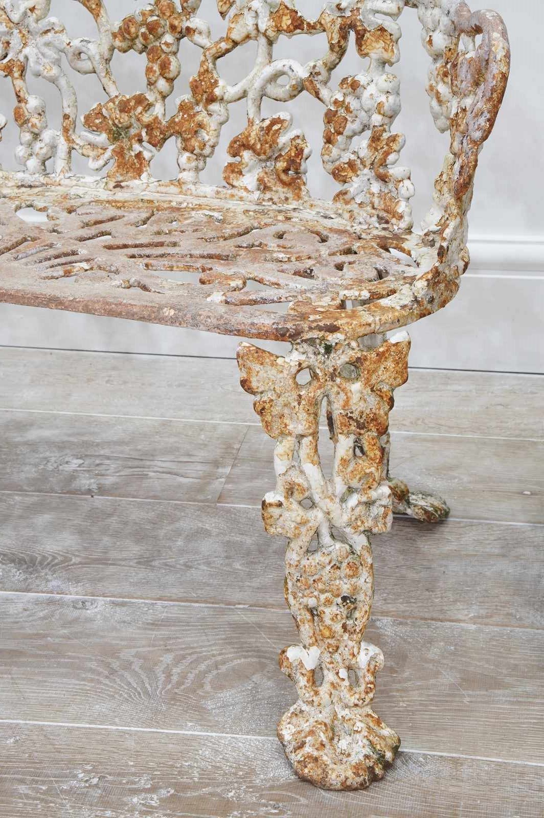 A late 19th century heavy gauge cast iron bench of the sweetest proportions. The back and sides to this pretty bench have a gentle curve and are designed with entwining bunches of grapes and leaves on vine all in the original old paint now worn and faded creating a wonderfully atmospheric surface. The same decorative detail is repeated on the front and back legs. The curved seat has heavy open fretwork detail with remains of old paint. An extremely decorative heavy quality English garden bench with no wobbles, breaks or repairs.