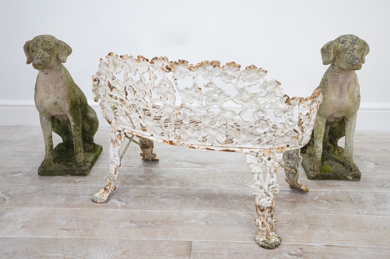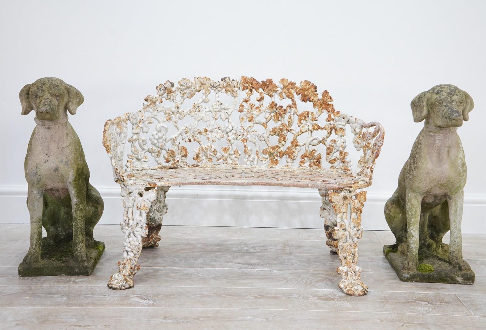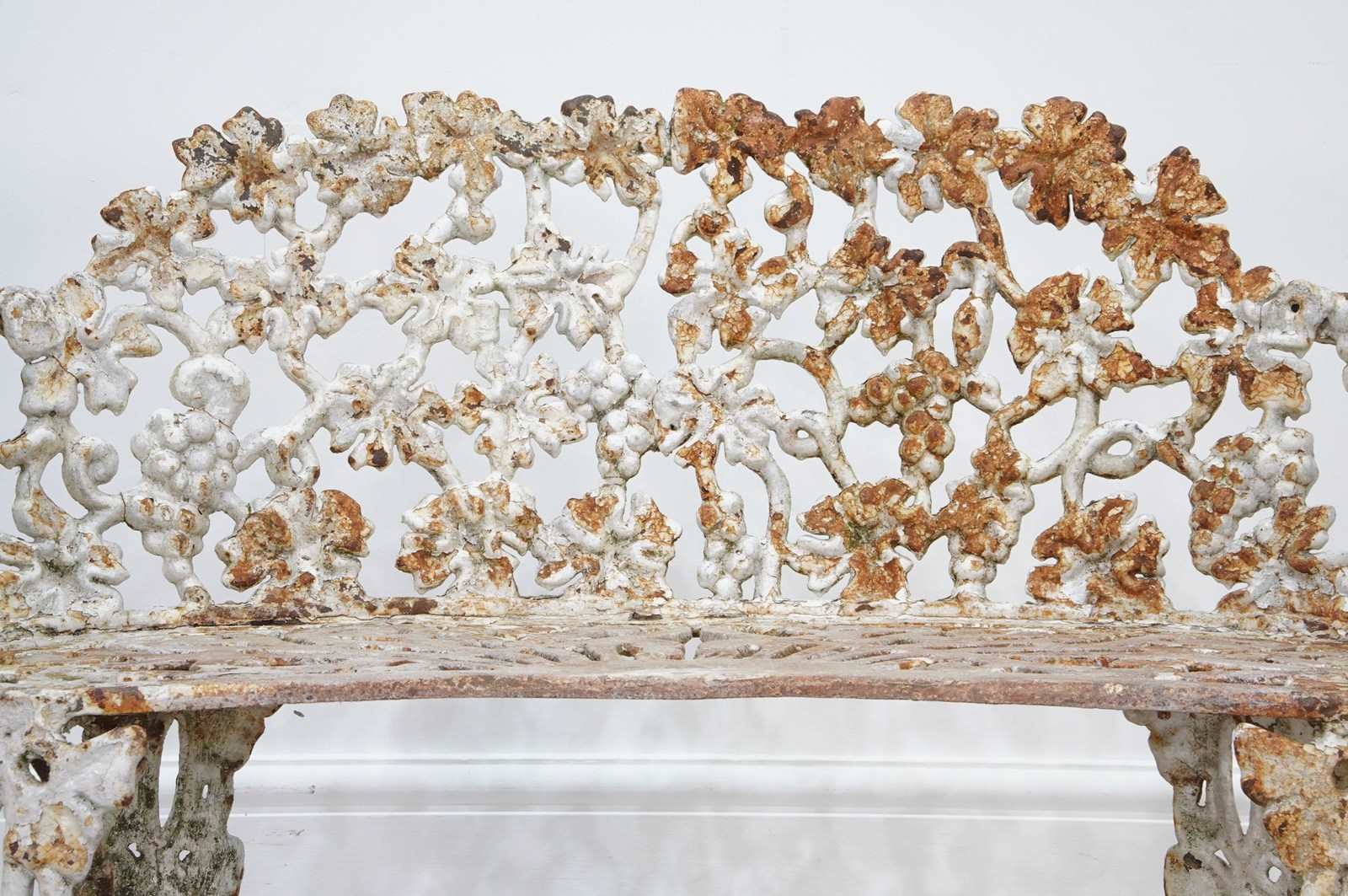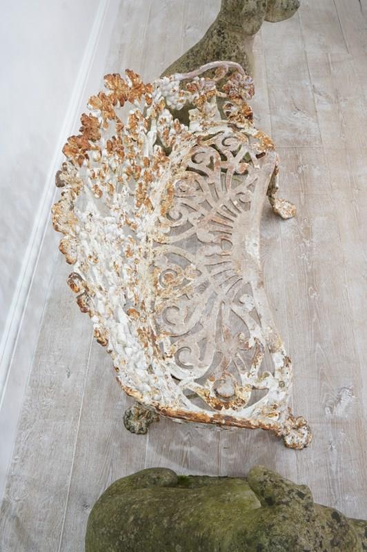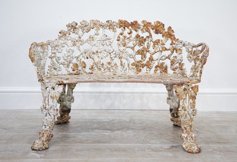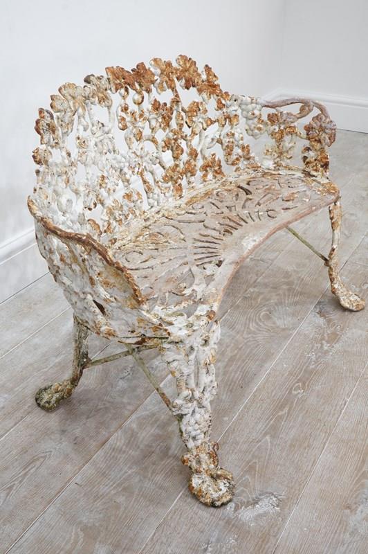 A late 19th century heavy gauge cast iron bench of the sweetest proportions. The back and sides to this pretty bench have a gentle curve and are designed with entwining bunches of grapes and leaves on vine all in the original old paint now worn and faded creating a wonderfully atmospheric surface. The same decorative detail is repeated on the front and back legs. The curved seat has heavy open fretwork detail with remains of old paint. An extremely decorative heavy quality English garden bench with no wobbles, breaks or repairs.