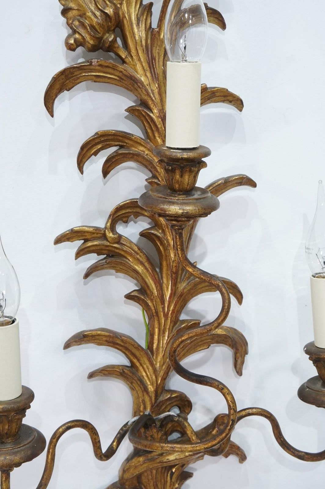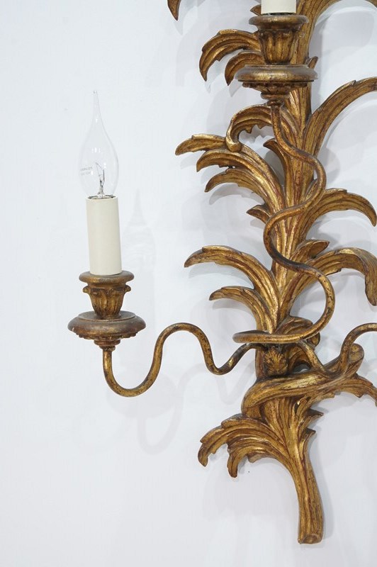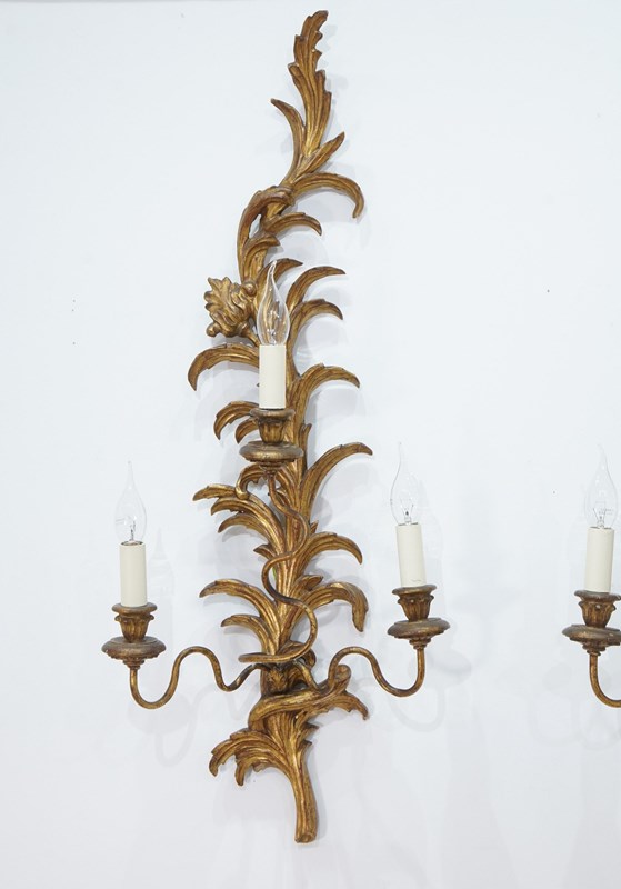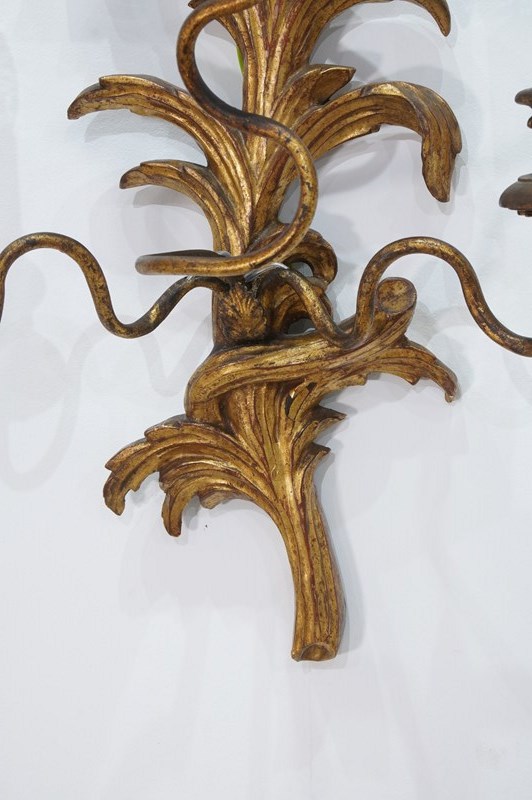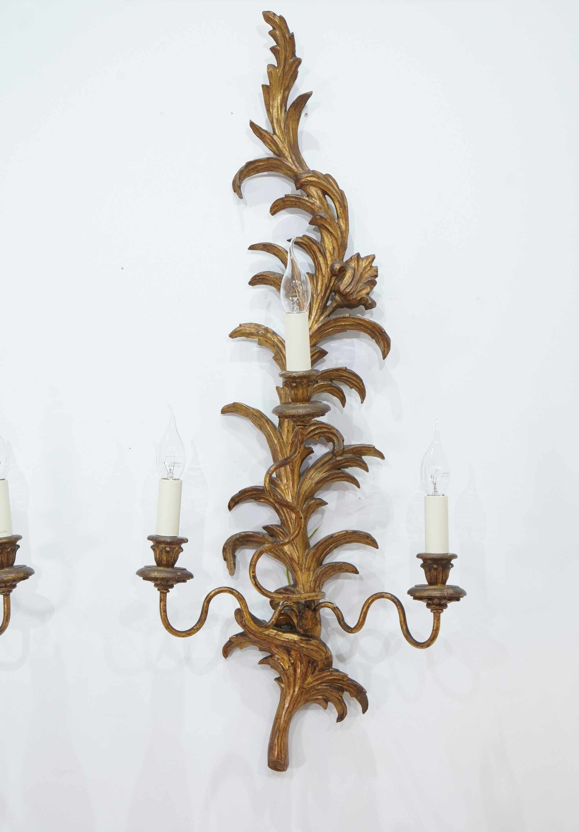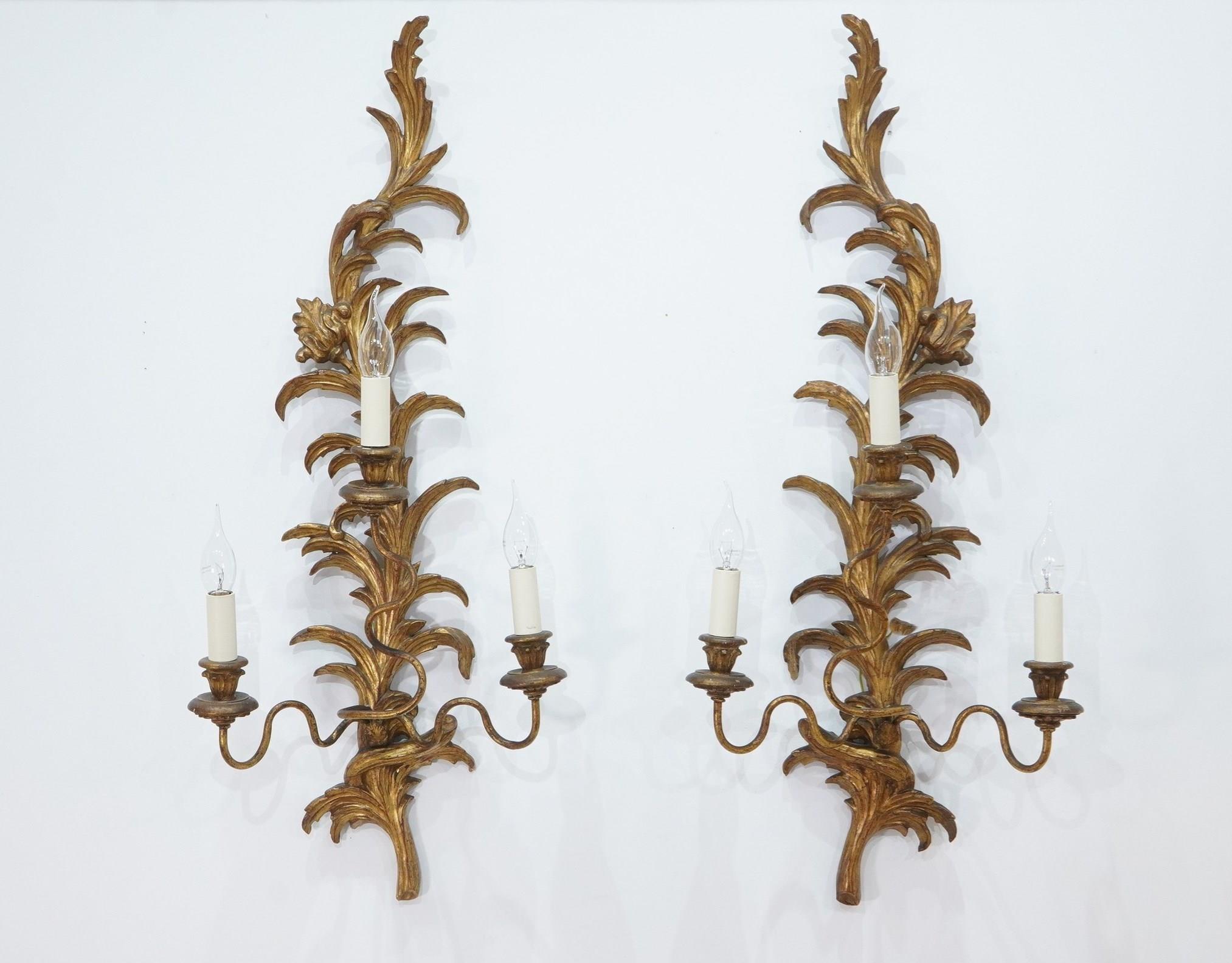 A decorative pair of mid century three branch wall sconces. The tall backs to these pretty sconces represent climbing, curving leaves and single flower head. They each support Three outstretched swirling branches terminating with wooden candle holders together with faux cream card candle fittings. Carved gilt wood wall sconces newly wired, safety tested ready for immediate installation. Italy circa 1950.