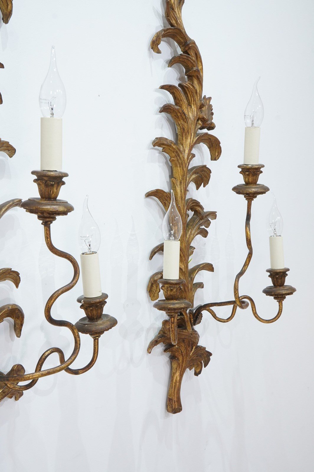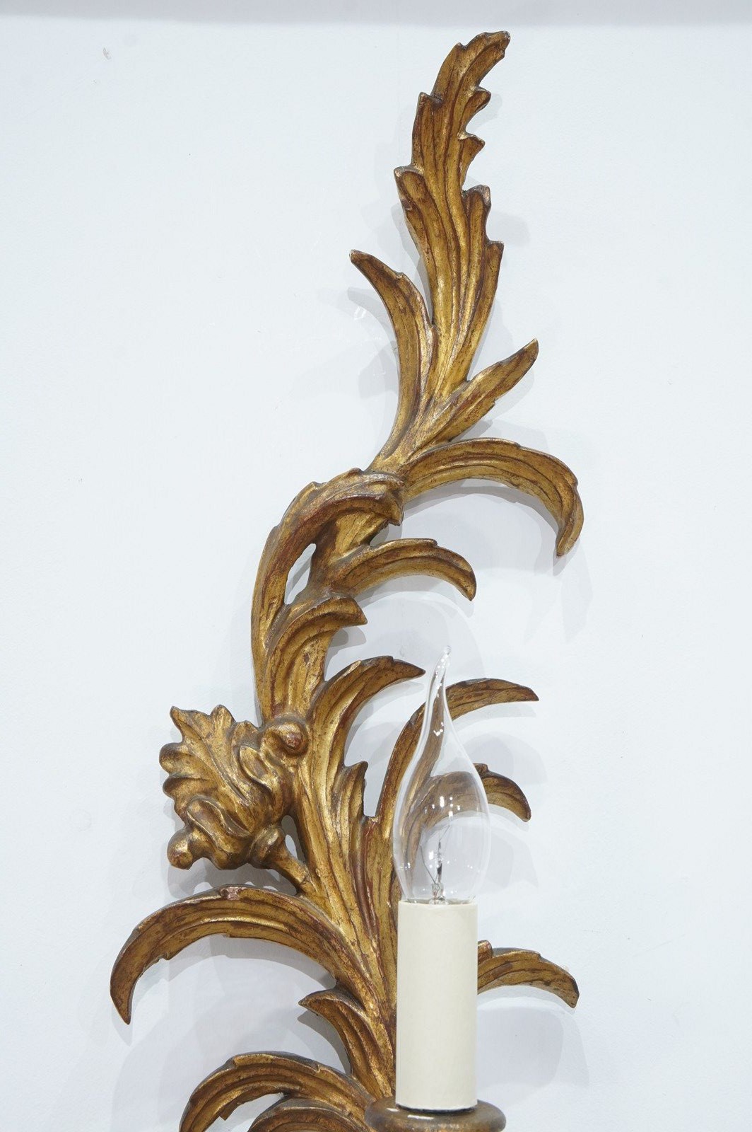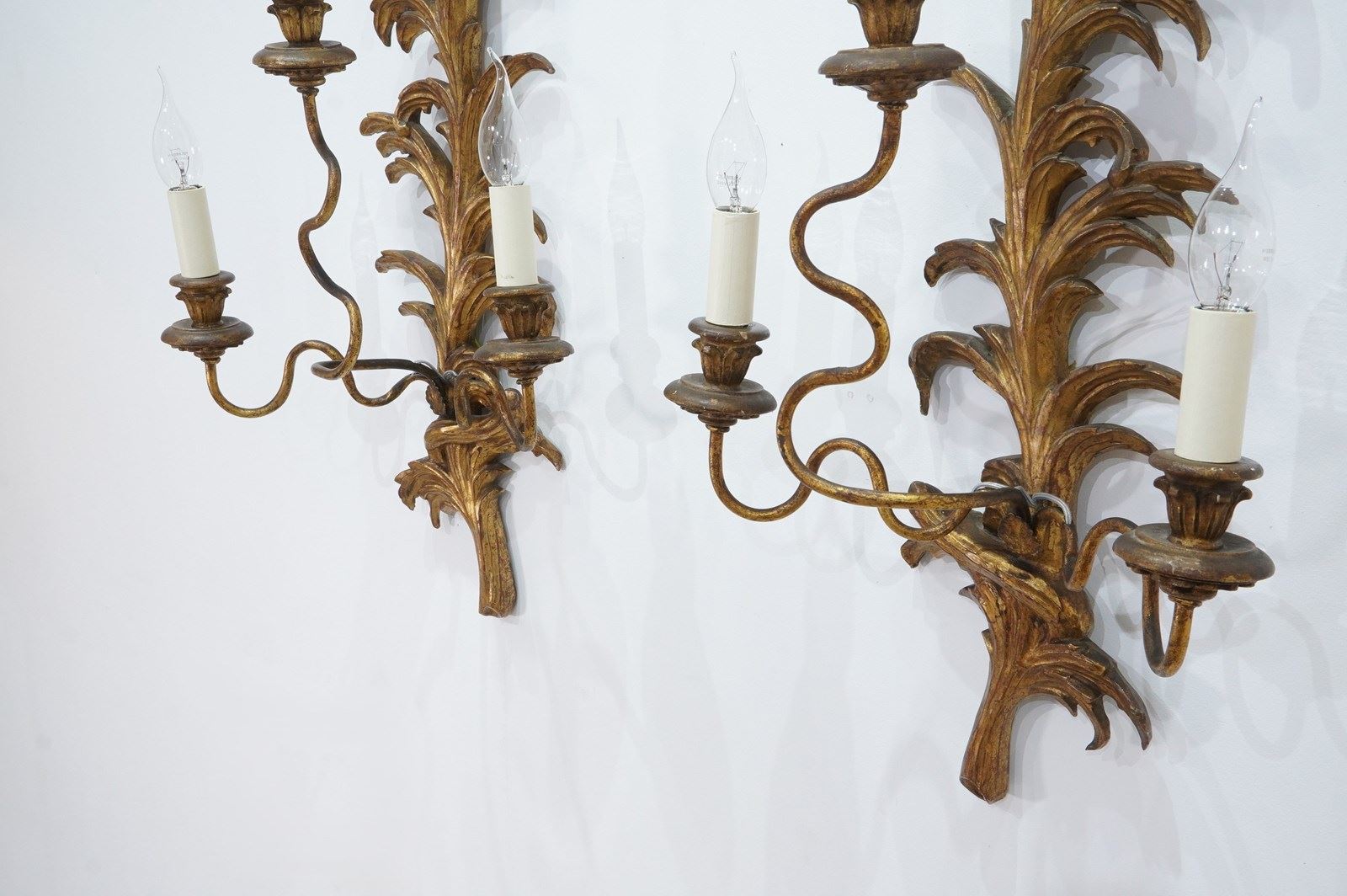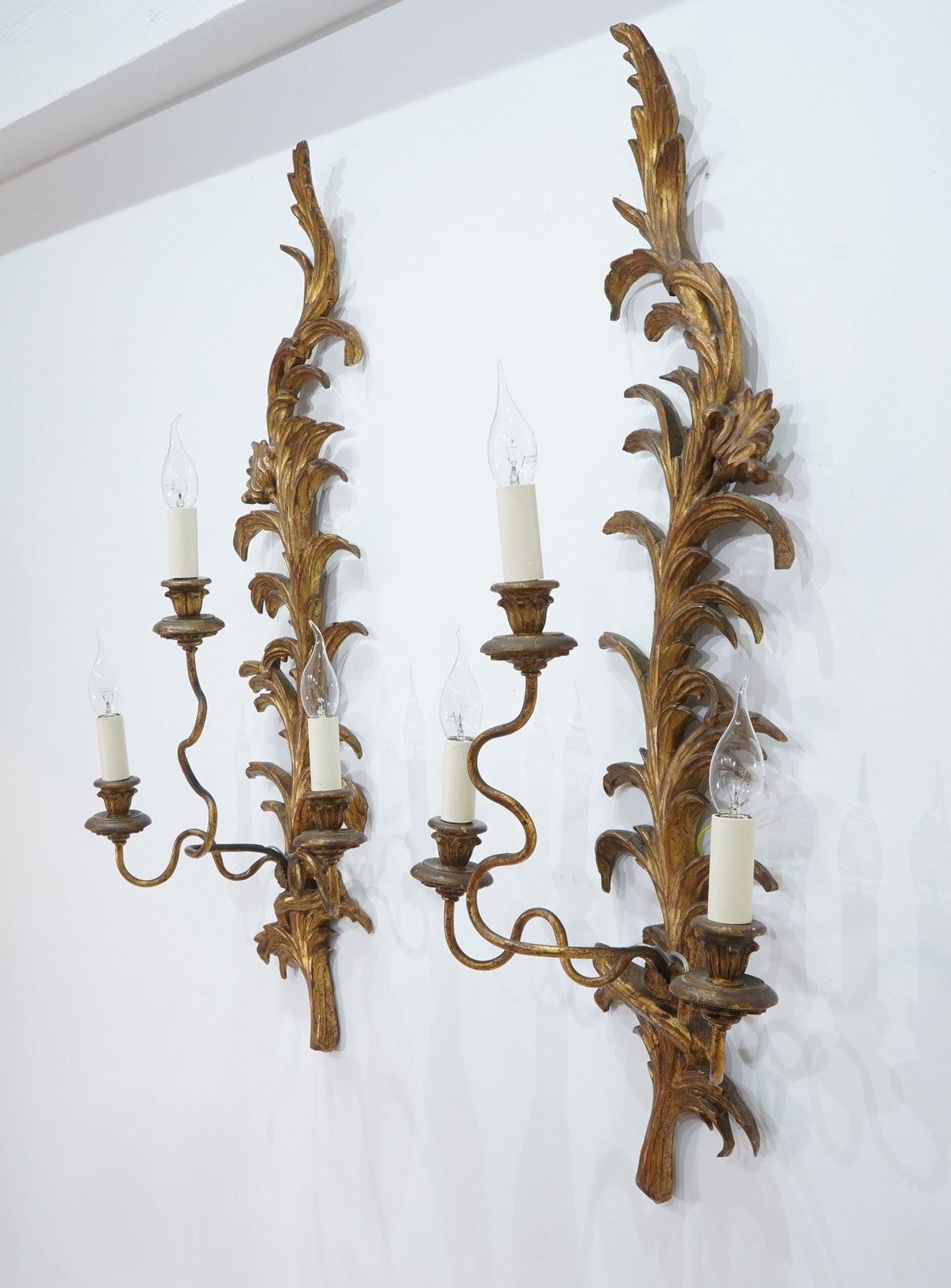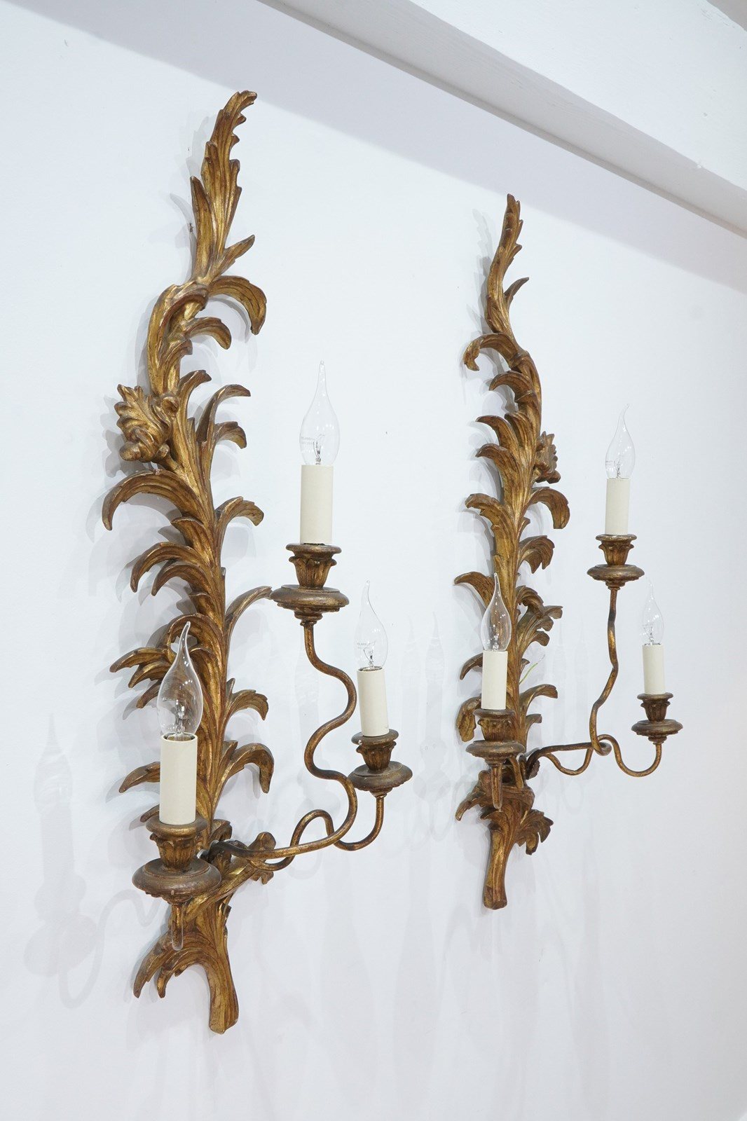A decorative pair of mid century three branch wall sconces. The tall backs to these pretty sconces represent climbing, curving leaves and single flower head. They each support Three outstretched swirling branches terminating with wooden candle holders together with faux cream card candle fittings. Carved gilt wood wall sconces newly wired, safety tested ready for immediate installation. Italy circa 1950.